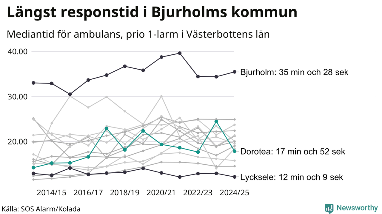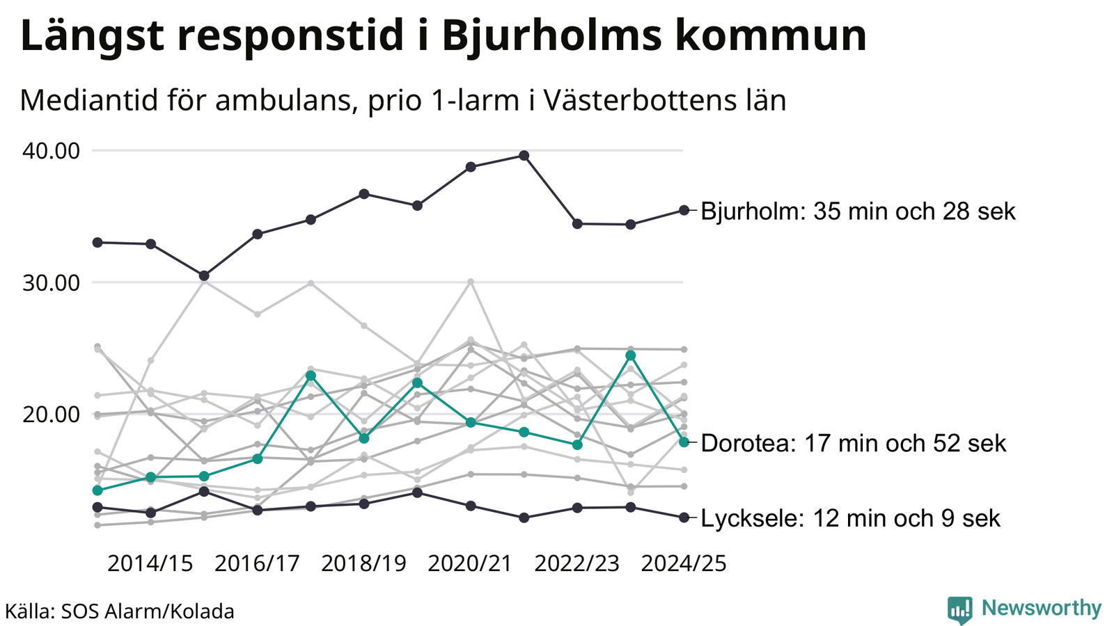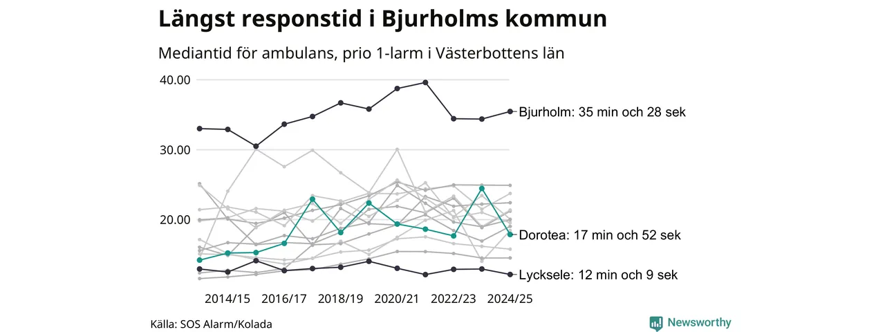Dorotea tillhör inte de kommuner i Region Västerbotten som får vänta längst på ambulans – men inte heller de som får snabbast hjälp. Längst är väntetiden i Bjurholms kommun, som också tillhör de tio kommuner i landet som får vänta längst på ambulans: 35 minuter och 28 sekunder. Snabbast var ambulansen framme i Lycksele, där det tog 12 minuter och 9 sekunder från larmsamtalet 2024/2025.