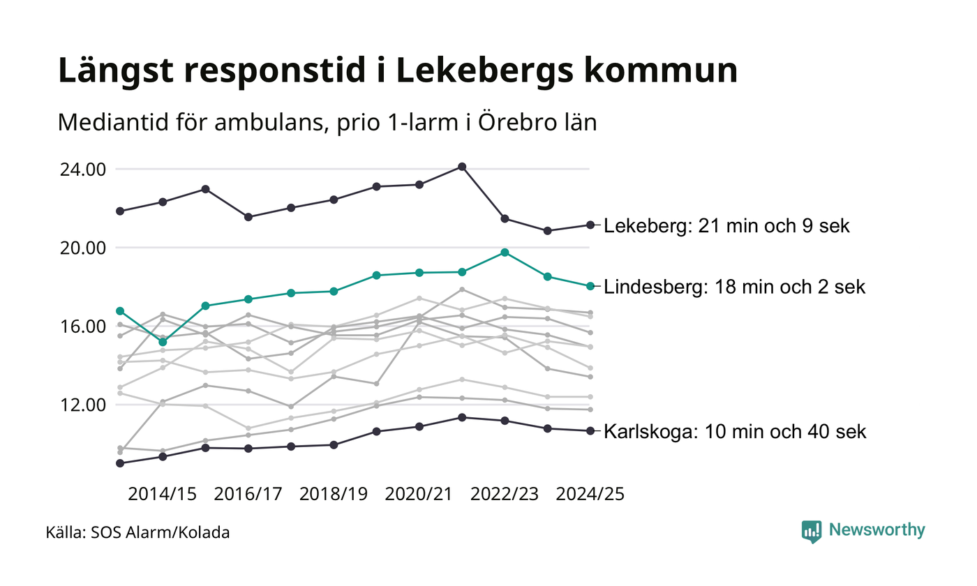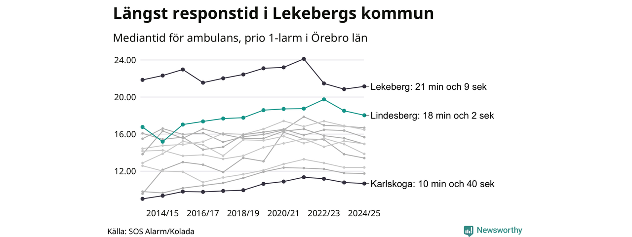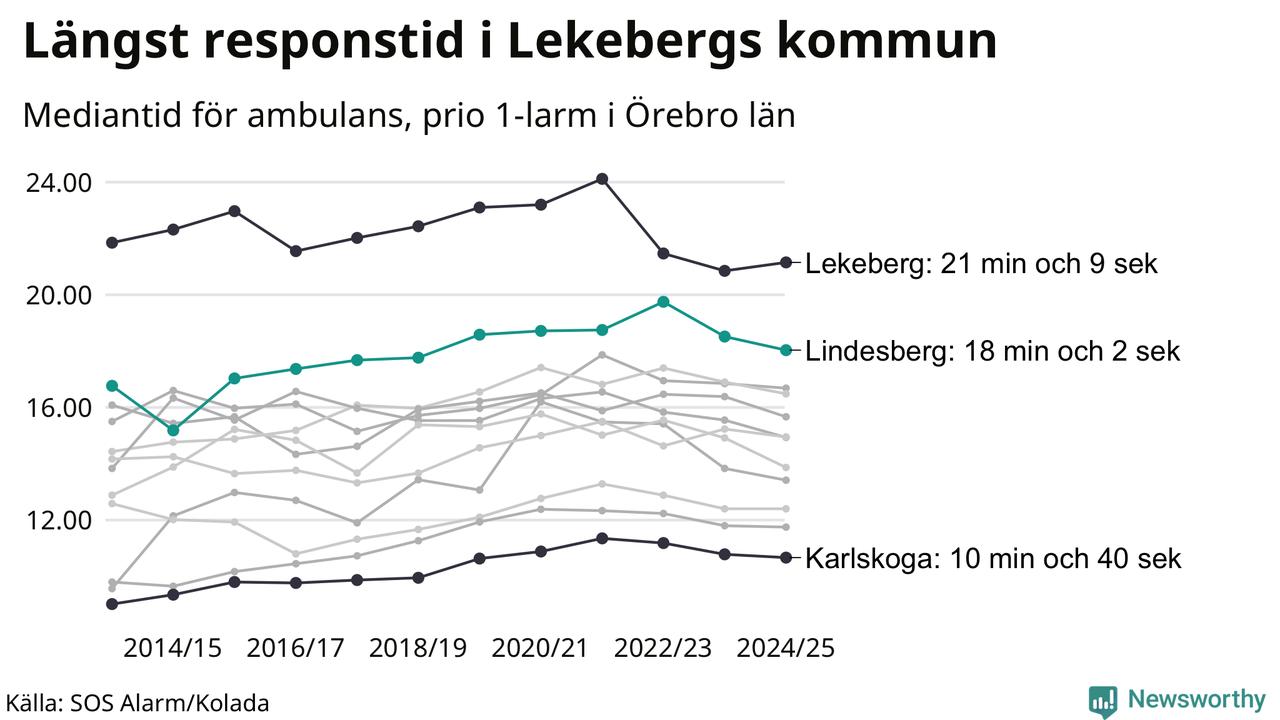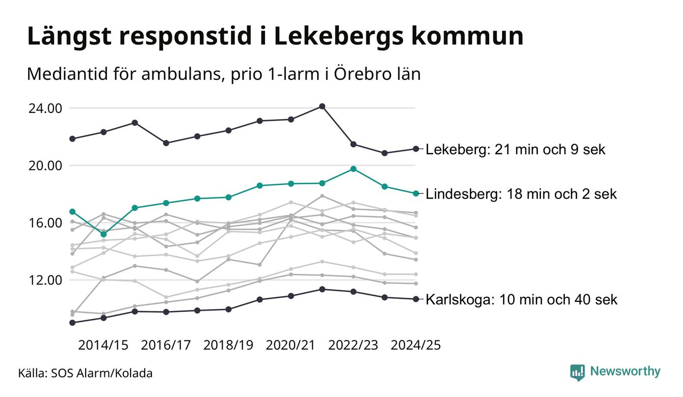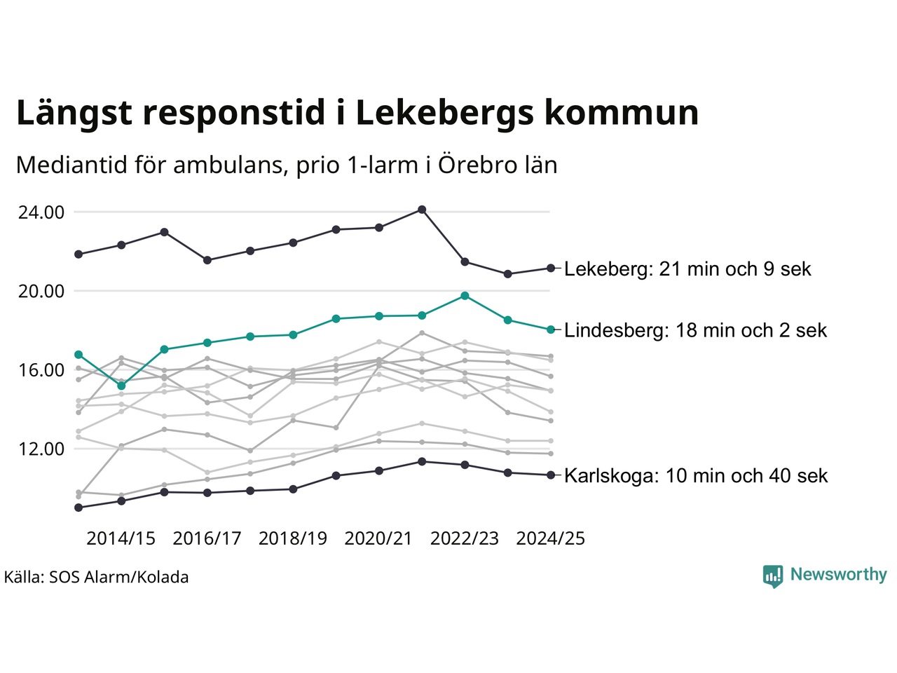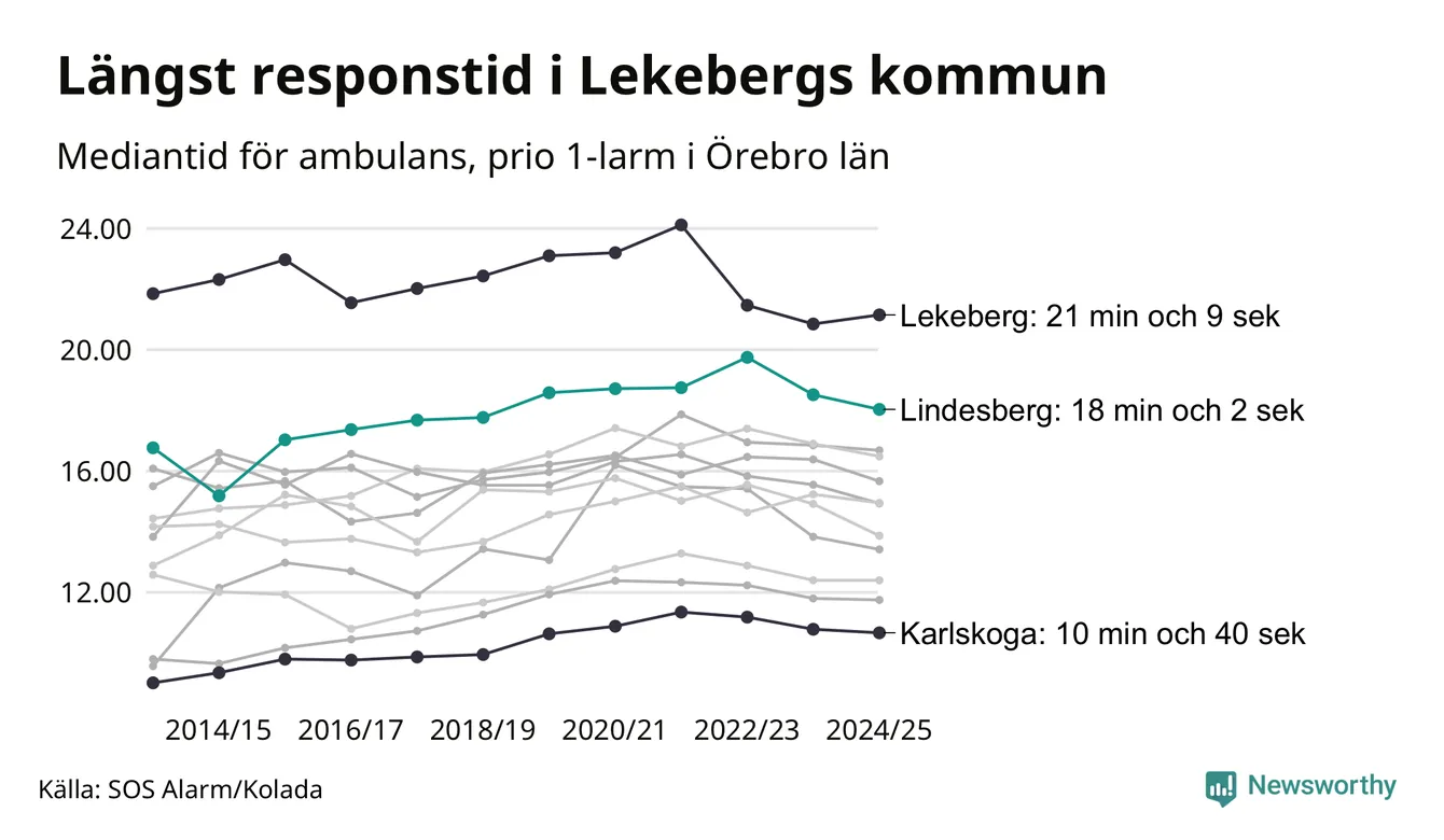 Det tar 18 minuter och 2 sekunder från att 112-samtalet når larmcentralen till att ambulansen är på plats i Lindesbergs kommun. Det visar de senaste siffrorna från SOS Alarm. Tiden är en mediantid för alla prio 1-larm mellan 1 juni 2024 och 31 maj 2025 och ett nyckeltal som redovisas varje år.