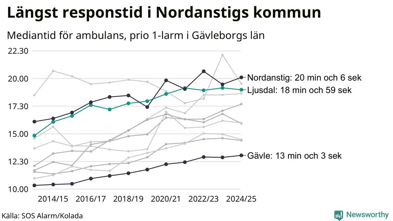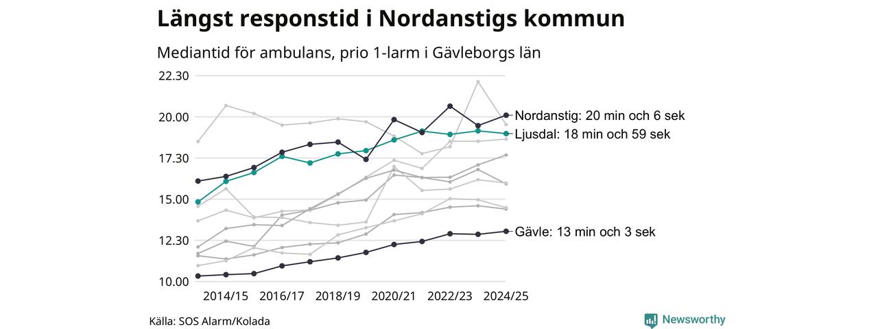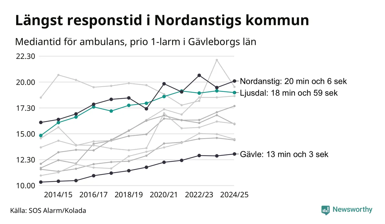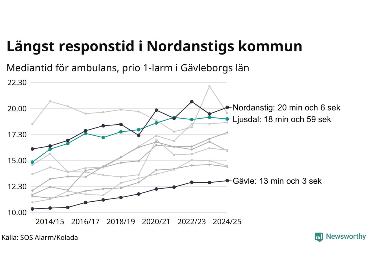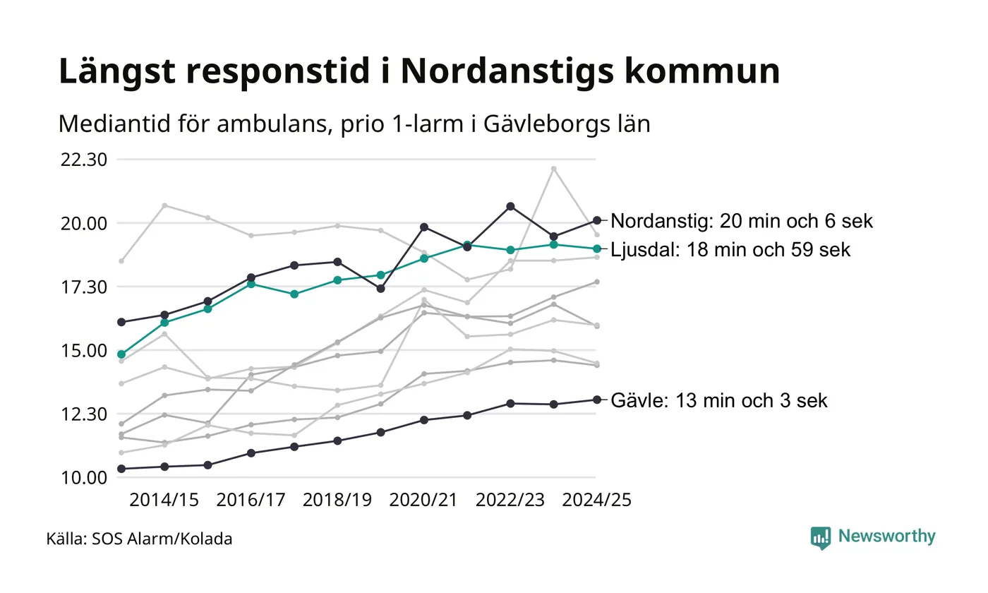 Det tar 18 minuter och 59 sekunder från att 112-samtalet når larmcentralen till att ambulansen är på plats i Ljusdals kommun. Det visar de senaste siffrorna från SOS Alarm. Tiden är en mediantid för alla prio 1-larm mellan 1 juni 2024 och 31 maj 2025 och ett nyckeltal som redovisas varje år.