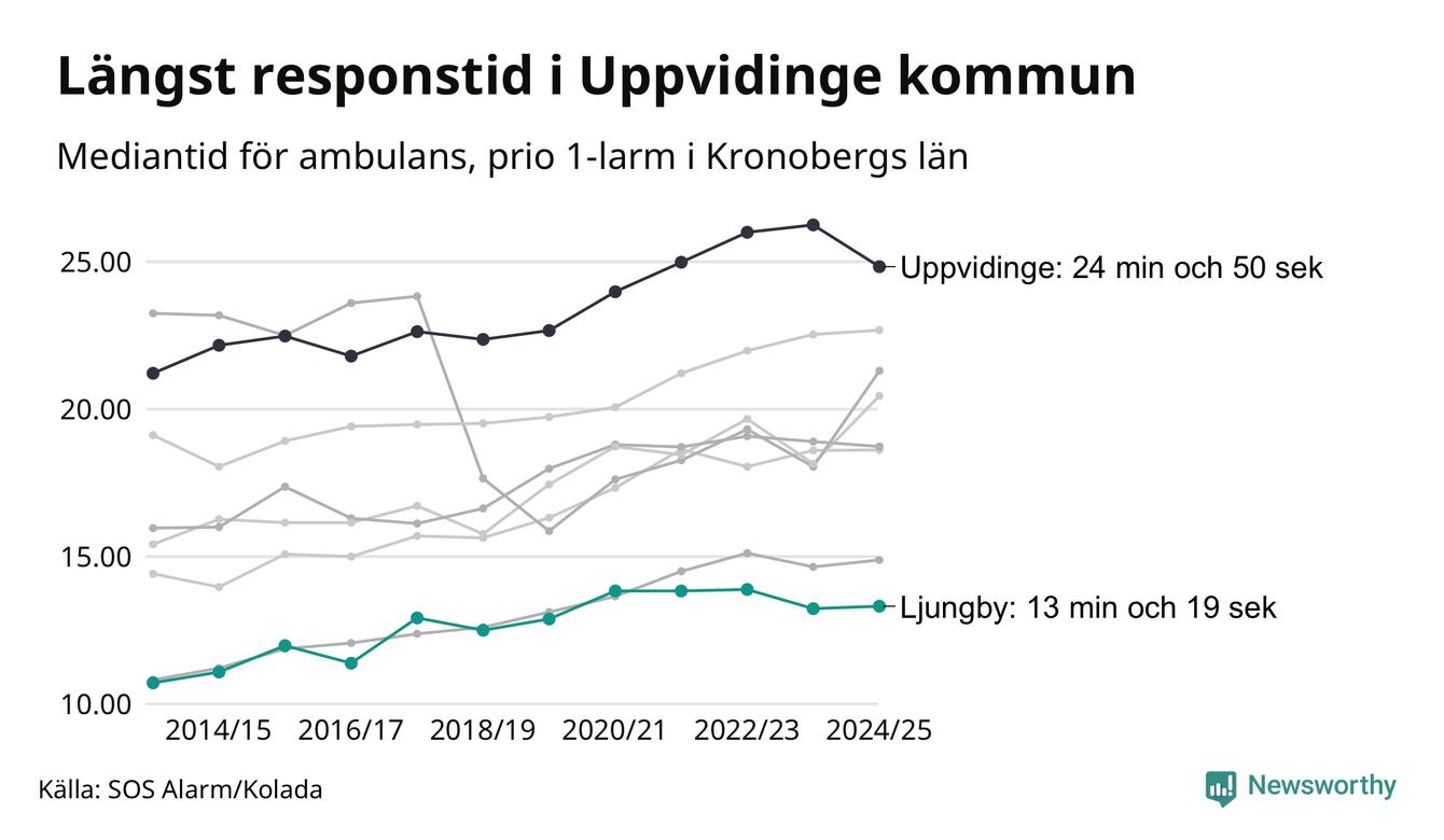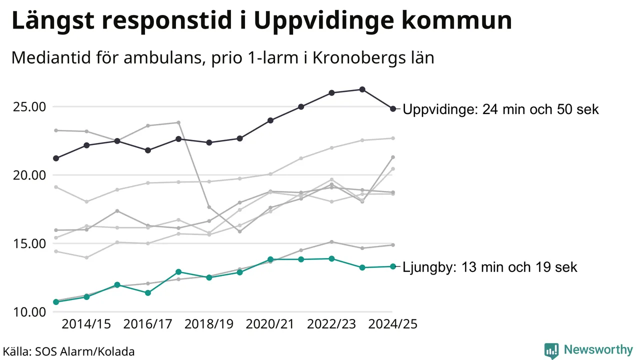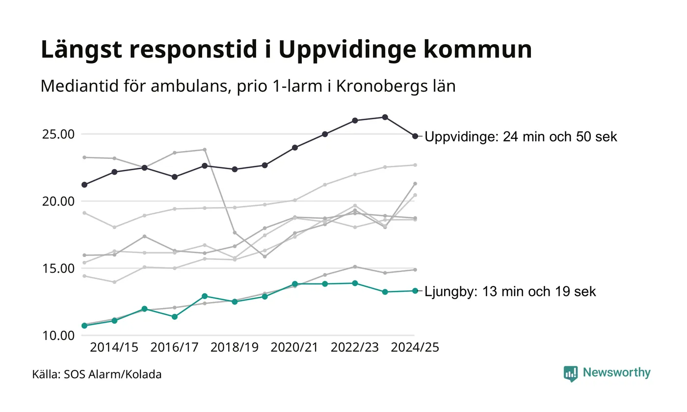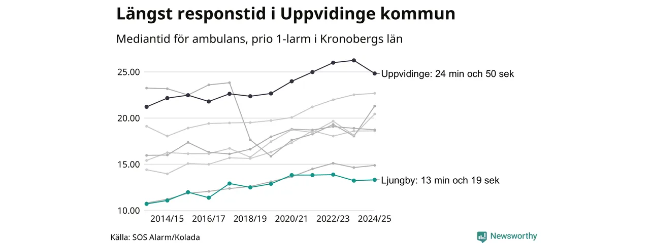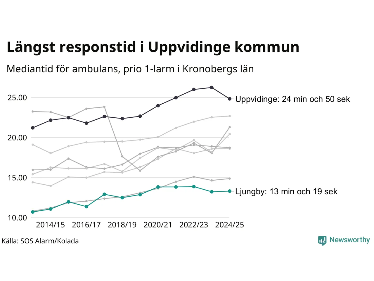 Bland kommunerna i Region Kronoberg nåddes Ljungby snabbast av ambulans under 2024/2025. Längst är väntetiden i Uppvidinge kommun: 24 minuter och 50 sekunder. Där har väntetiden ändå kapats med 1 minut och 25 sekunder jämfört med året innan.