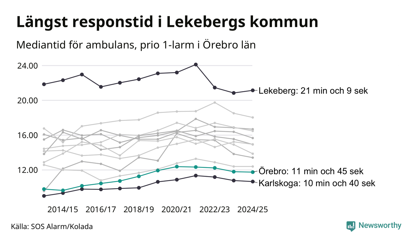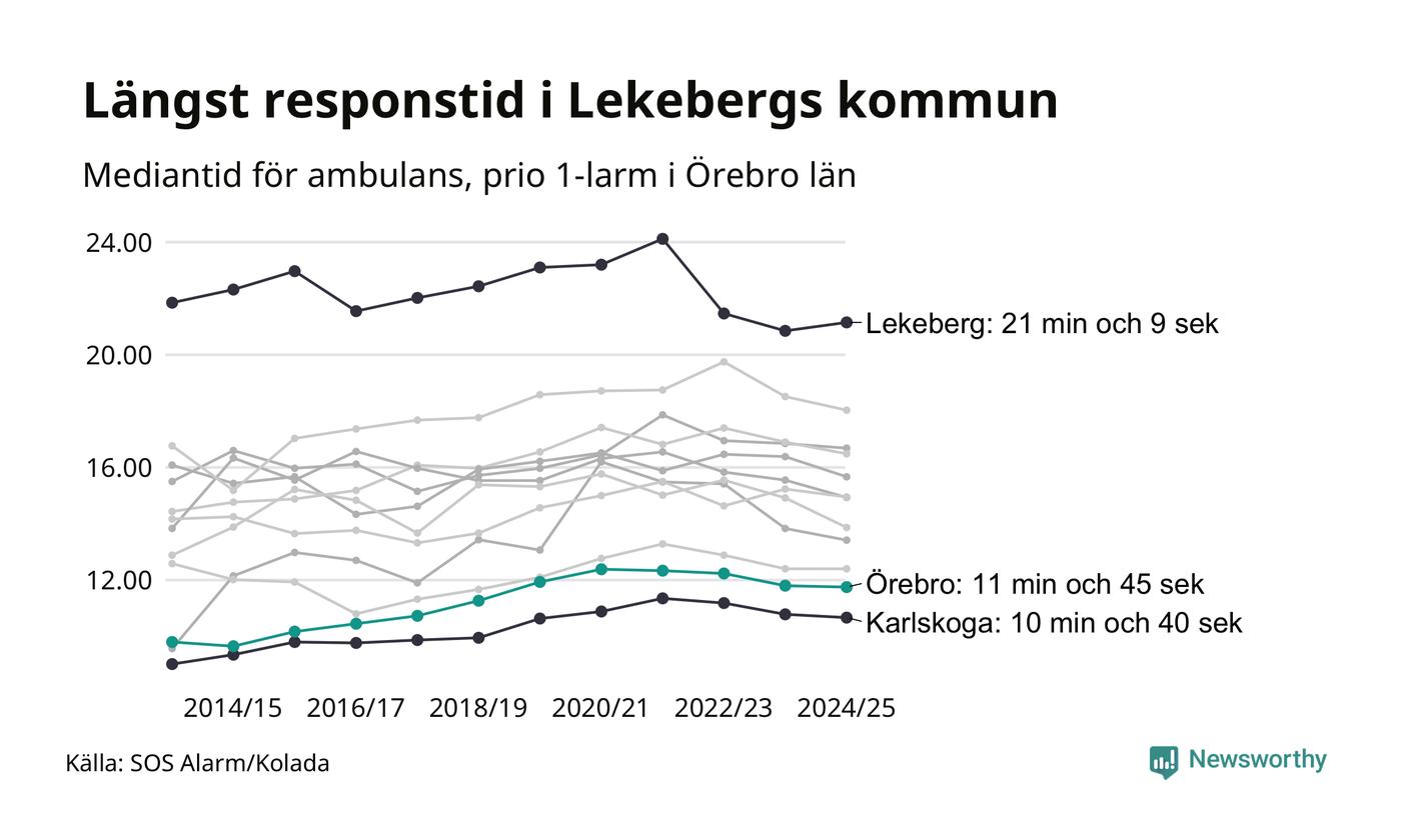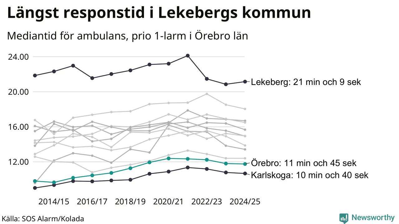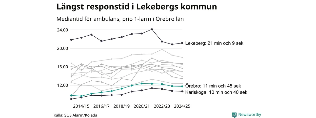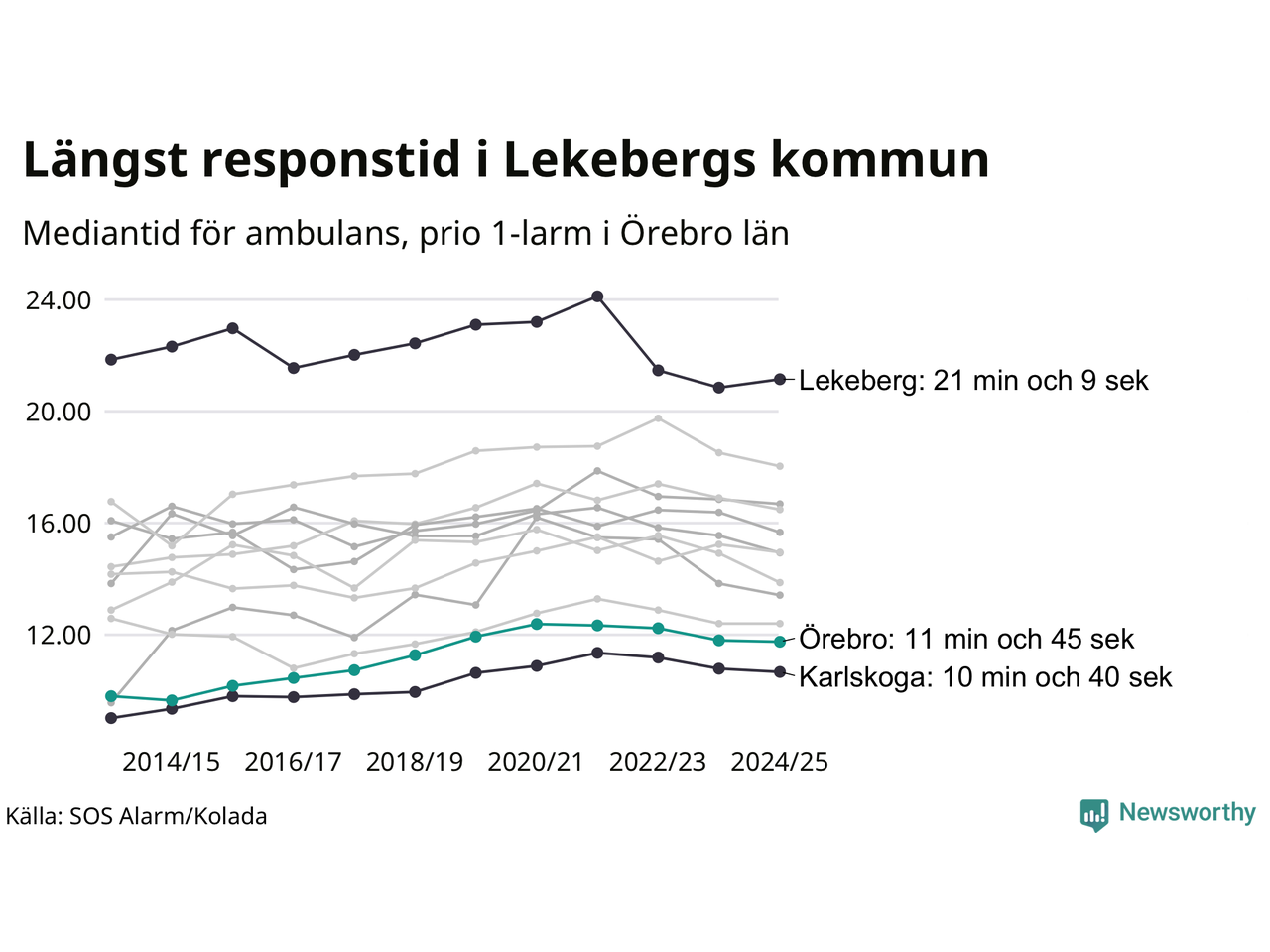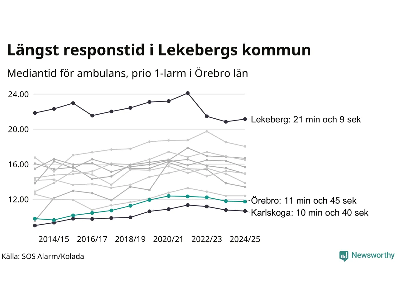 Bland kommunerna i Region Örebro nåddes Örebro kommun näst snabbast av ambulans under 2024/2025. Bara i Karlskoga kommer ambulansen snabbare. Längst är väntetiden i Lekebergs kommun: 21 minuter och 9 sekunder.