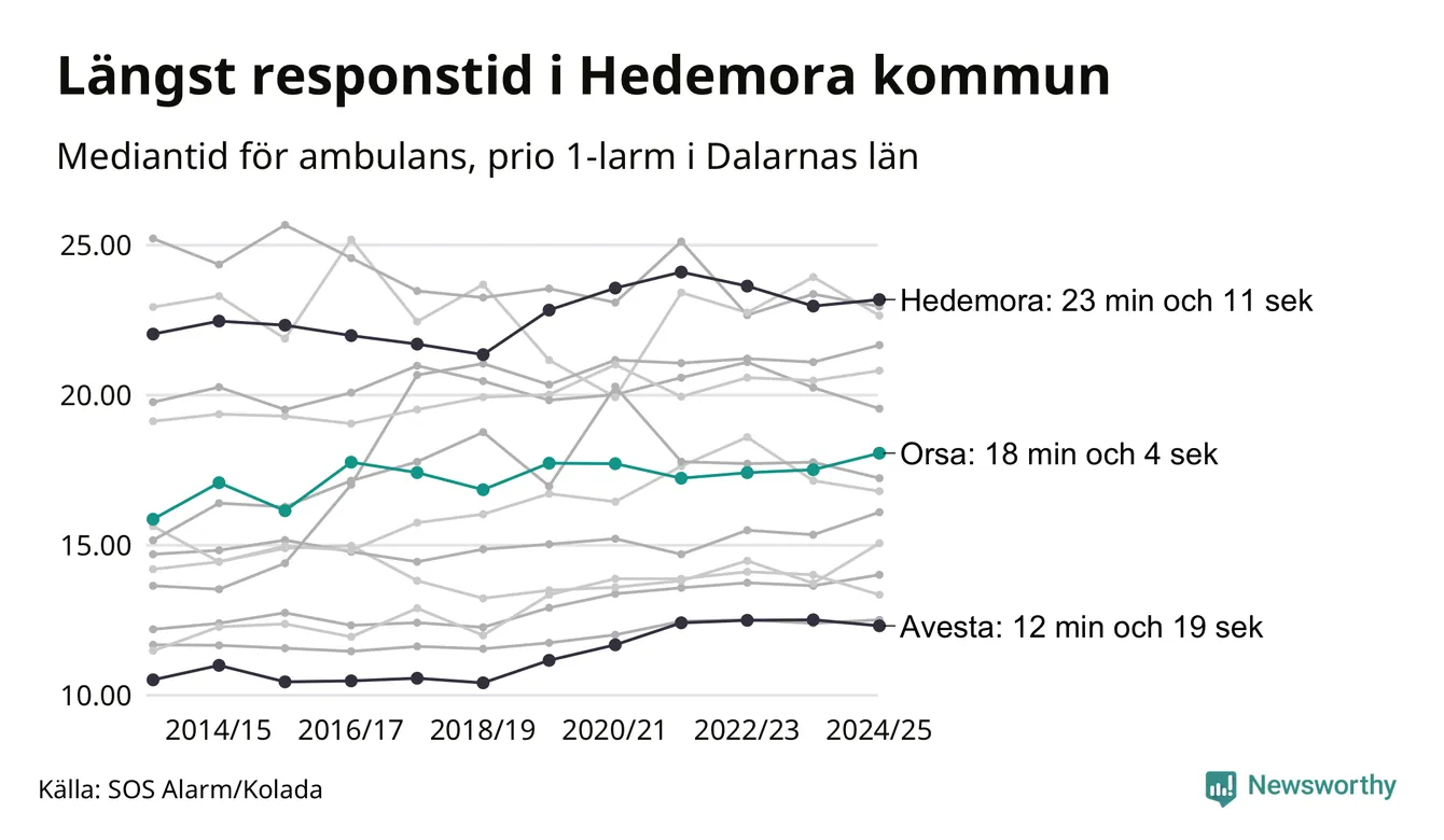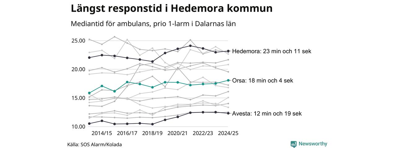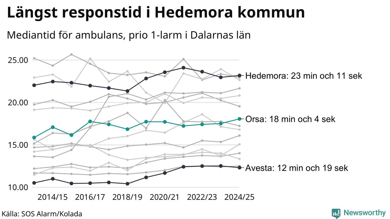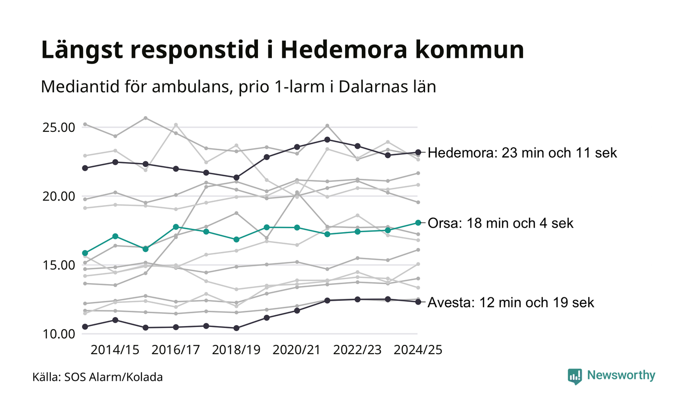 Det tar 18 minuter och 4 sekunder från att 112-samtalet når larmcentralen till att ambulansen är på plats i Orsa kommun. Det visar de senaste siffrorna från SOS Alarm. Tiden är en mediantid för alla prio 1-larm mellan 1 juni 2024 och 31 maj 2025 och ett nyckeltal som redovisas varje år.