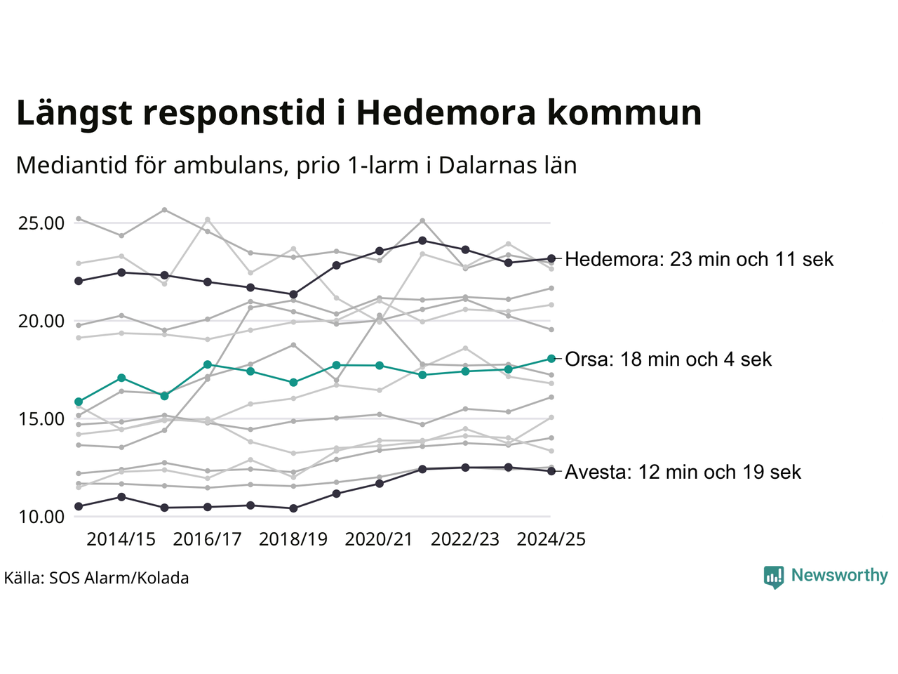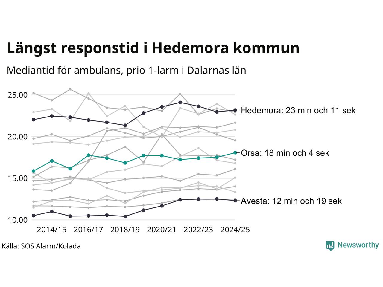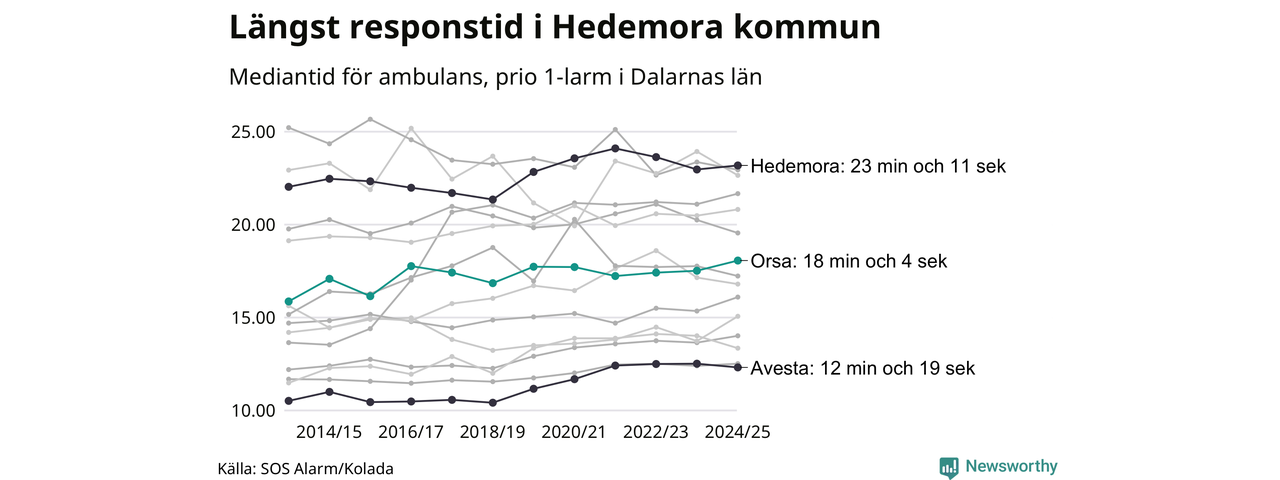 Det tar 18 minuter och 4 sekunder från att 112-samtalet når larmcentralen till att ambulansen är på plats i Orsa kommun. Det visar de senaste siffrorna från SOS Alarm. Tiden är en mediantid för alla prio 1-larm mellan 1 juni 2024 och 31 maj 2025 och ett nyckeltal som redovisas varje år.