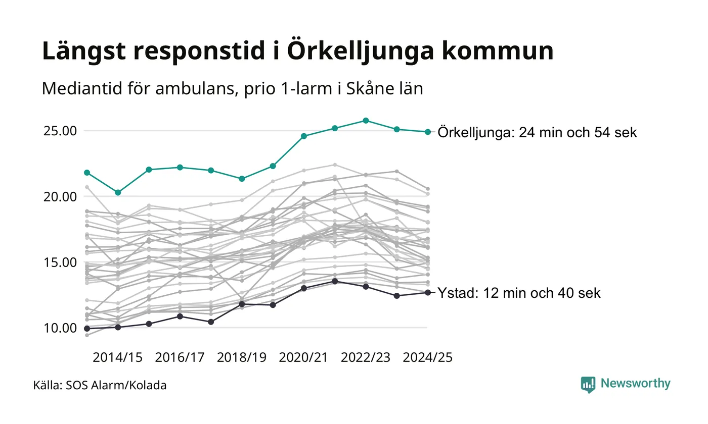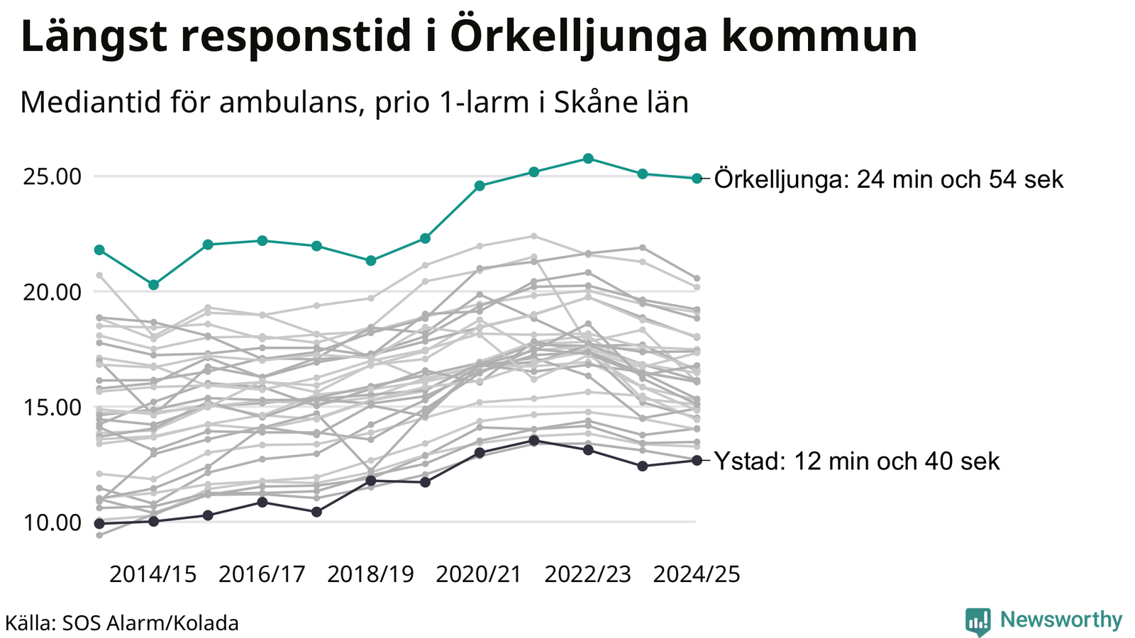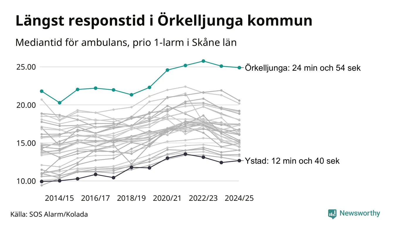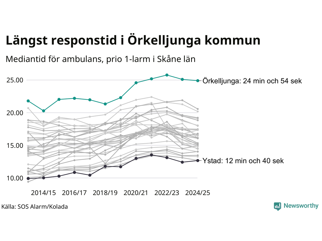 Det tar 24 minuter och 54 sekunder från att 112-samtalet når larmcentralen till att ambulansen är på plats i Örkelljunga kommun. Det visar de senaste siffrorna från SOS Alarm. Tiden är en mediantid för alla prio 1-larm mellan 1 juni 2024 och 31 maj 2025 och ett nyckeltal som redovisas varje år.