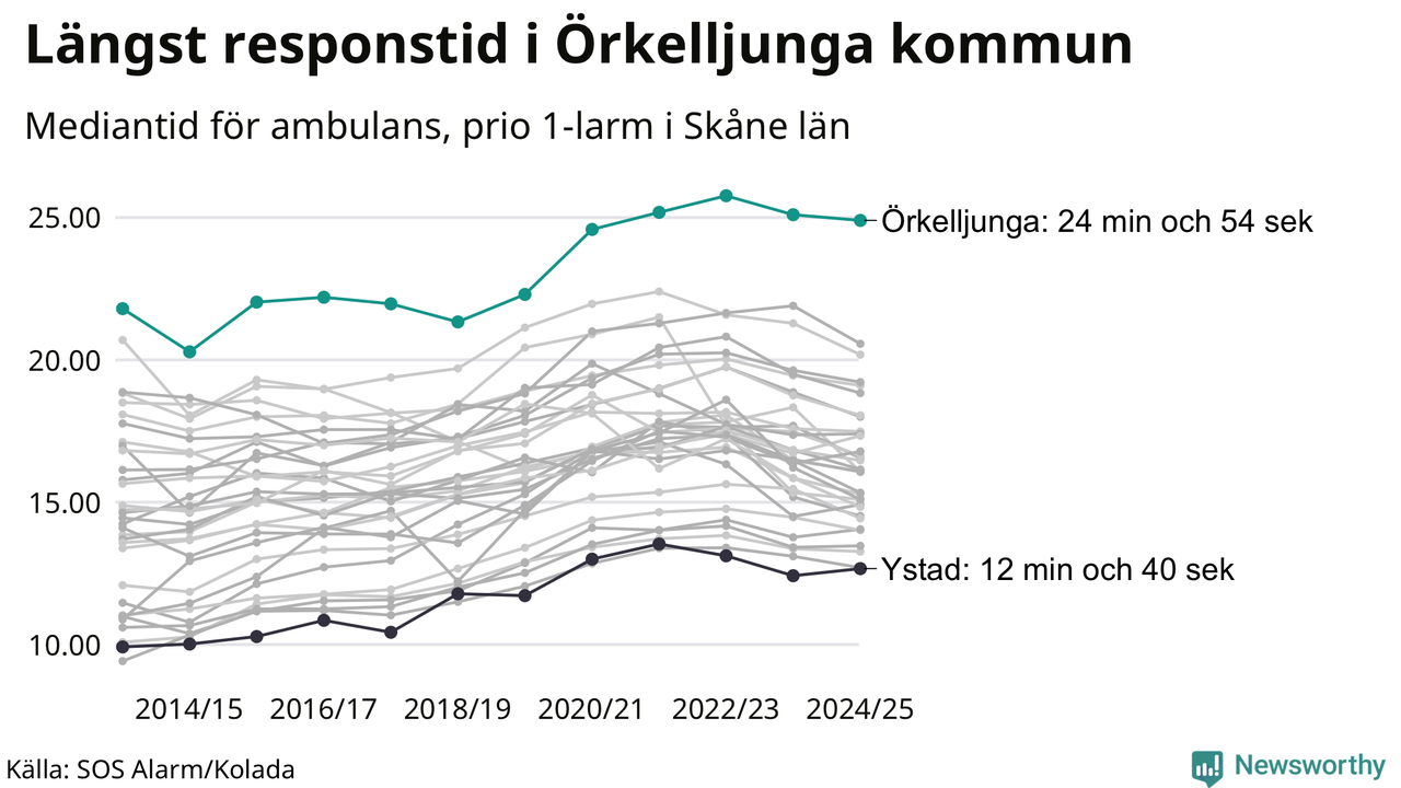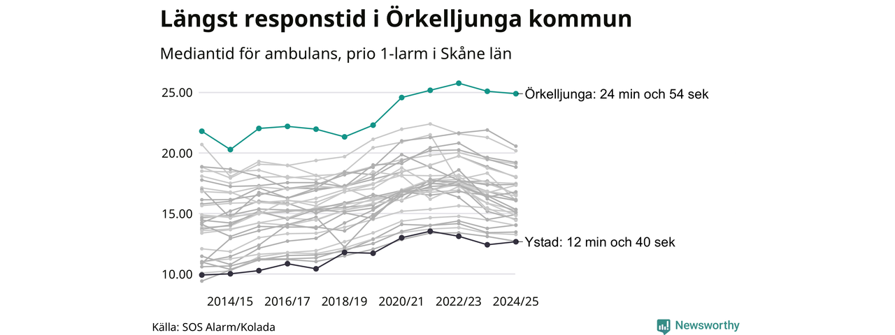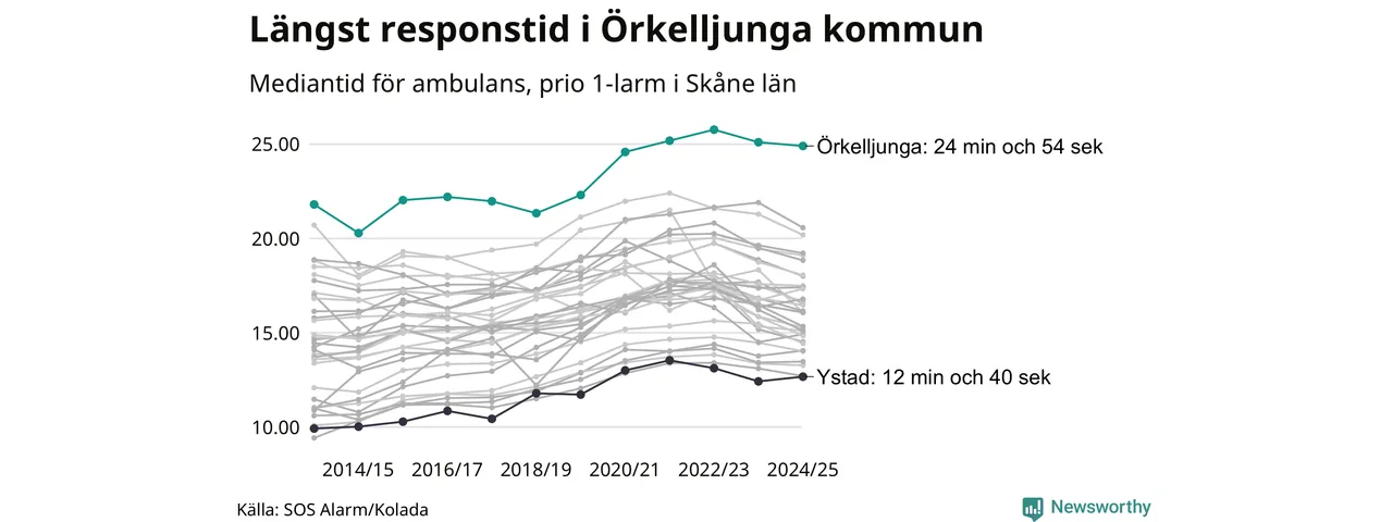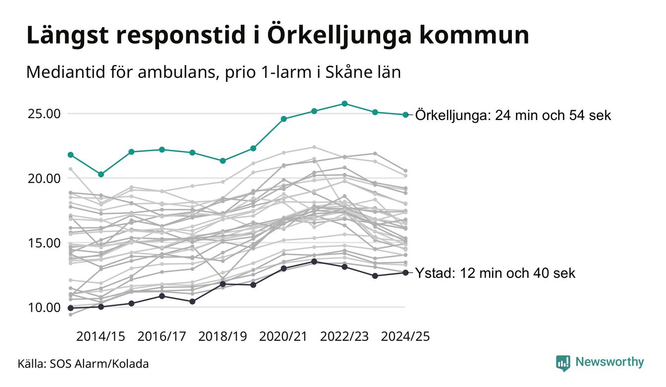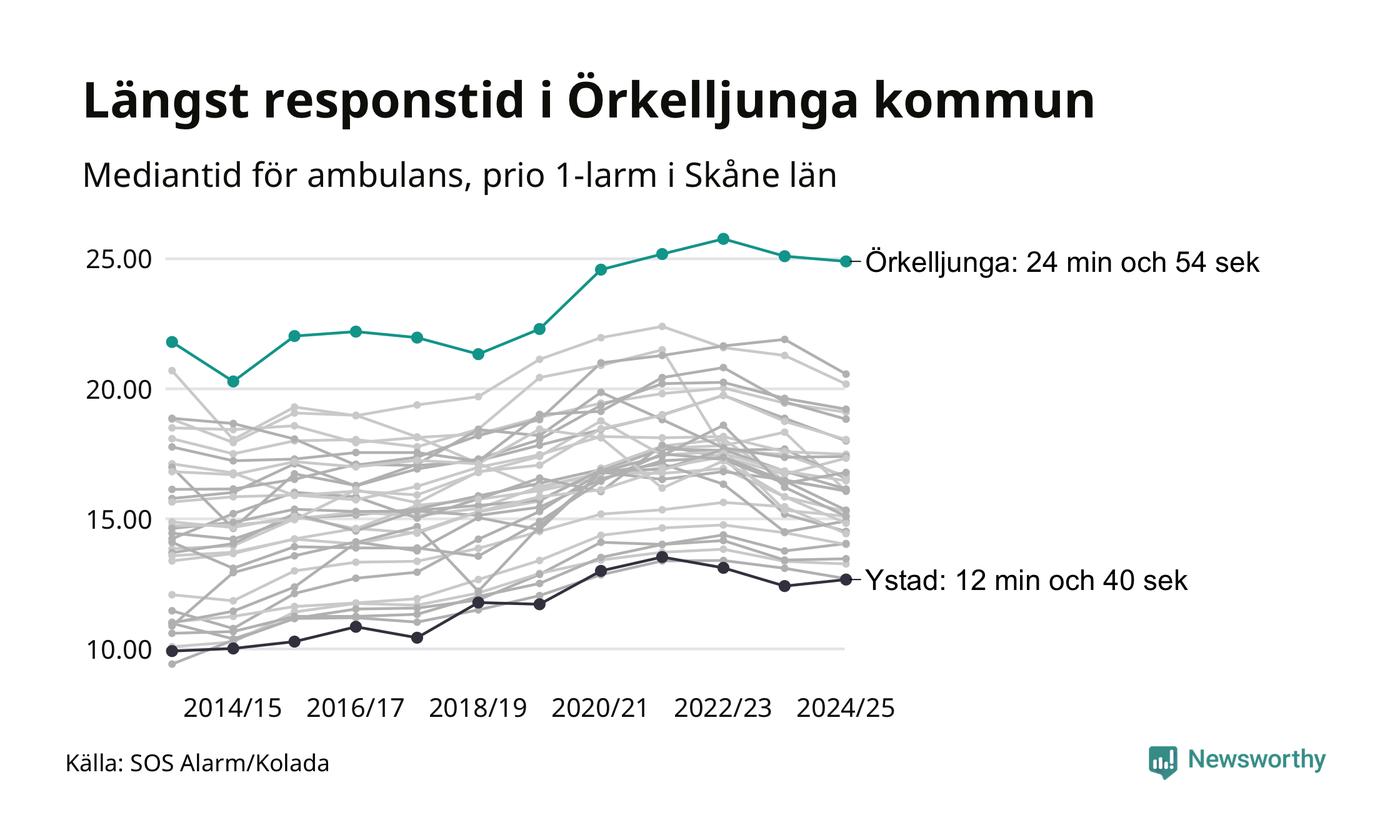 Det tar 24 minuter och 54 sekunder från att 112-samtalet når larmcentralen till att ambulansen är på plats i Örkelljunga kommun. Det visar de senaste siffrorna från SOS Alarm. Tiden är en mediantid för alla prio 1-larm mellan 1 juni 2024 och 31 maj 2025 och ett nyckeltal som redovisas varje år.