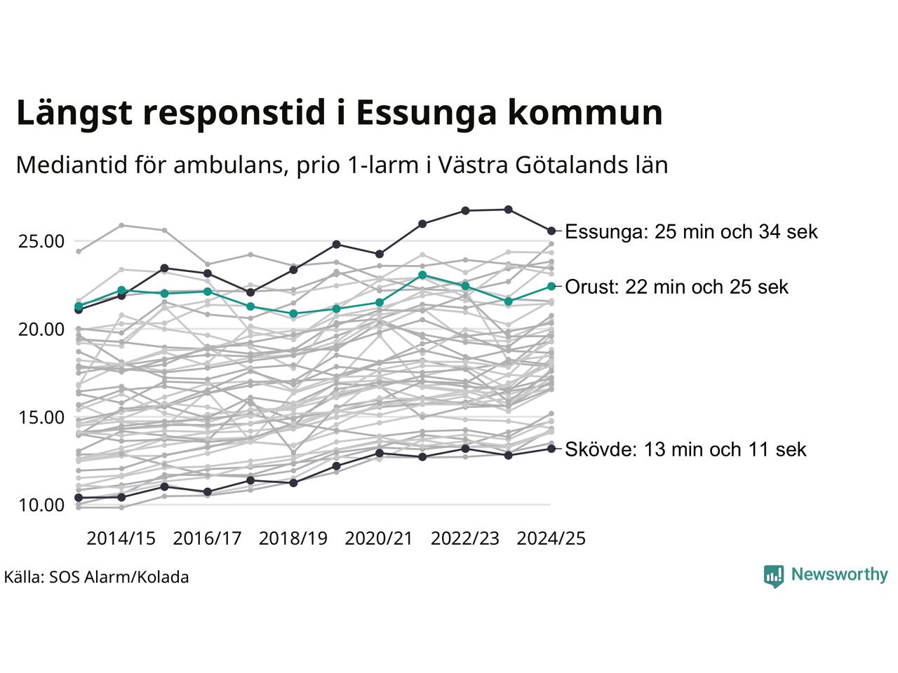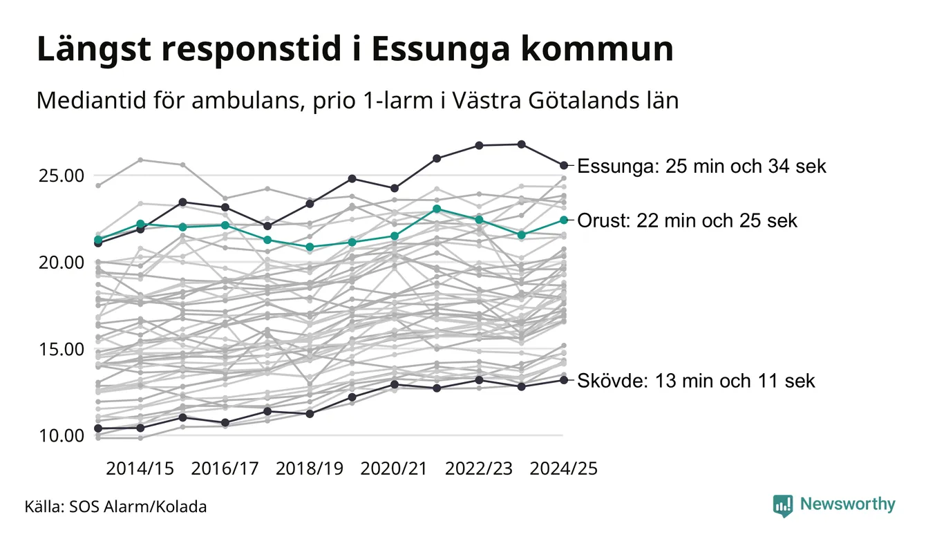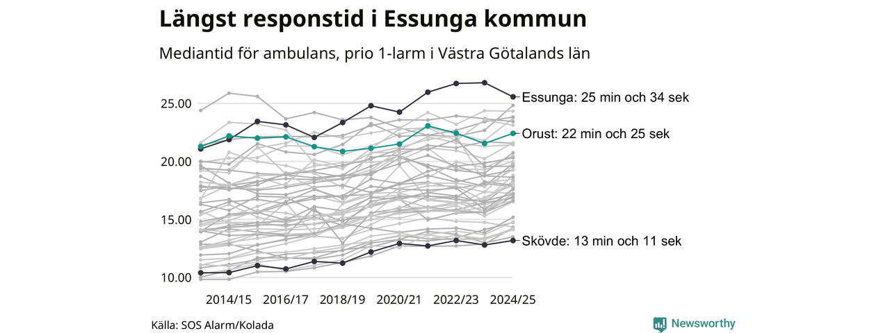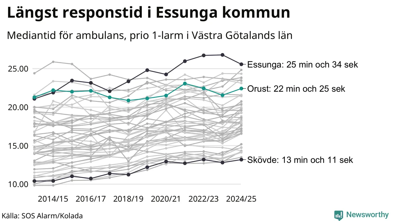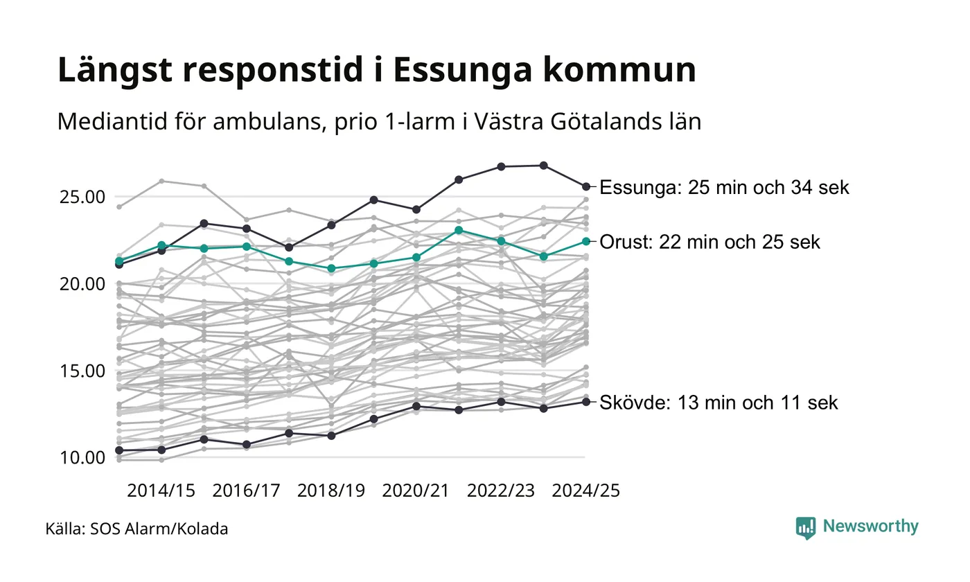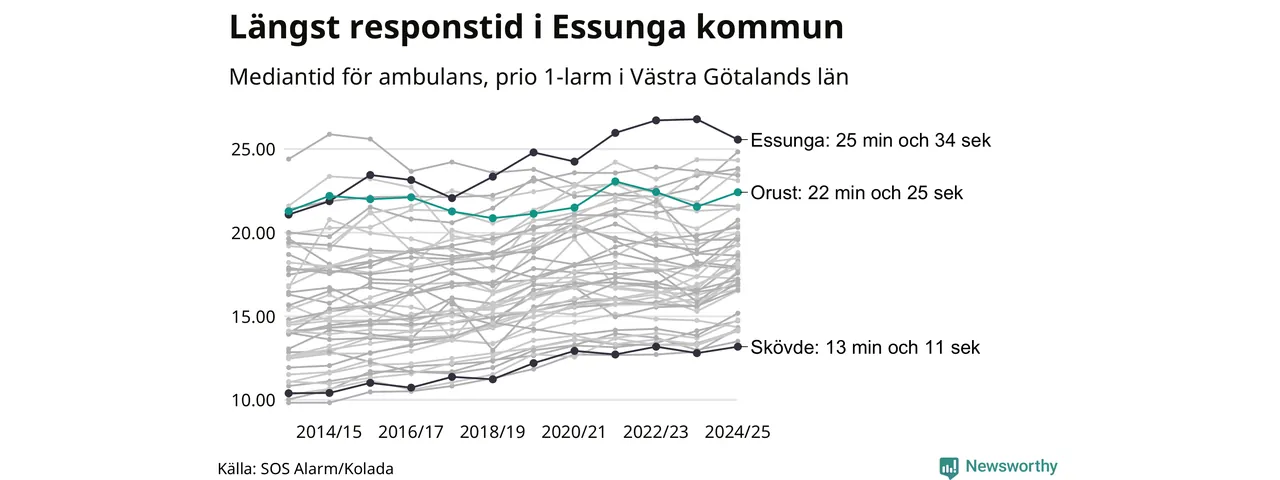 Essunga är alltså en av de kommuner som får vänta längst på ambulans i landet. Längst är väntan på ambulans i Pajala kommun, 37 minuter och 55 sekunder. Kommunerna med längst responstid finns i Norrlands inland eller i glesbygd.