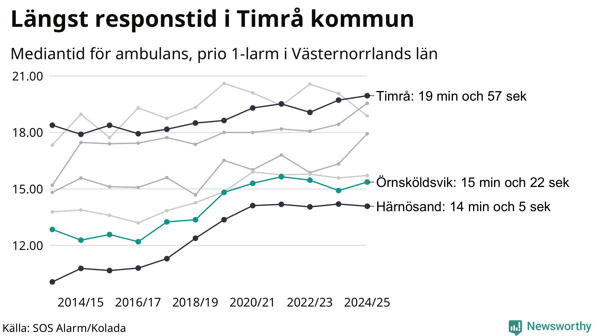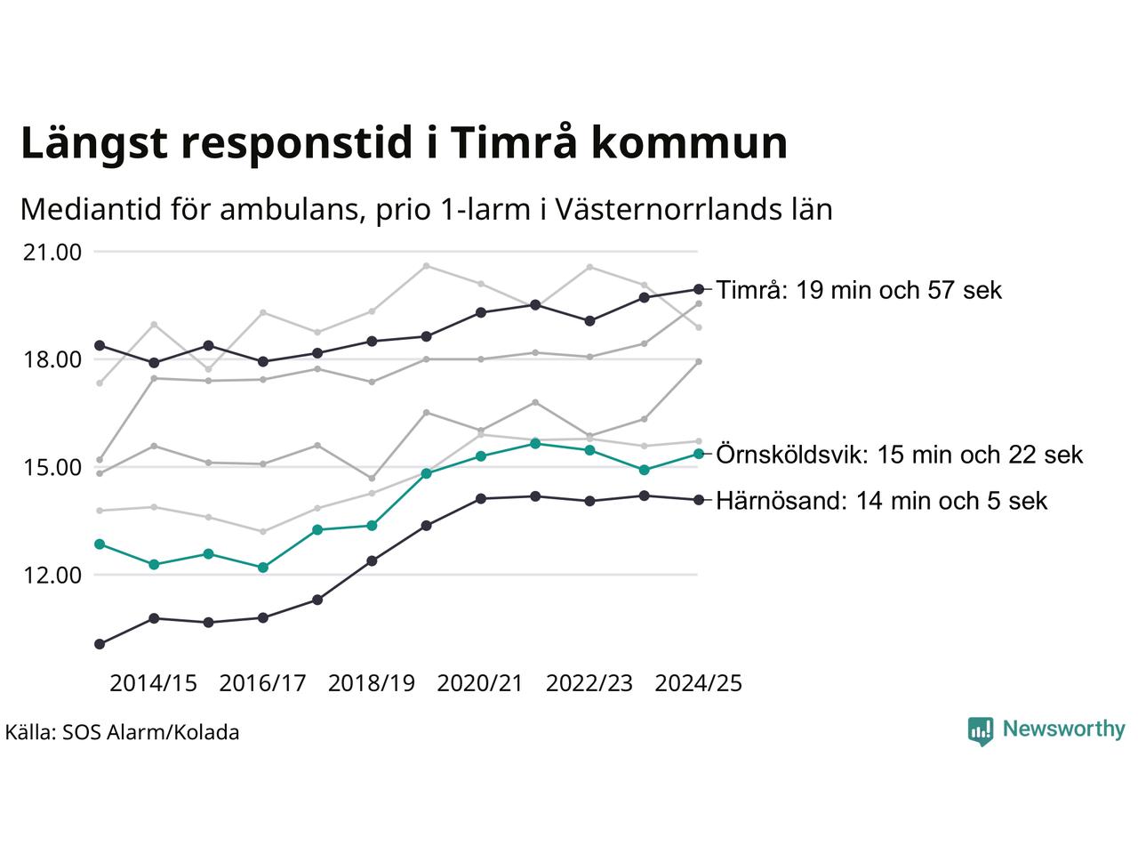 Även om väntan i Timrå är lång för att vara Region Västernorrland krävs ytterligare 5 minuter och 9 sekunder för att ta sig in på topp tiolistan över kommuerna i landet med längst väntetid. Längst är väntan på ambulans i Pajala kommun, 37 minuter och 55 sekunder. Kommunerna med längst responstid finns i Norrlands inland eller i glesbygd.