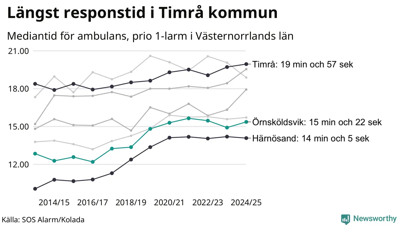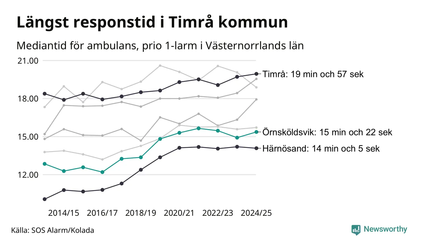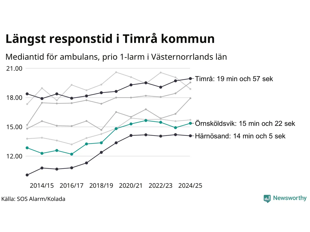 Bland kommunerna i Region Västernorrland nåddes Örnsköldsvik näst snabbast av ambulans under 2024/2025. Bara i Härnösand kommer ambulansen snabbare. Längst är väntetiden i Timrå kommun: 19 minuter och 57 sekunder.