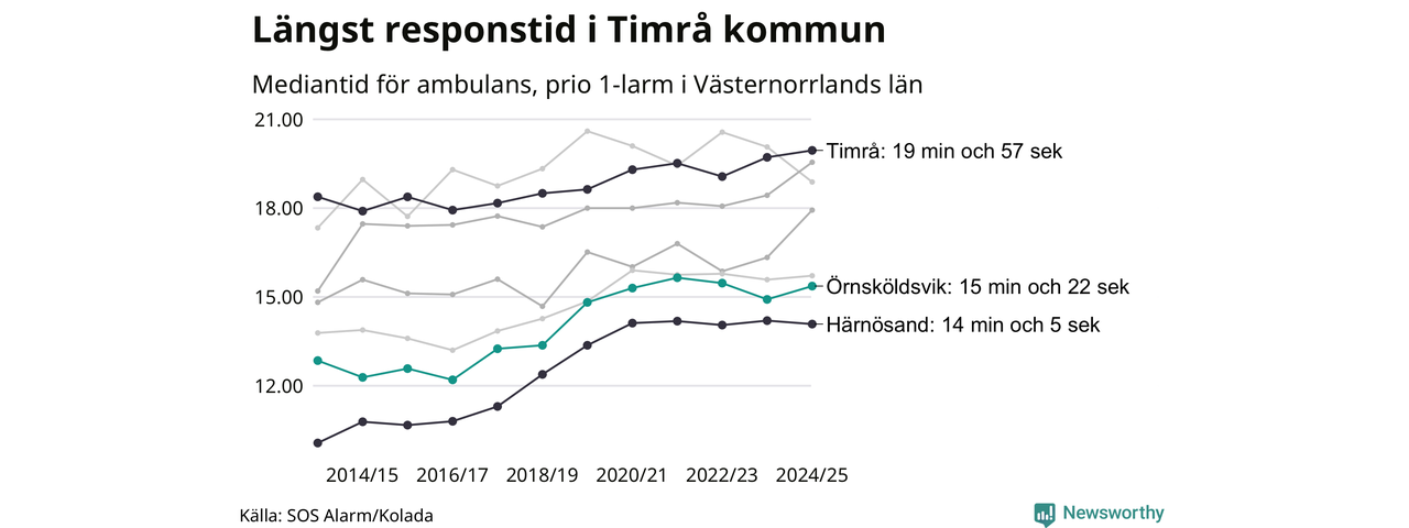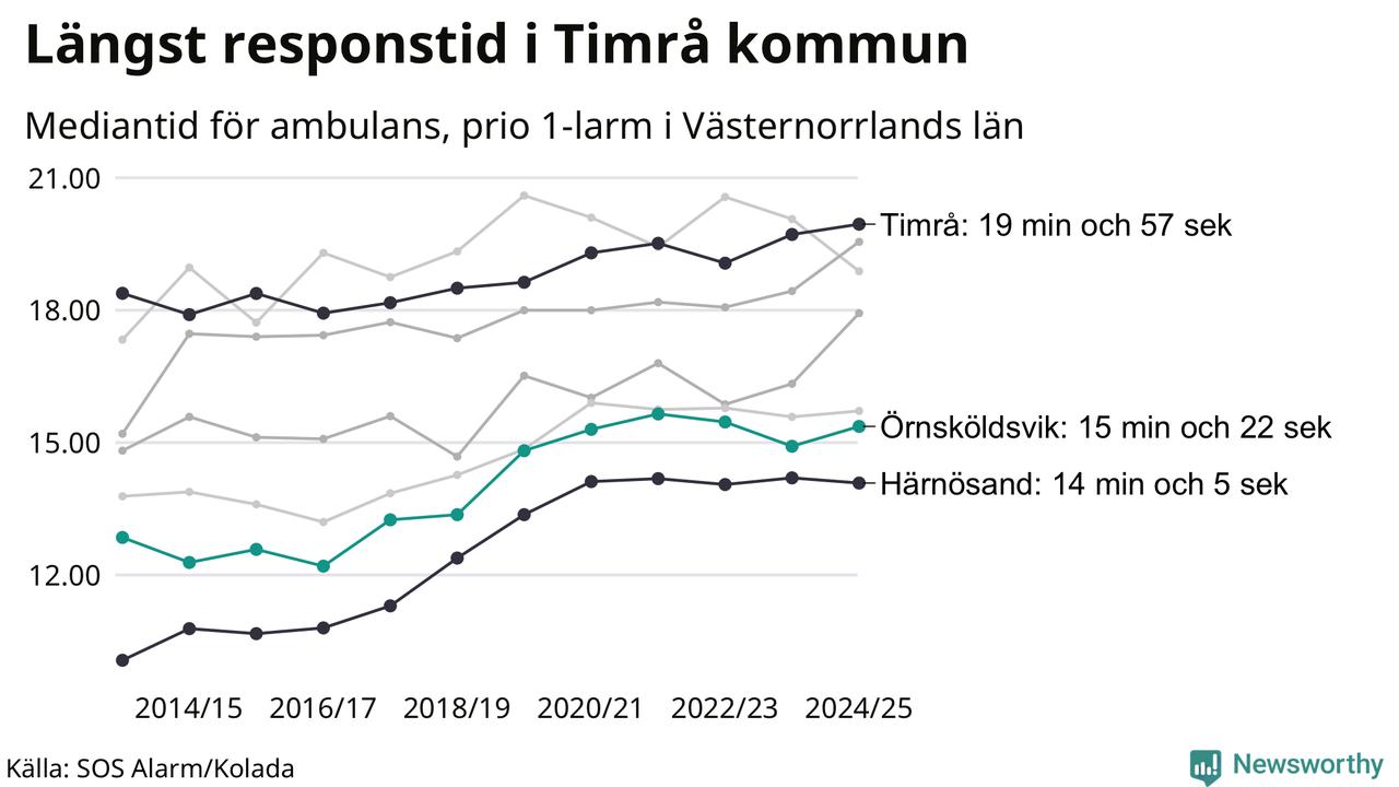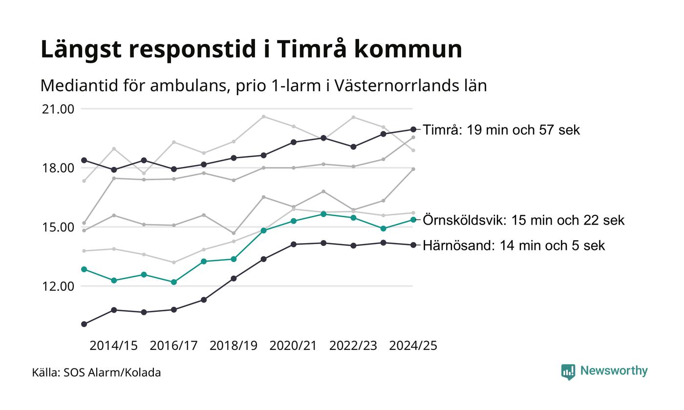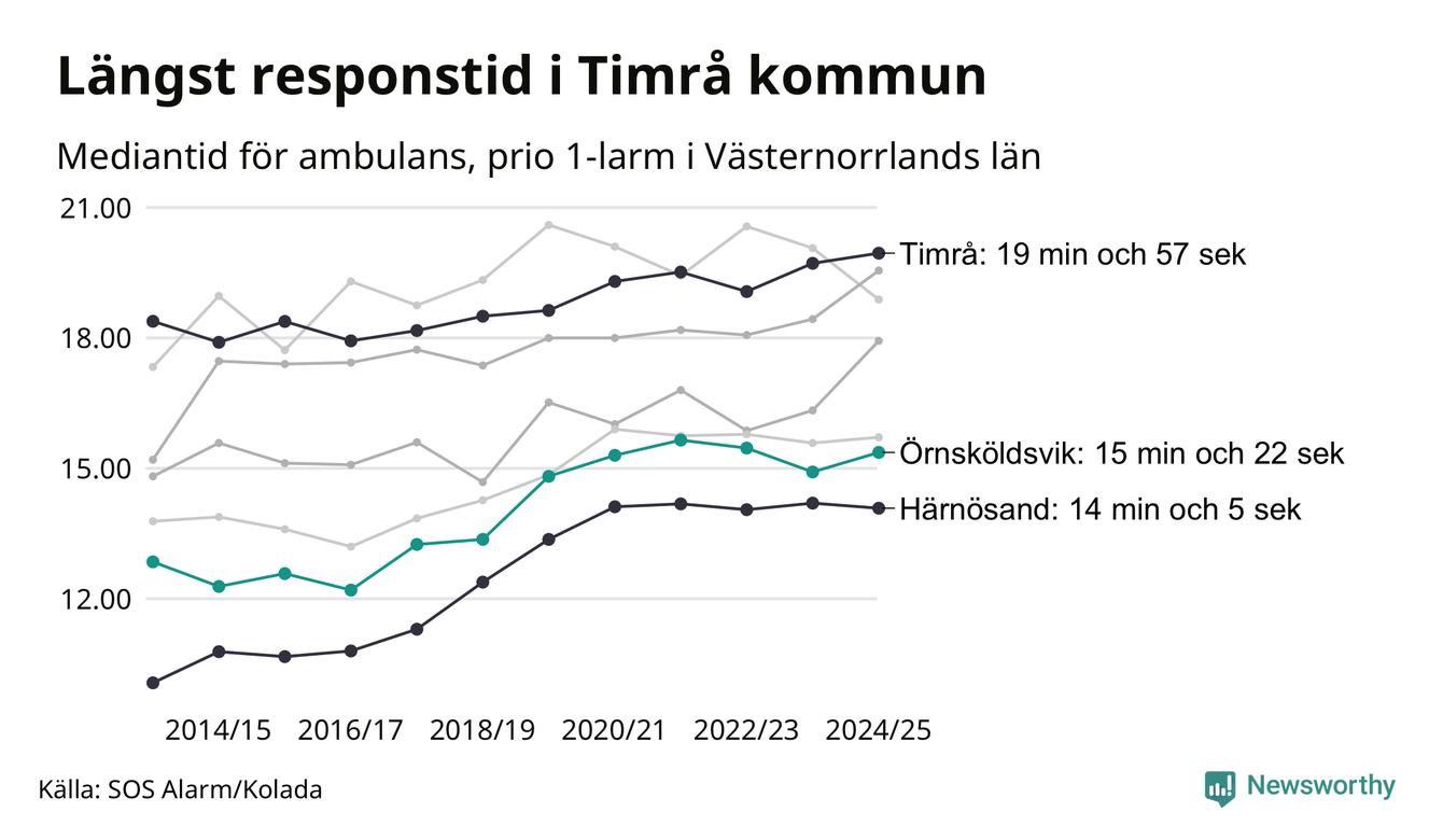 Bland kommunerna i Region Västernorrland nåddes Örnsköldsvik näst snabbast av ambulans under 2024/2025. Bara i Härnösand kommer ambulansen snabbare. Längst är väntetiden i Timrå kommun: 19 minuter och 57 sekunder.