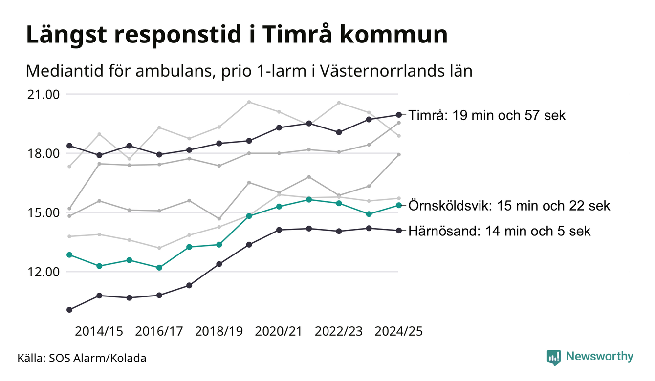Det tar 15 minuter och 22 sekunder från att 112-samtalet når larmcentralen till att ambulansen är på plats i Örnsköldsviks kommun. Det visar de senaste siffrorna från SOS Alarm. Tiden är en mediantid för alla prio 1-larm mellan 1 juni 2024 och 31 maj 2025 och ett nyckeltal som redovisas varje år.