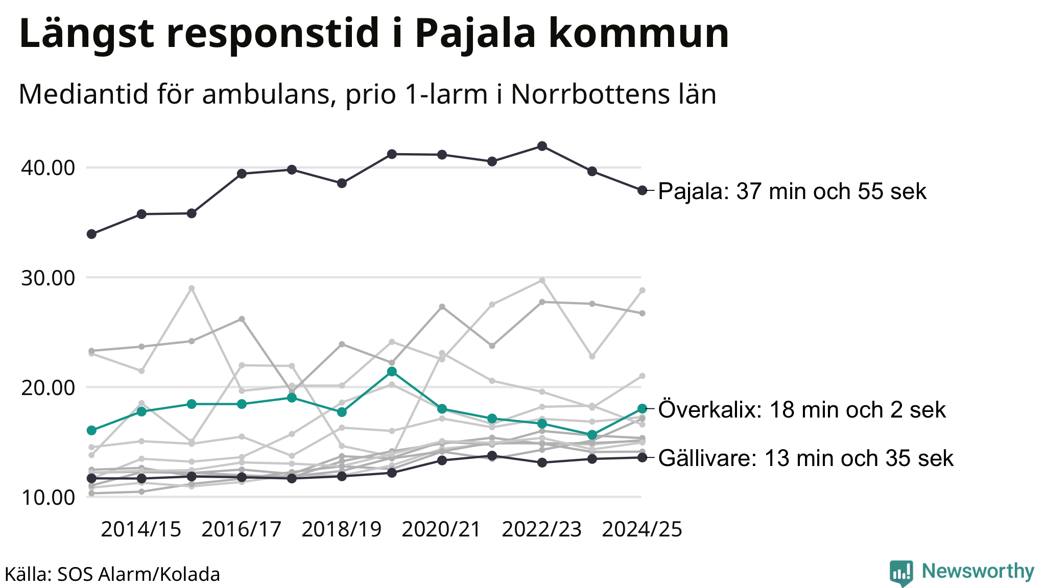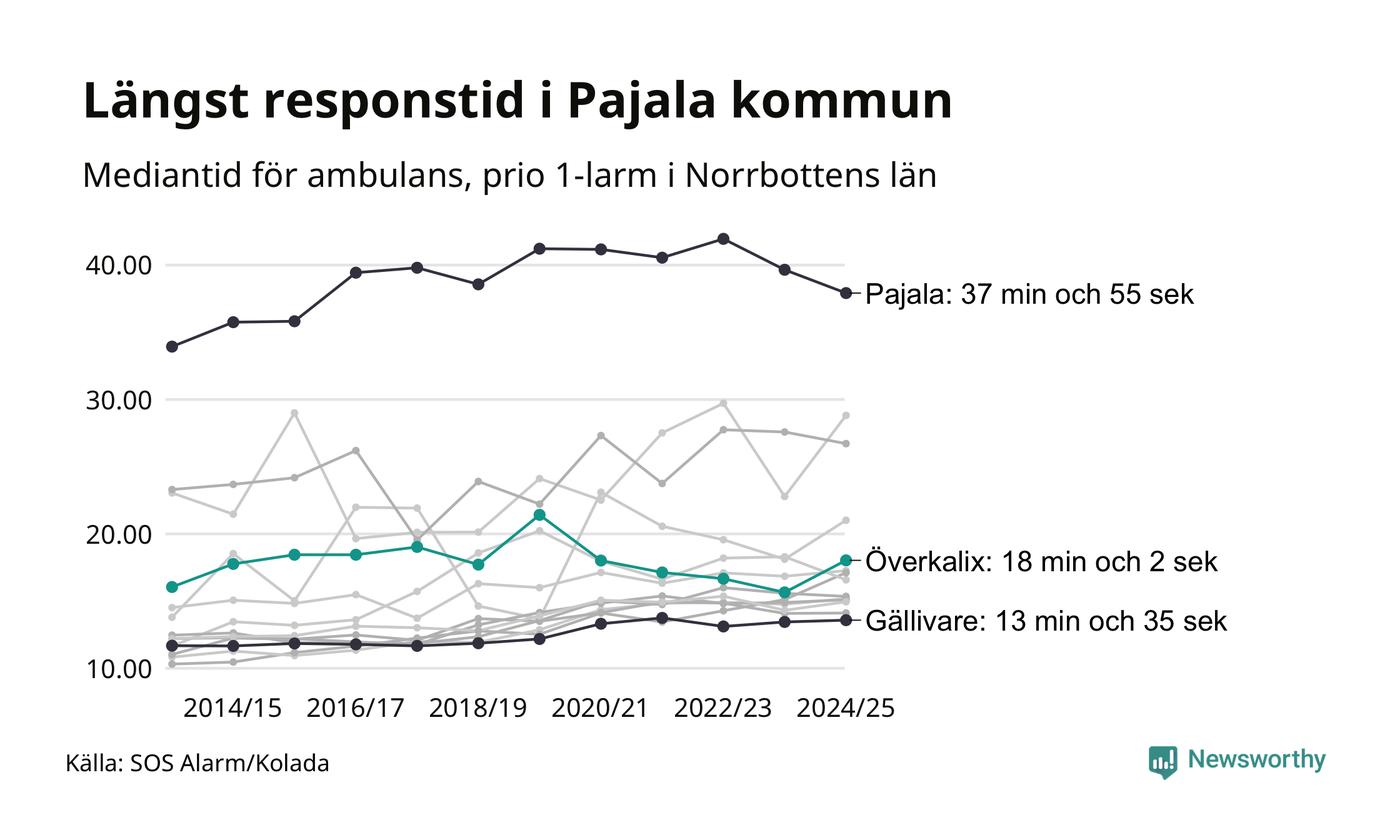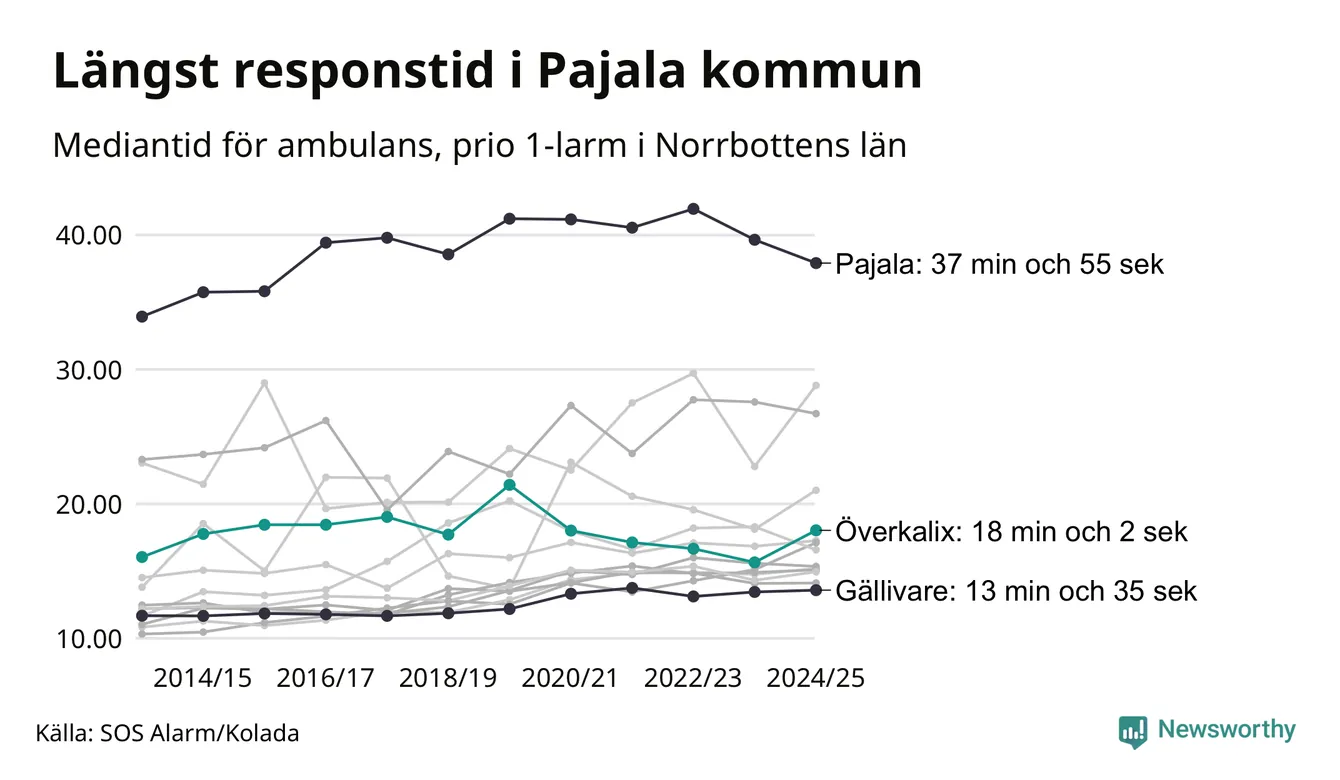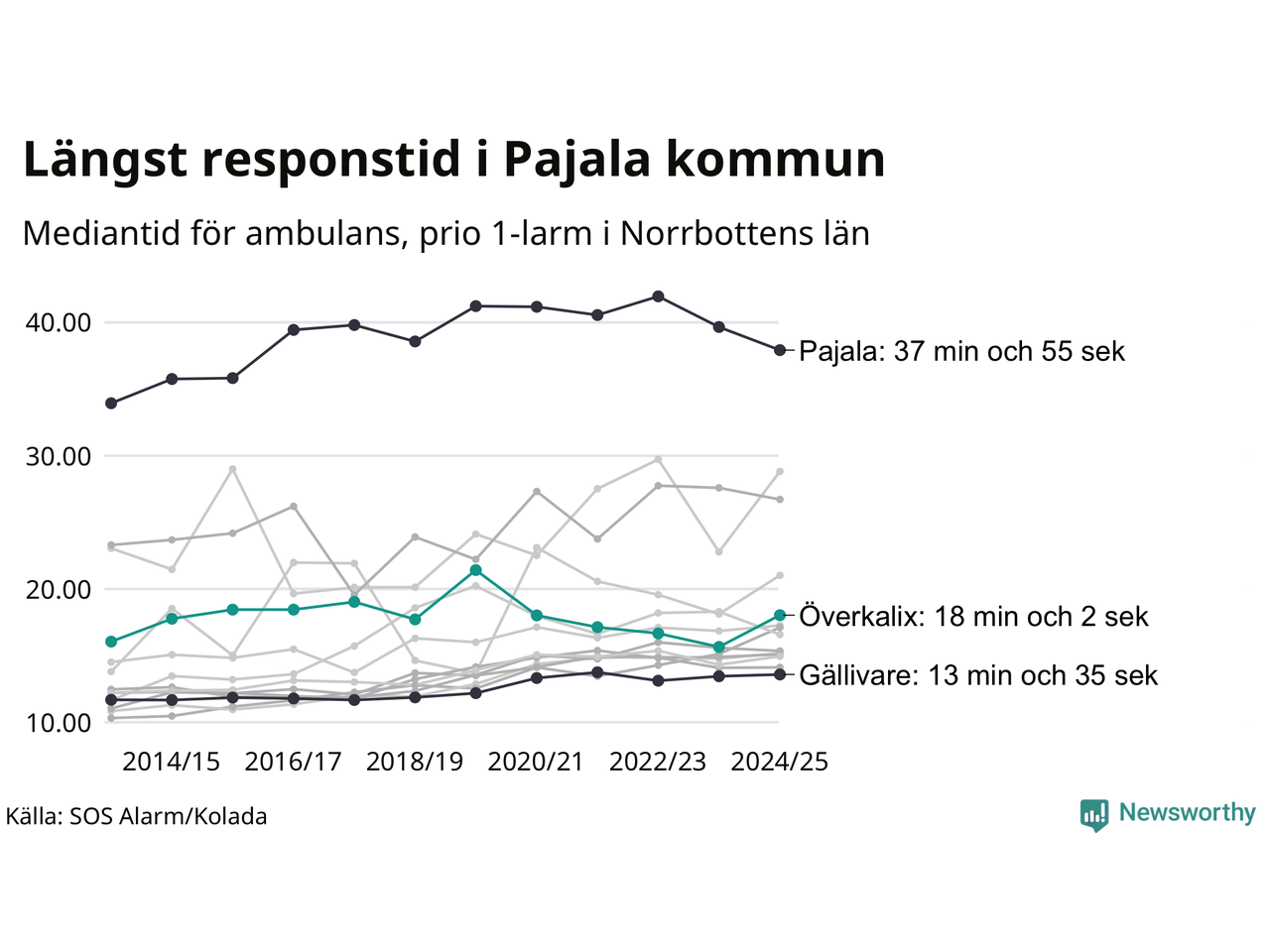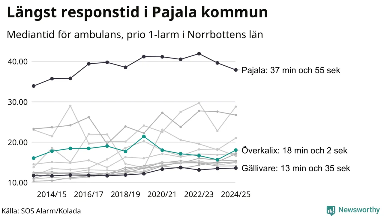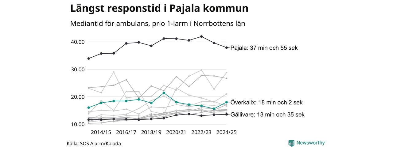 Det tar 18 minuter och 2 sekunder från att 112-samtalet når larmcentralen till att ambulansen är på plats i Överkalix kommun. Det visar de senaste siffrorna från SOS Alarm. Tiden är en mediantid för alla prio 1-larm mellan 1 juni 2024 och 31 maj 2025 och ett nyckeltal som redovisas varje år.