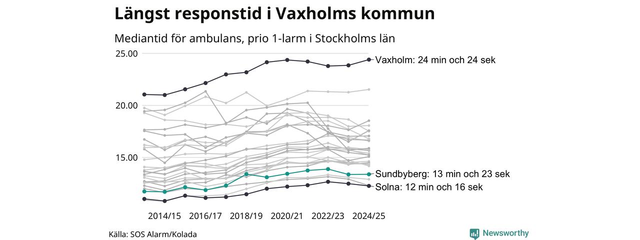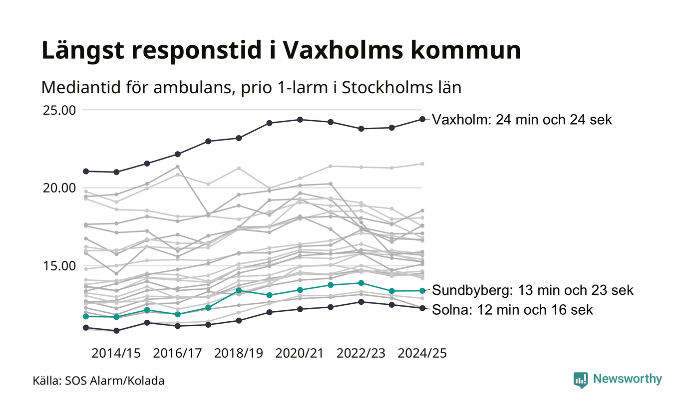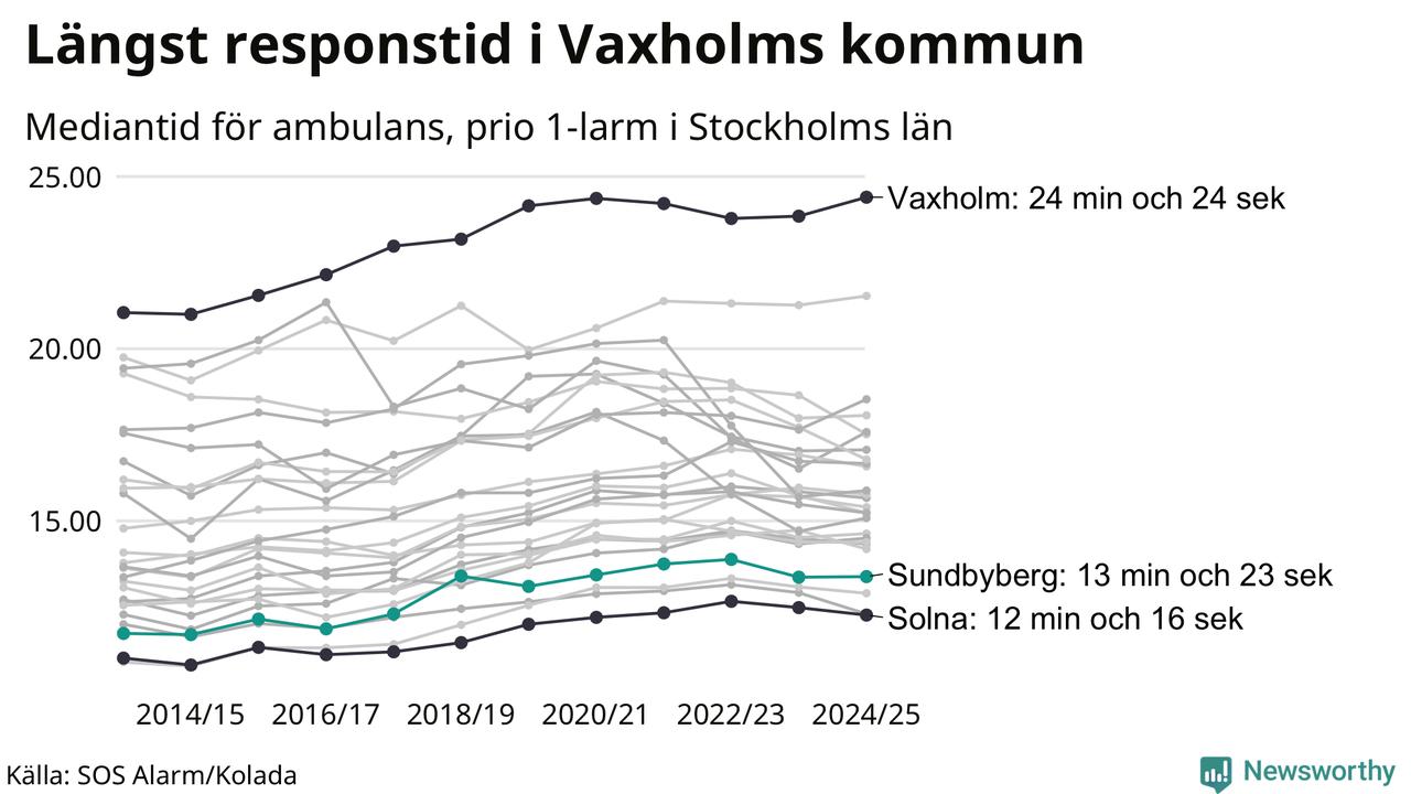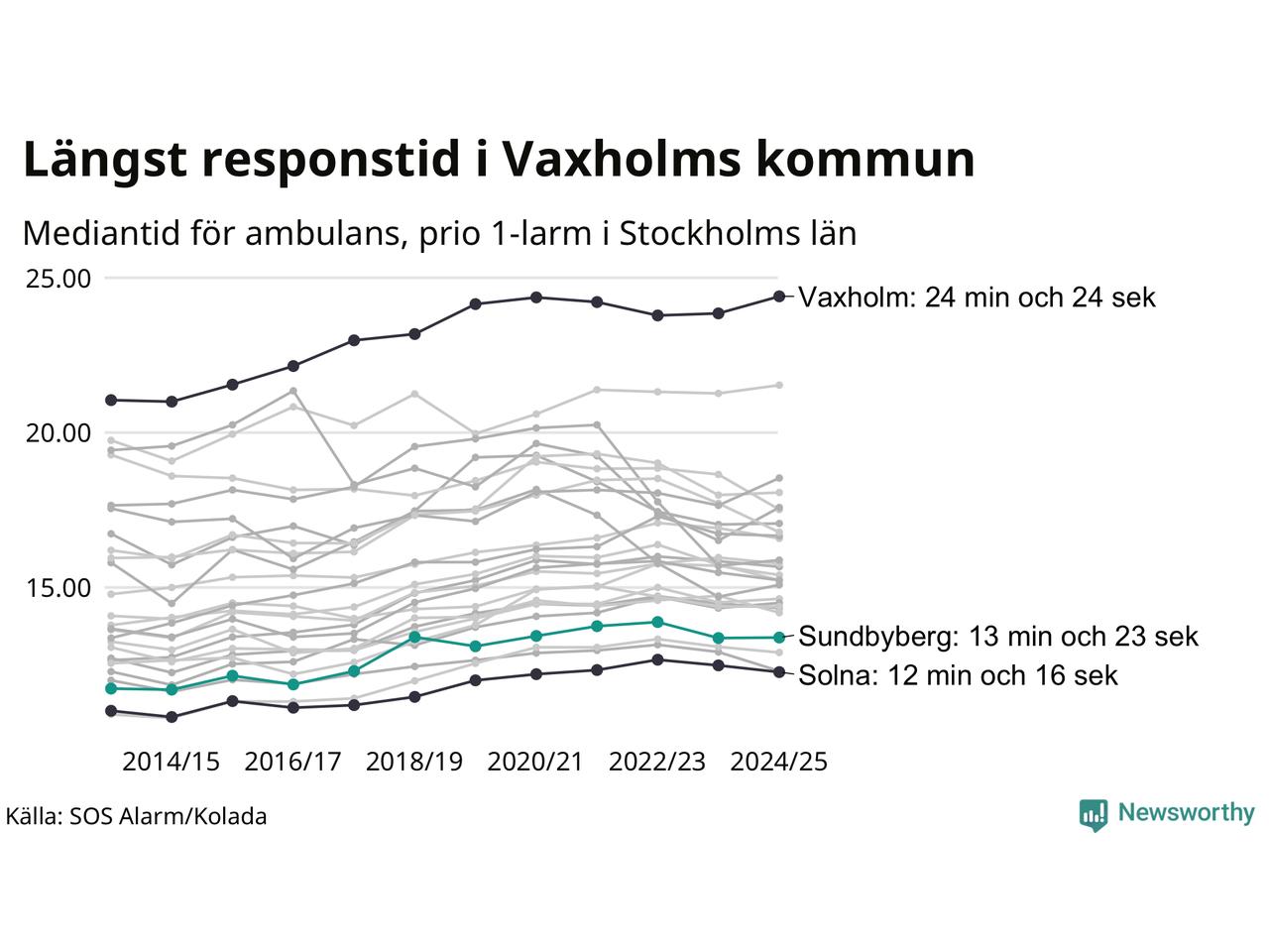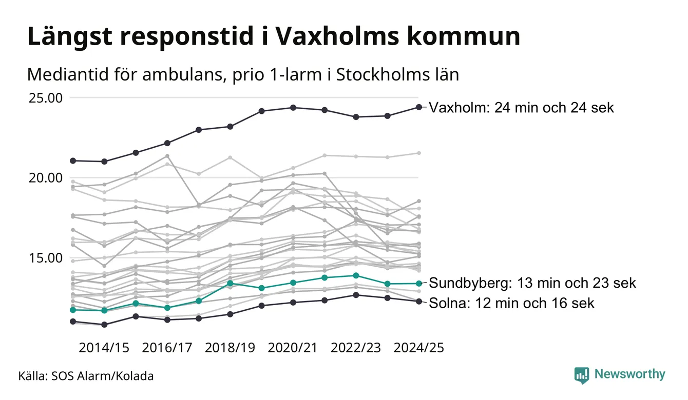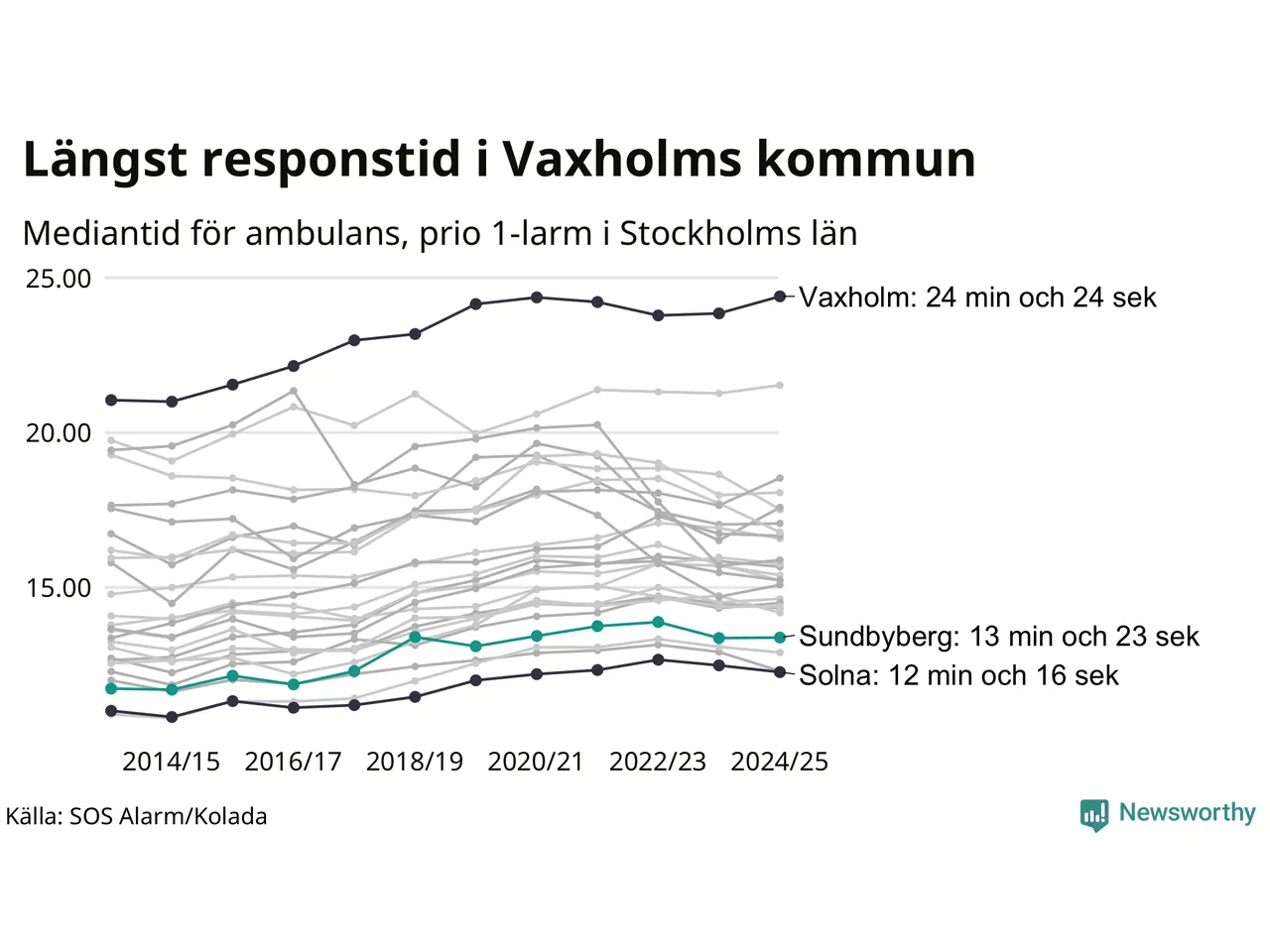 Det tar 13 minuter och 23 sekunder från att 112-samtalet når larmcentralen till att ambulansen är på plats i Sundbybergs kommun. Det visar de senaste siffrorna från SOS Alarm. Tiden är en mediantid för alla prio 1-larm mellan 1 juni 2024 och 31 maj 2025 och ett nyckeltal som redovisas varje år.