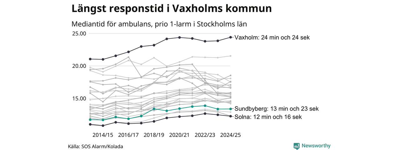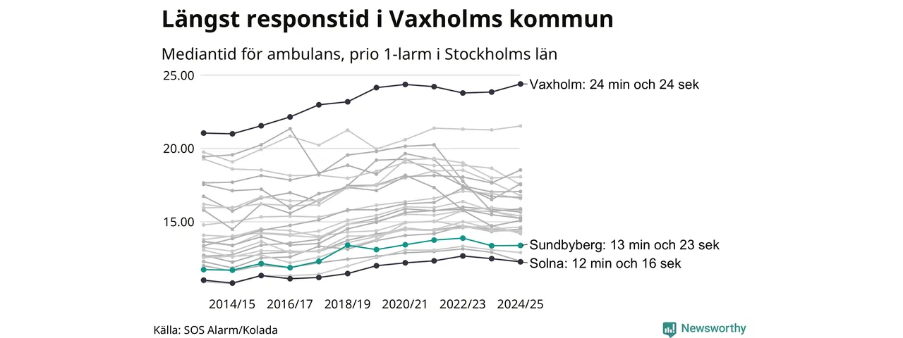 Men Sundbyberg tillhör inte de kommuner i Region Stockholm som får vänta längst på ambulans – tvärt om. Längst är väntetiden i Vaxholms kommun: 24 minuter och 24 sekunder. Snabbast var ambulansen framme i Solna, där det tog 12 minuter och 16 sekunder från larmsamtalet 2024/2025.