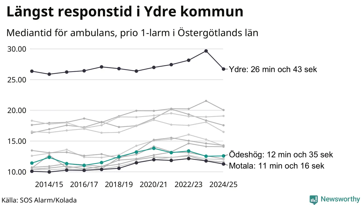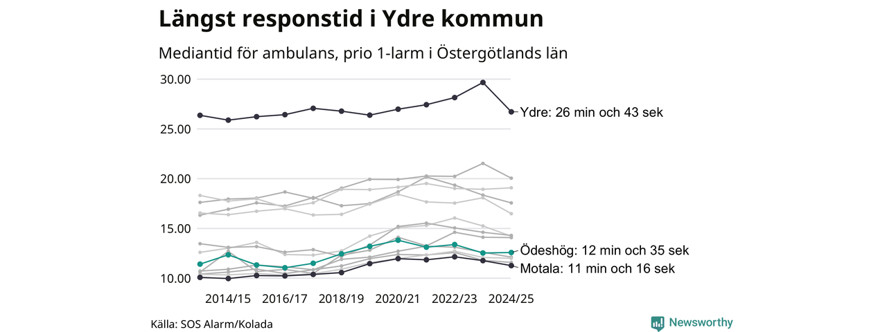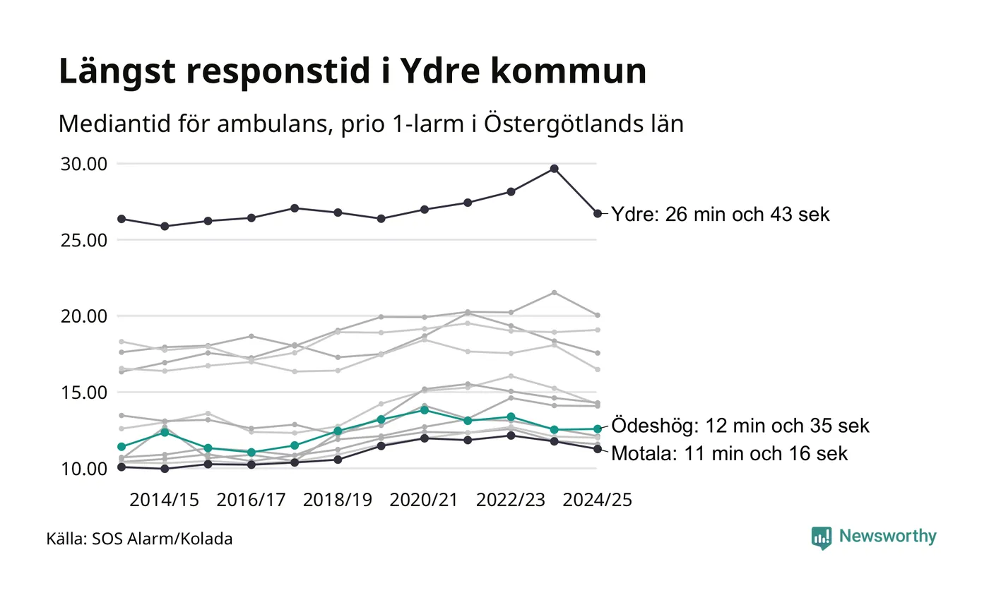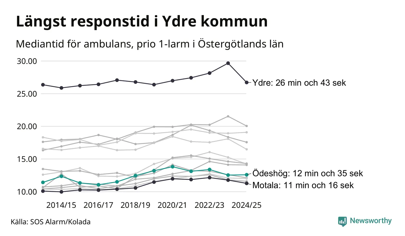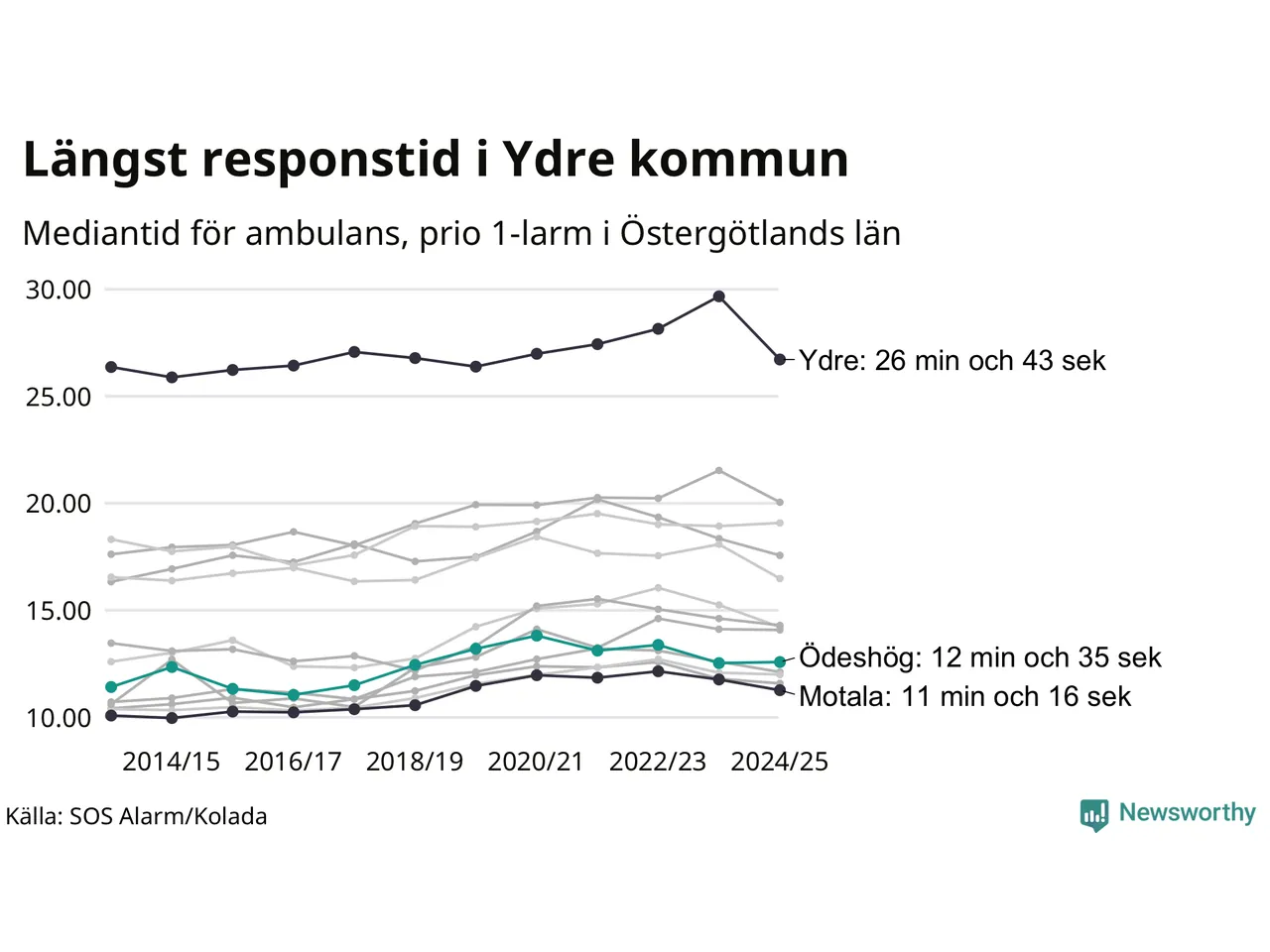 Det tar 12 minuter och 35 sekunder från att 112-samtalet når larmcentralen till att ambulansen är på plats i Ödeshögs kommun. Det visar de senaste siffrorna från SOS Alarm. Tiden är en mediantid för alla prio 1-larm mellan 1 juni 2024 och 31 maj 2025 och ett nyckeltal som redovisas varje år.
