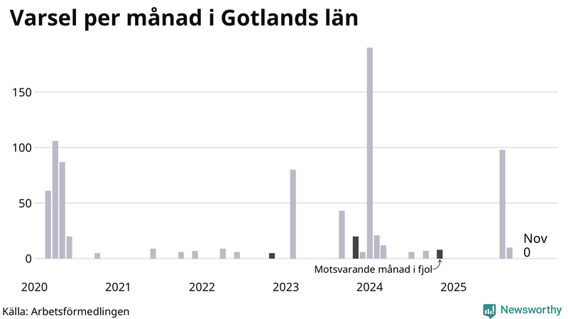 Inga varsel rapporterades på Gotland under november 2025. Senast något varsel rapporterades var i september 2025 – då berördes tio personer. För att arbetsgivare ska vara skyldiga att rapportera varsel krävs att minst fem personer berörs i länet – det kan alltså ha skett varsel som inte syns i statistiken. Det är inte ovanligt att det går månader utan några rapporterade varsel på Gotland.