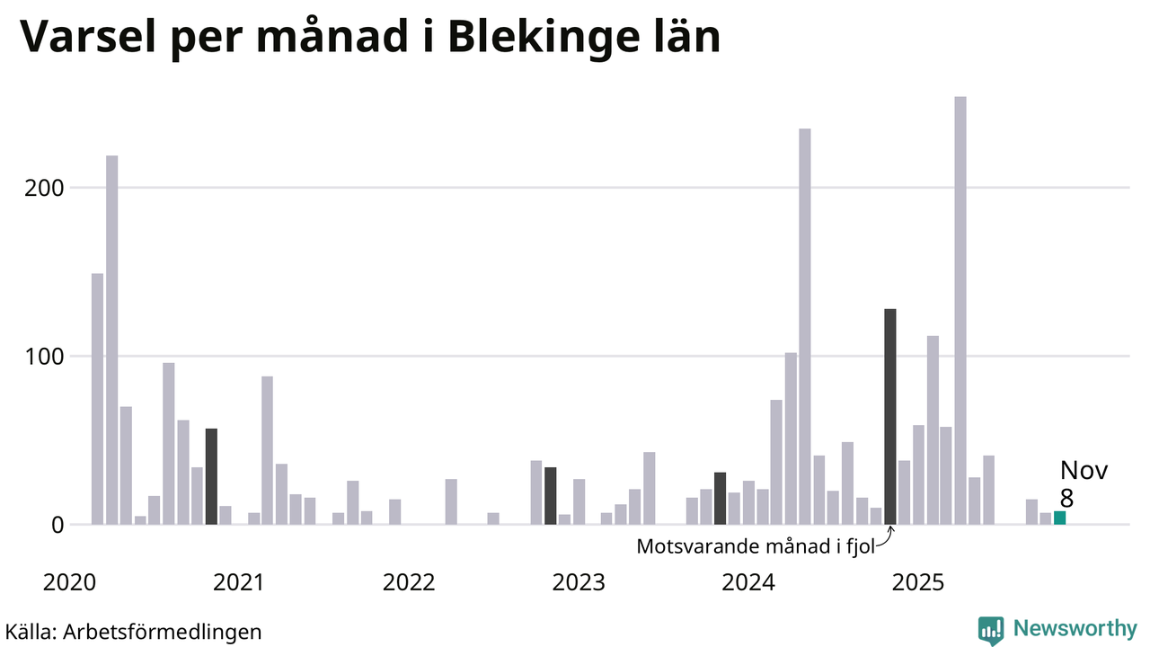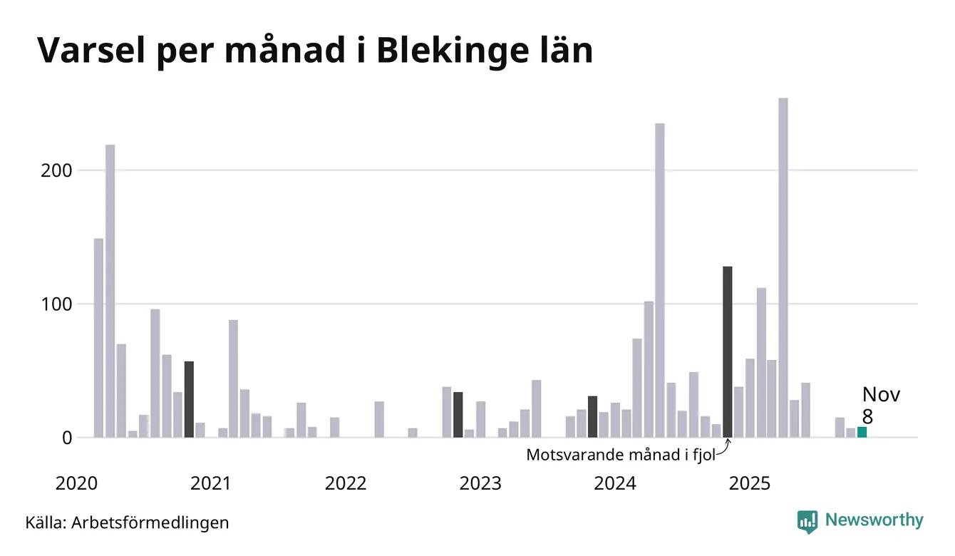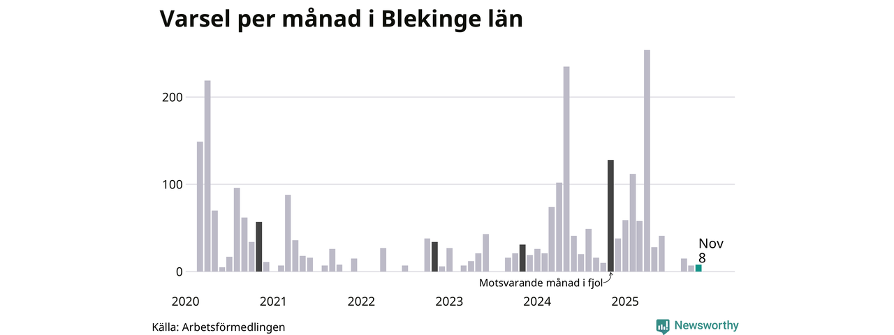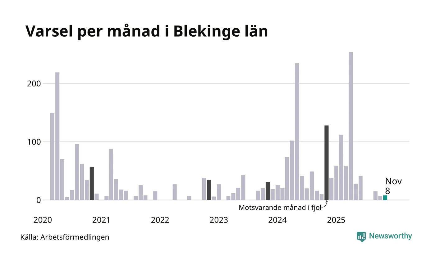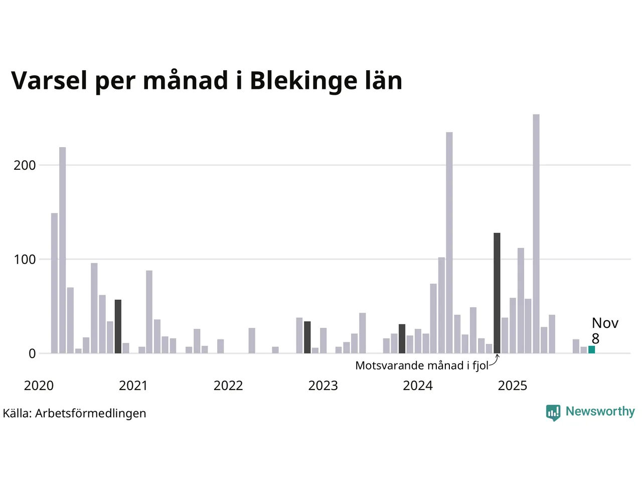 Åtta personer varslades om uppsägning i Blekinge under november 2025. Det är en fler än i oktober. För ett år sedan var antalet varsel 128 i länet. Sett över de tre senaste månaderna har totalt 30 varsel rapporterats i Blekinge, vilket är 124 färre än motsvarande period 2024. I början av pandemin, i april 2020, varslades som mest 219 personer under en månad i Blekinge.