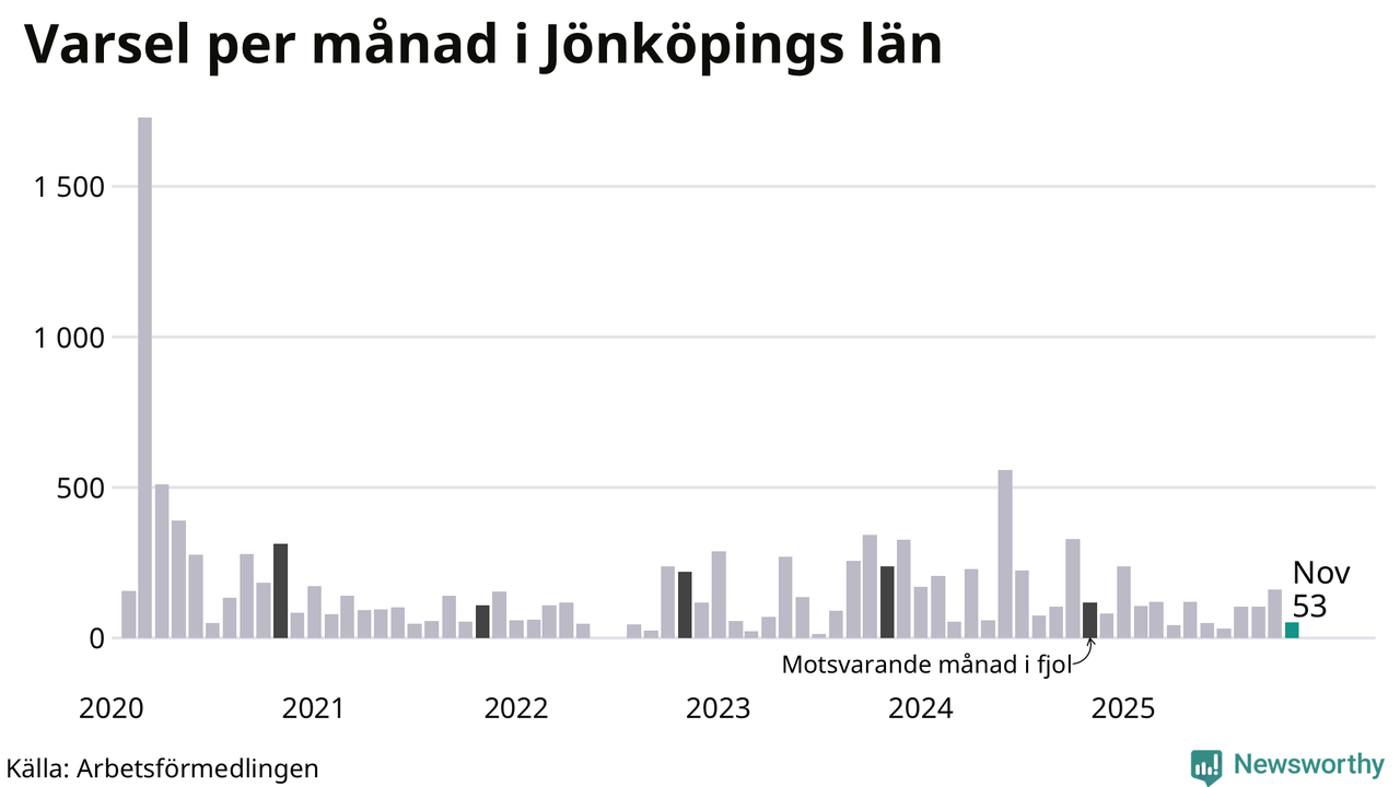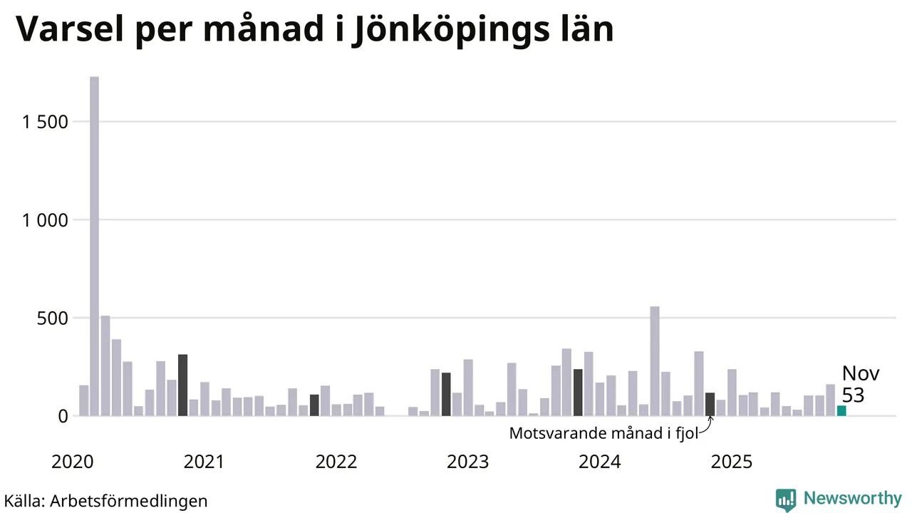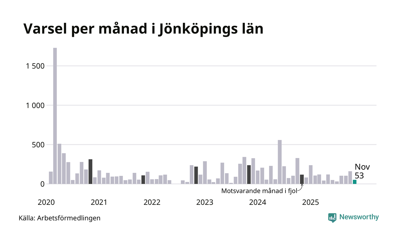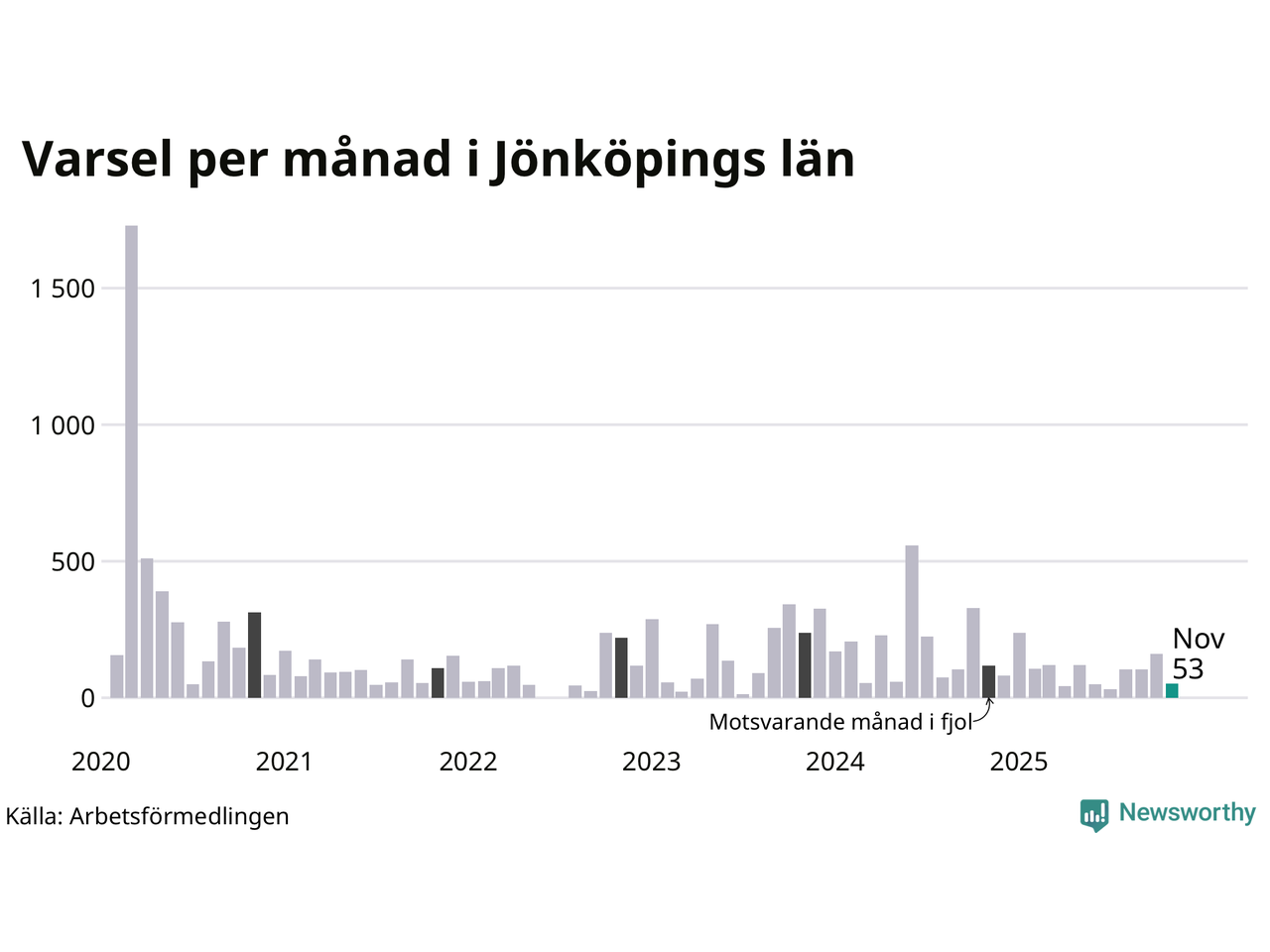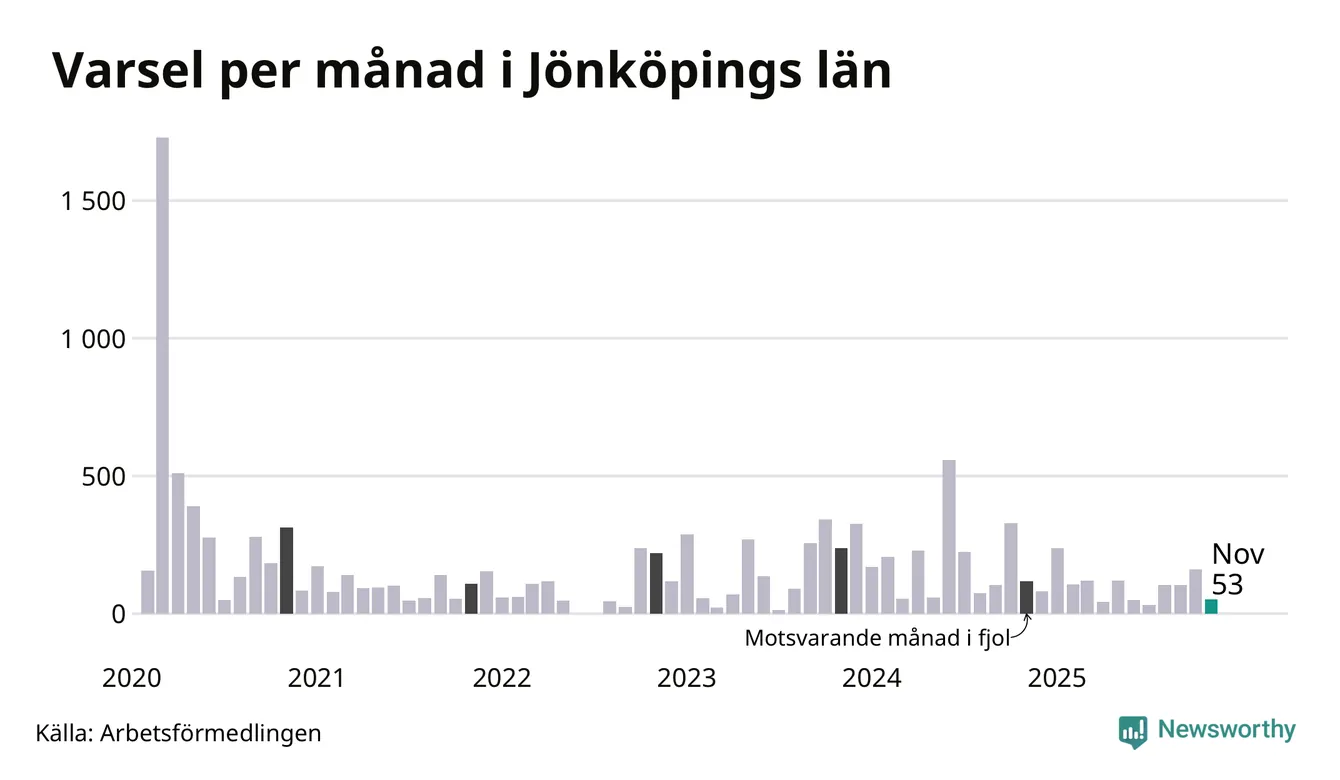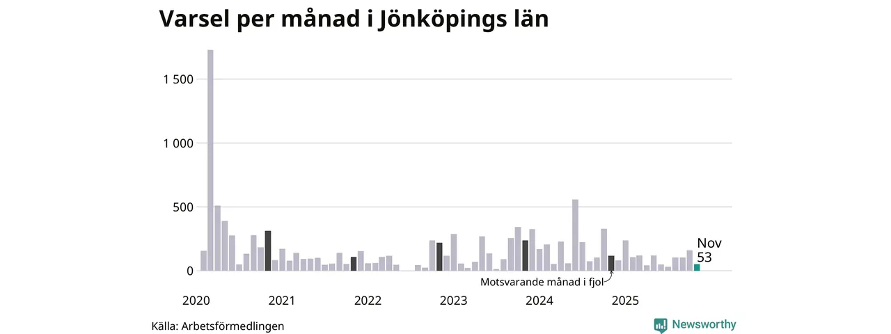 53 personer varslades om uppsägning i Jönköpings län under november 2025. Det är 107 färre än i oktober. För ett år sedan var antalet varsel 117 i länet. Sett över de tre senaste månaderna har totalt 317 varsel rapporterats i Jönköpings län, vilket är 233 färre än motsvarande period 2024. I början av pandemin, i mars 2020, varslades som mest 1 729 personer under en månad i Jönköpings län.
