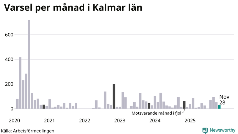 28 personer varslades om uppsägning i Kalmar län under november 2025. Det är 24 färre än i oktober. För ett år sedan var antalet varsel 64 i länet. Sett över de tre senaste månaderna har totalt 173 varsel rapporterats i Kalmar län, vilket är ett färre än motsvarande period 2024. I början av pandemin, i juni 2020, varslades som mest 719 personer under en månad i Kalmar län.