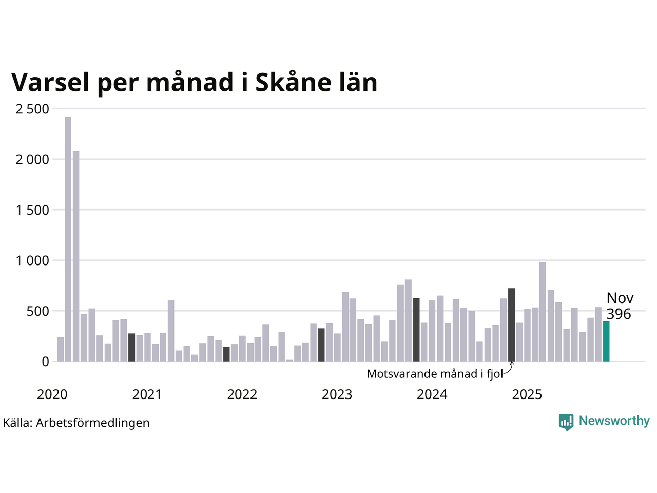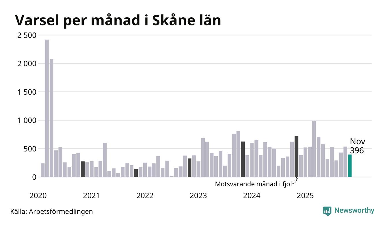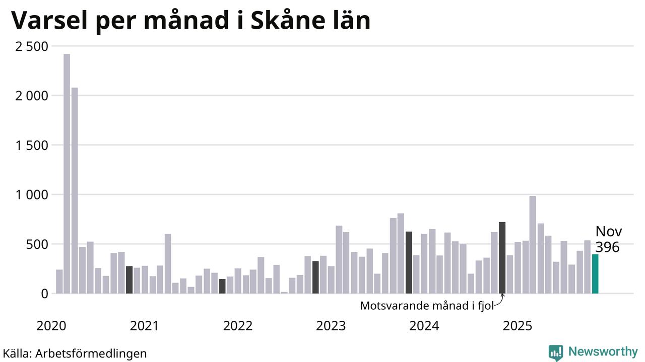 396 personer varslades om uppsägning i Skåne under november 2025. Det är 140 färre än i oktober. För ett år sedan var antalet varsel 724 i länet. Sett över de tre senaste månaderna har totalt 1 364 varsel rapporterats i Skåne, vilket är 345 färre än motsvarande period 2024. I början av pandemin, i mars 2020, varslades som mest 2 418 personer under en månad i Skåne.