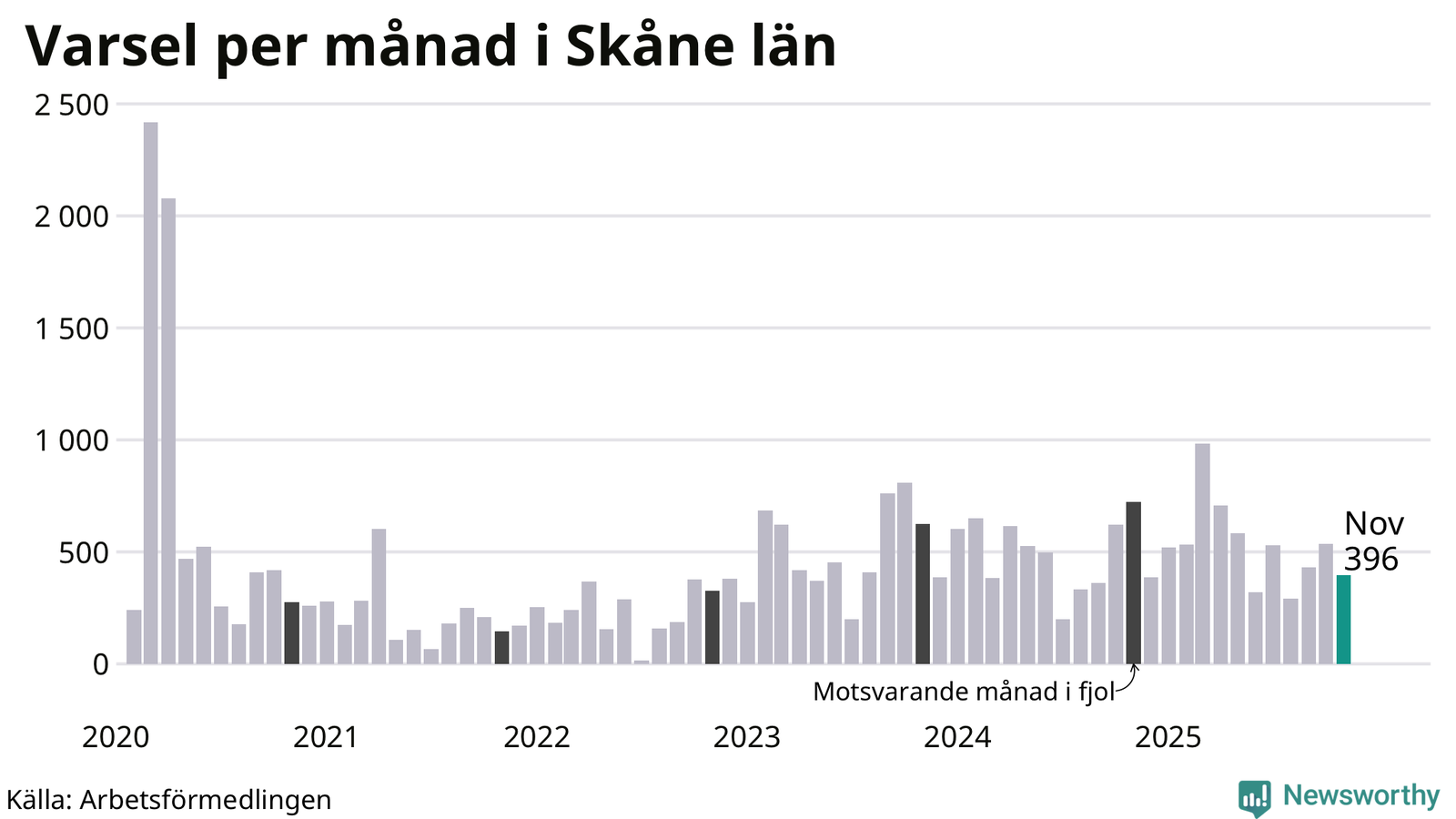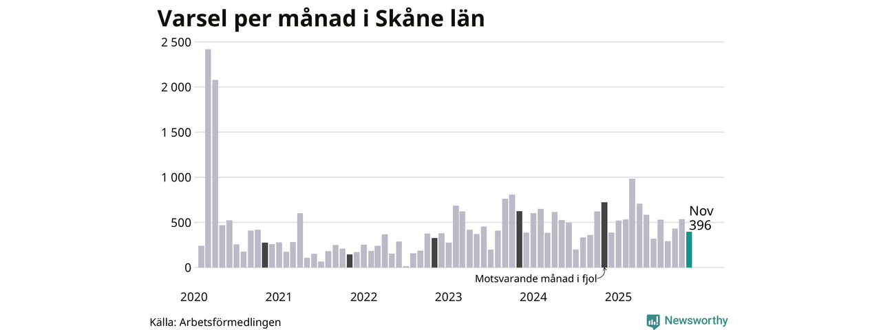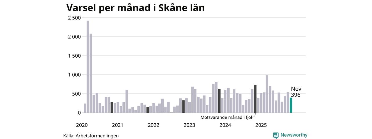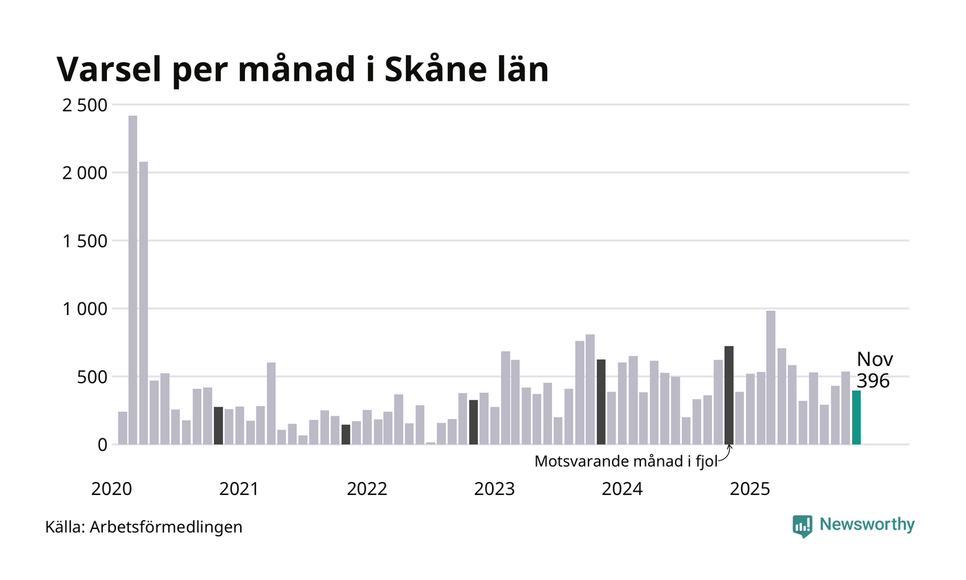 396 personer varslades om uppsägning i Skåne under november 2025. Det är 140 färre än i oktober. För ett år sedan var antalet varsel 724 i länet. Sett över de tre senaste månaderna har totalt 1 364 varsel rapporterats i Skåne, vilket är 345 färre än motsvarande period 2024. I början av pandemin, i mars 2020, varslades som mest 2 418 personer under en månad i Skåne.