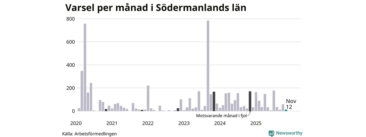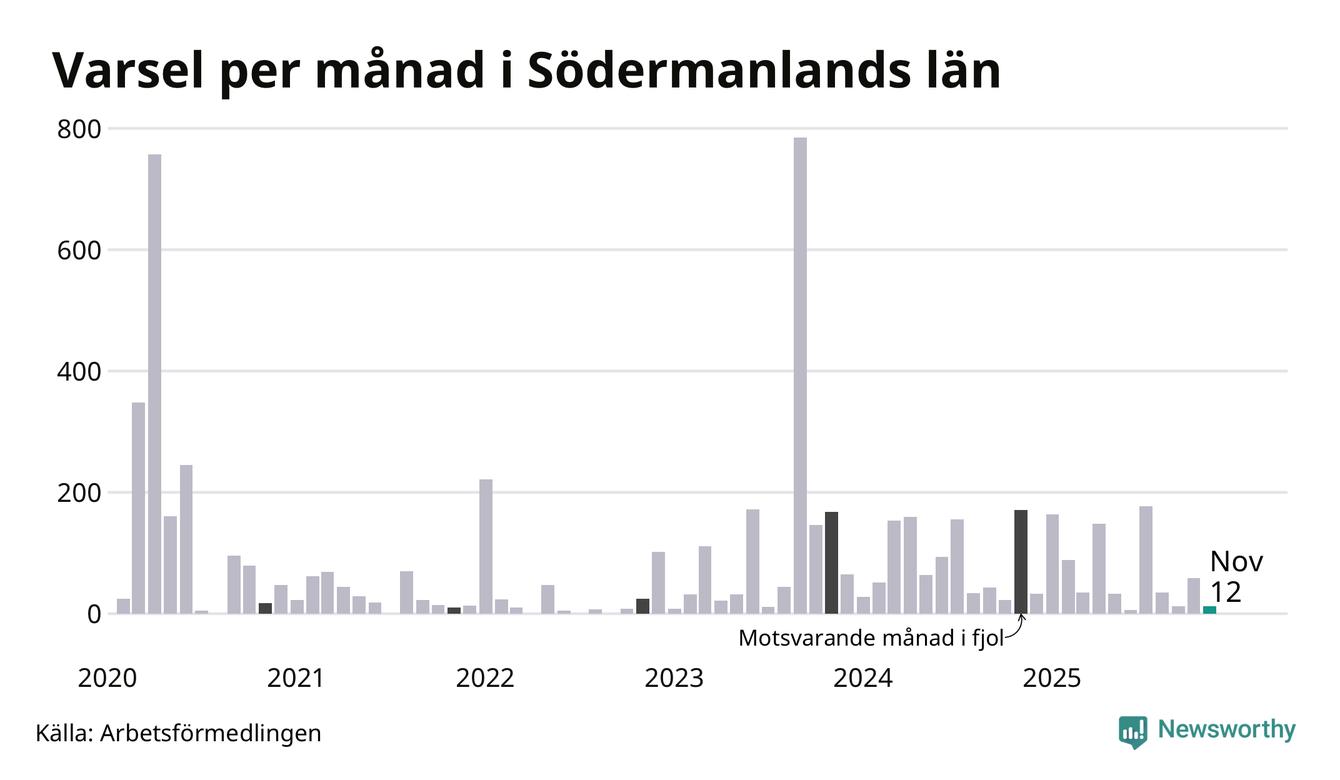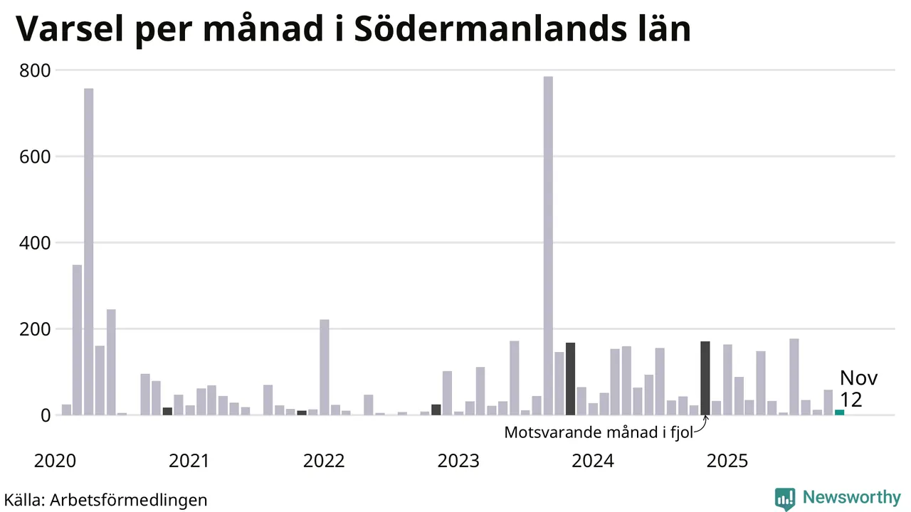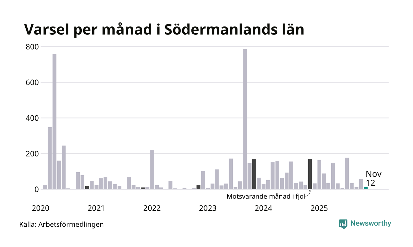 Tolv personer varslades om uppsägning i Södermanland under november 2025. Det är 47 färre än i oktober. För ett år sedan var antalet varsel 171 i länet. Sett över de tre senaste månaderna har totalt 83 varsel rapporterats i Södermanland, vilket är 154 färre än motsvarande period 2024. I början av pandemin, i april 2020, varslades som mest 757 personer under en månad i Södermanland.