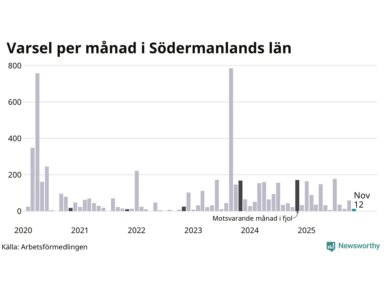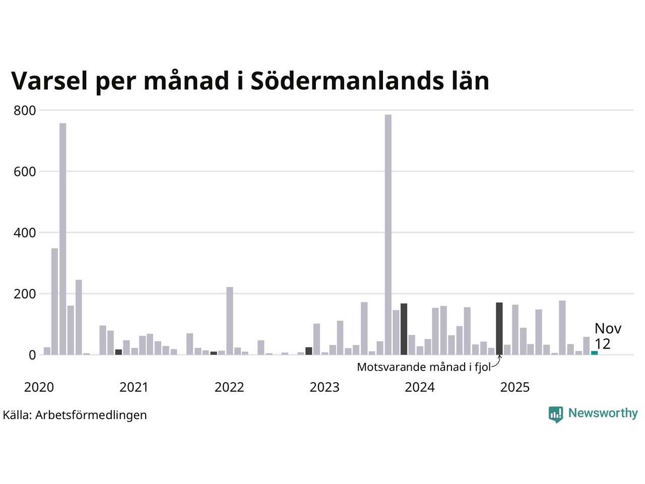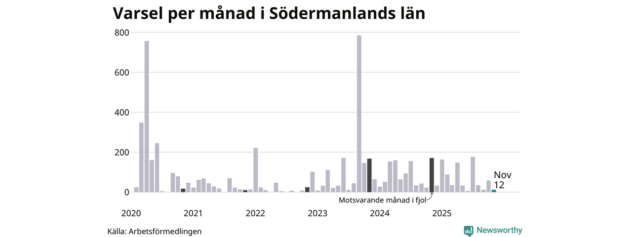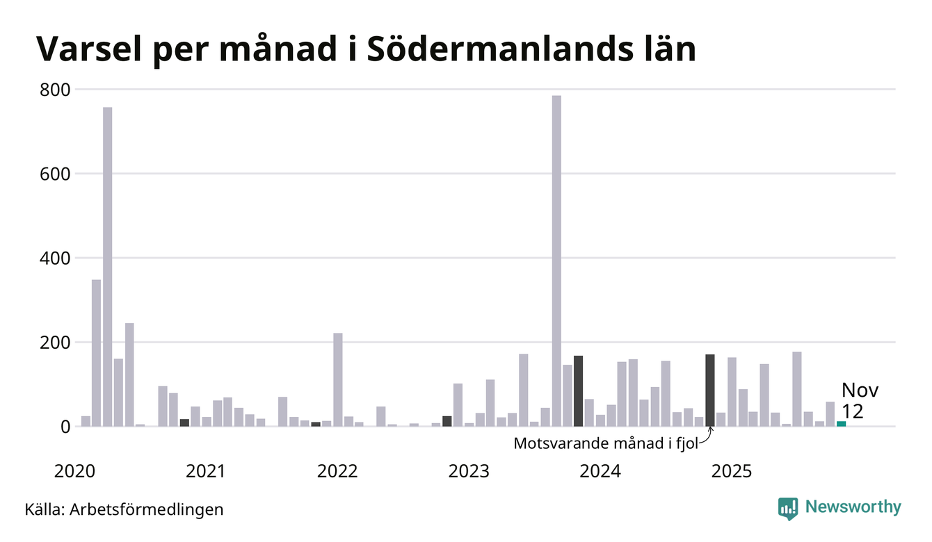 Tolv personer varslades om uppsägning i Södermanland under november 2025. Det är 47 färre än i oktober. För ett år sedan var antalet varsel 171 i länet. Sett över de tre senaste månaderna har totalt 83 varsel rapporterats i Södermanland, vilket är 154 färre än motsvarande period 2024. I början av pandemin, i april 2020, varslades som mest 757 personer under en månad i Södermanland.