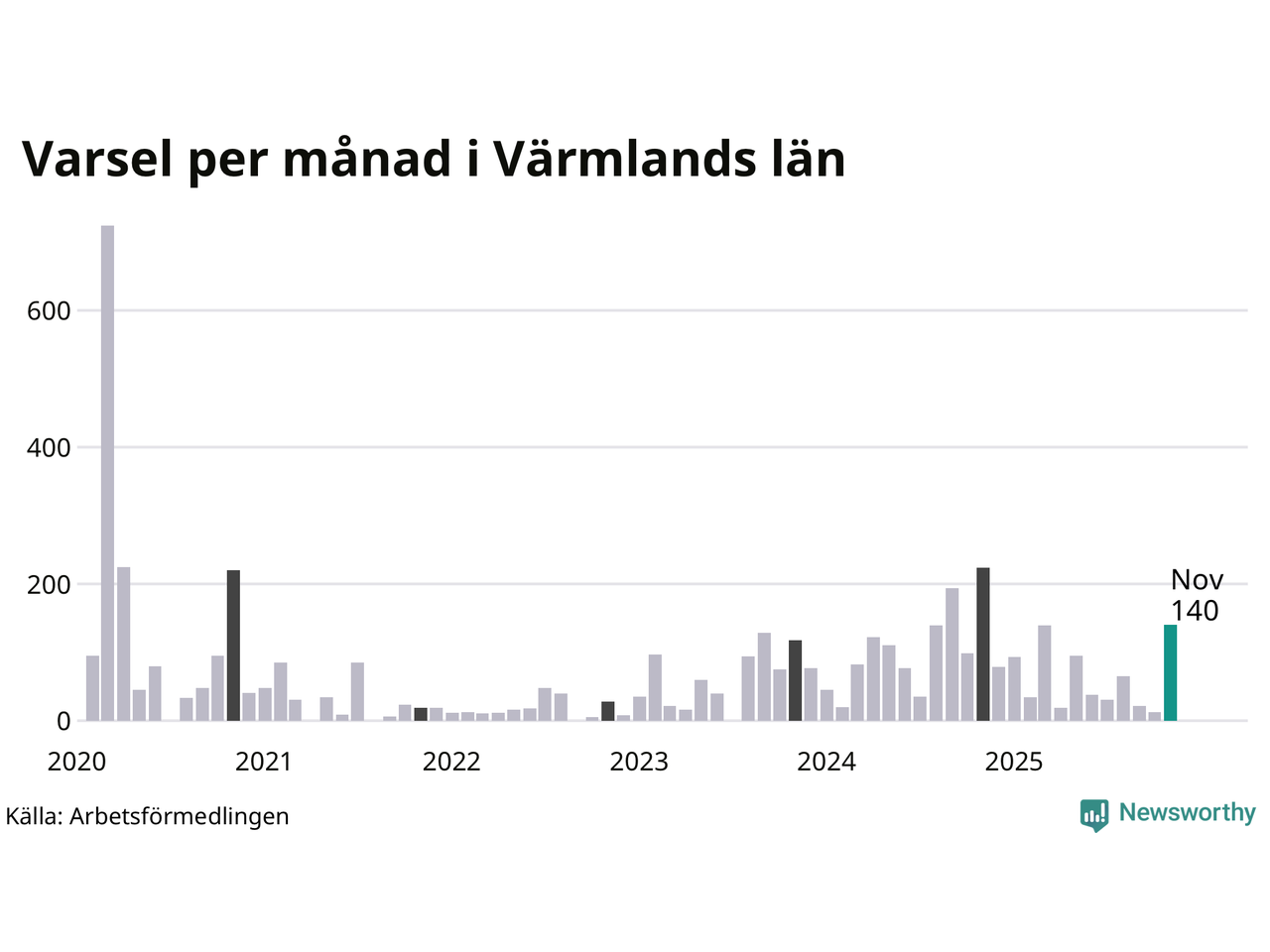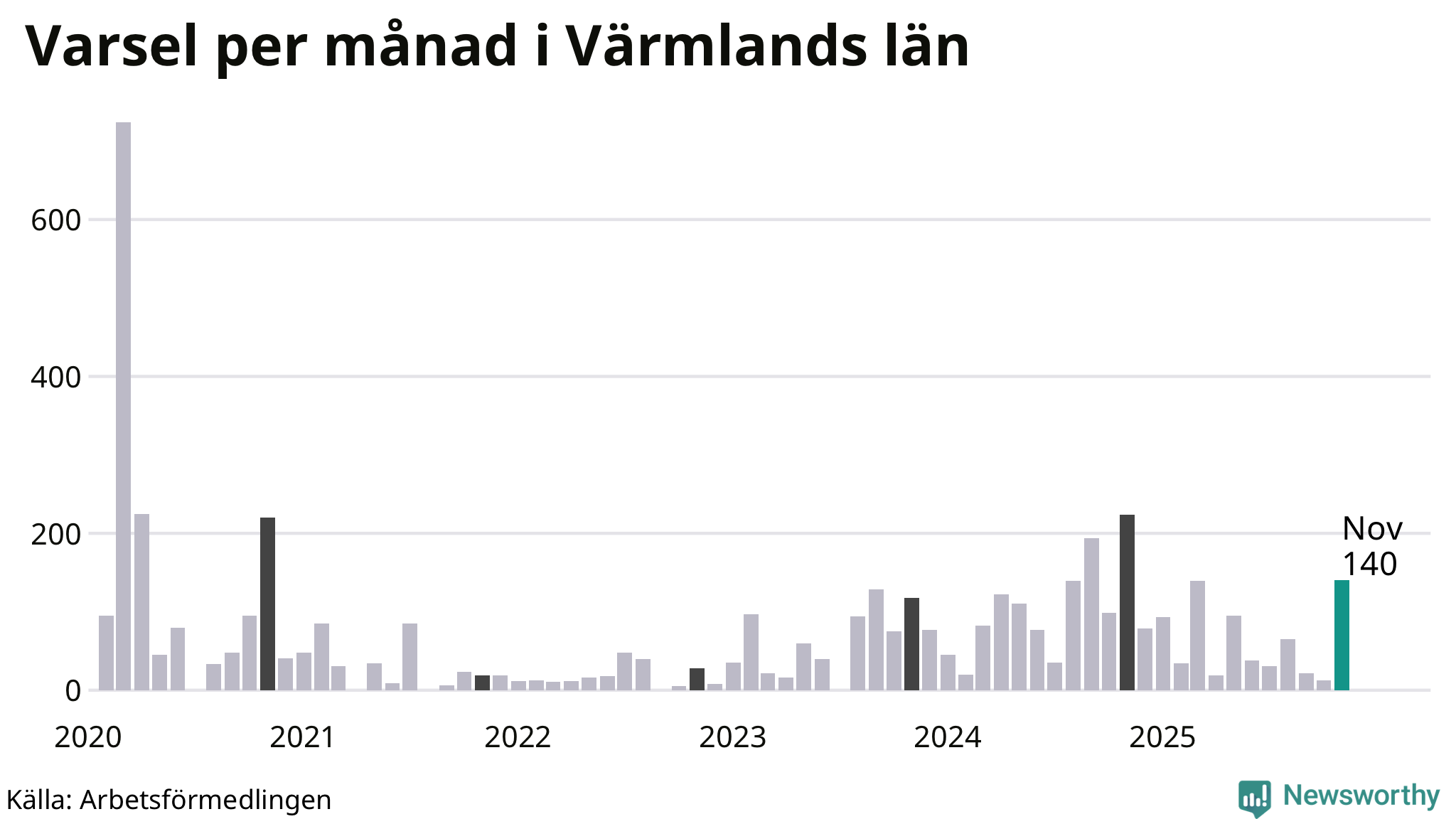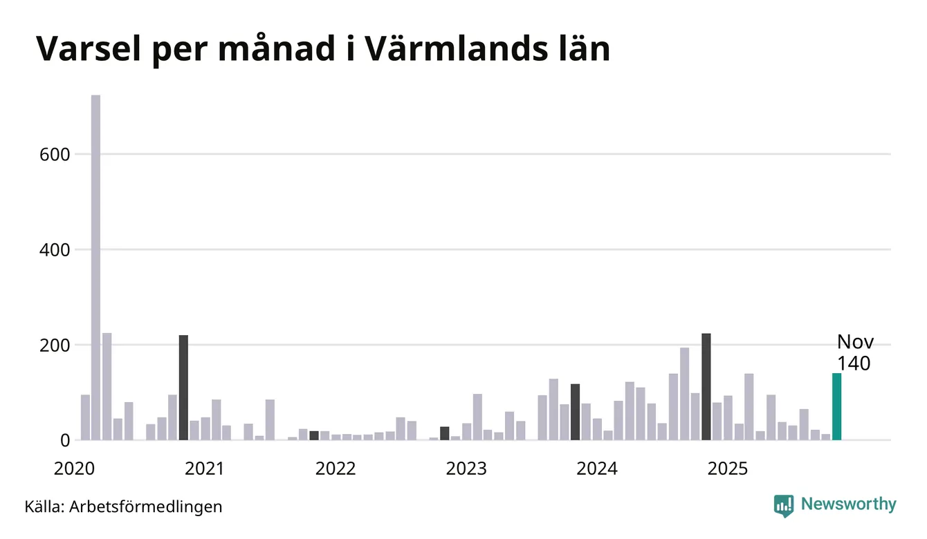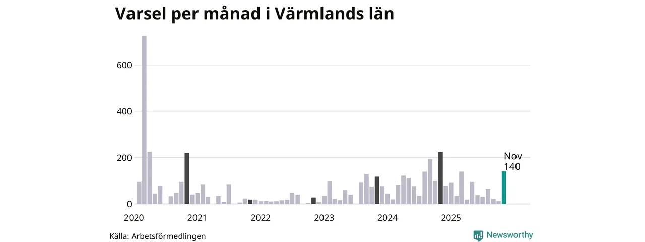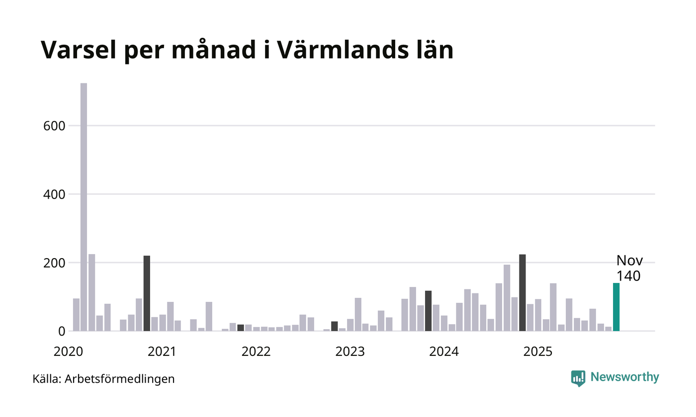 140 personer varslades om uppsägning i Värmland under november 2025. Det är 127 fler än i oktober och den högsta siffran sedan november 2024. Däremot är det fortfarande betydligt färre än i början av pandemin, i mars 2020, då 724 personer varslades i Värmland. Sett över de tre senaste månaderna har totalt 175 varsel rapporterats i Värmland, vilket är 342 färre än motsvarande period 2024. I början av pandemin, i mars 2020, varslades som mest 724 personer under en månad i Värmland.