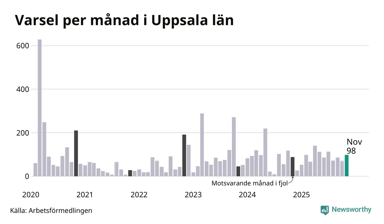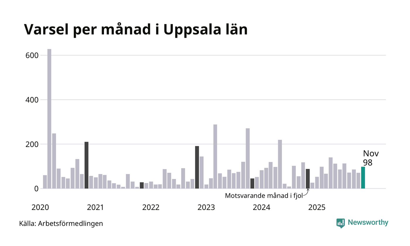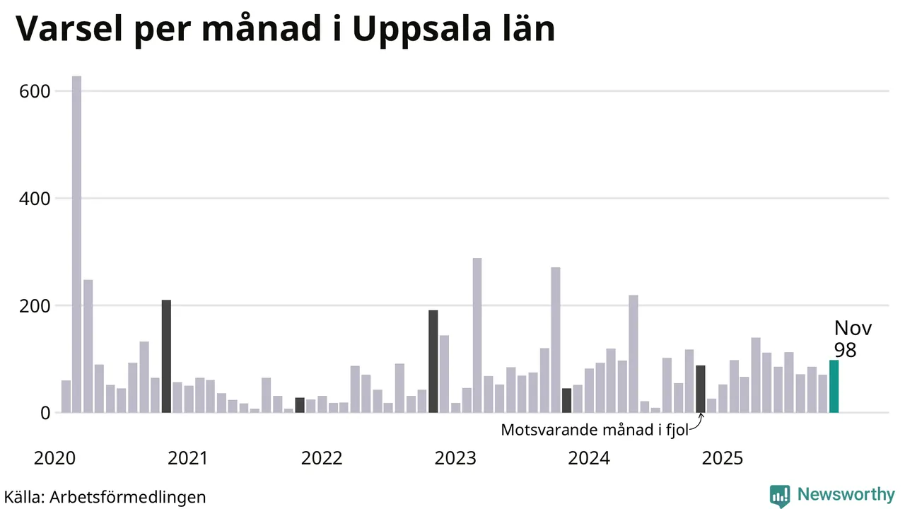 98 personer varslades om uppsägning i Uppsala län under november 2025. Det är 27 fler än i oktober. För ett år sedan var antalet varsel 88 i länet. Sett över de tre senaste månaderna har totalt 255 varsel rapporterats i Uppsala län, vilket är sex färre än motsvarande period 2024. I början av pandemin, i mars 2020, varslades som mest 628 personer under en månad i Uppsala län.