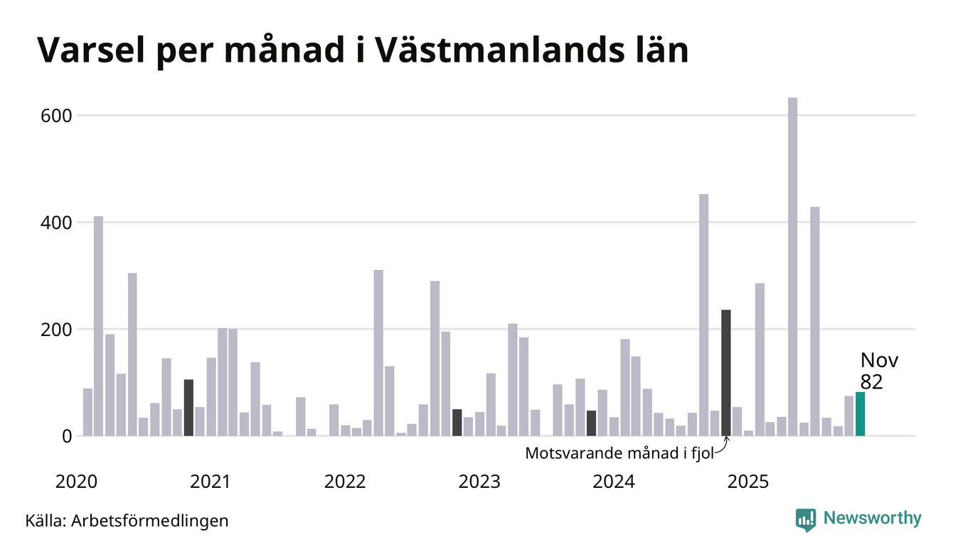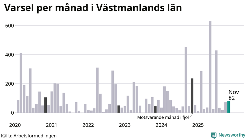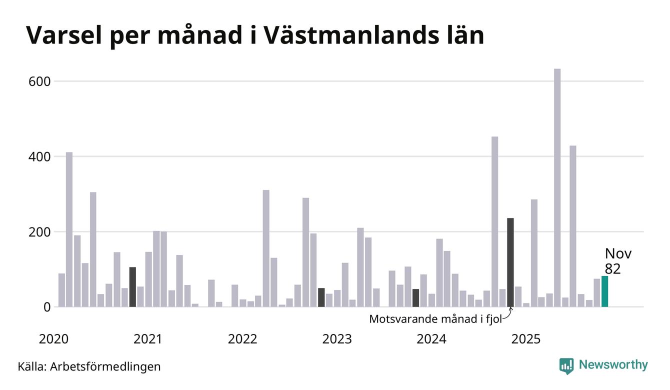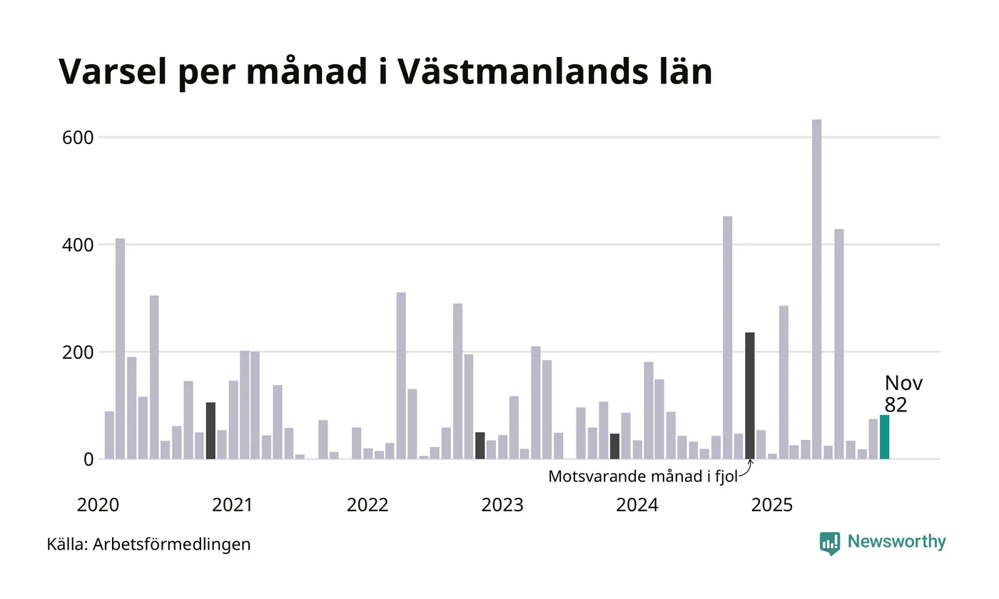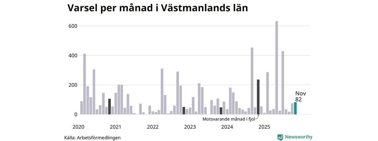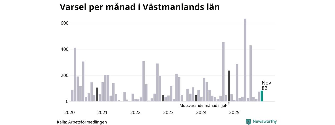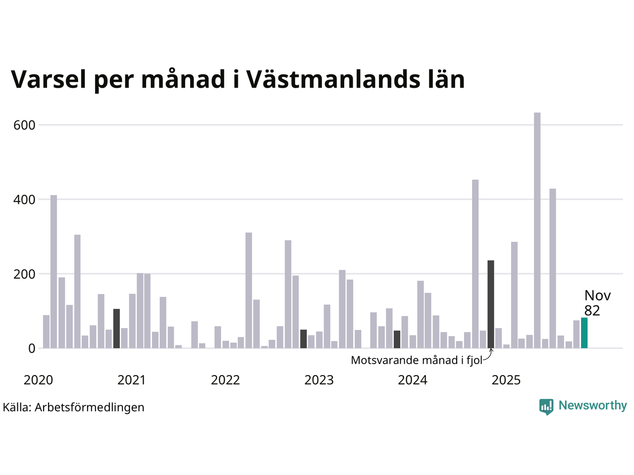 82 personer varslades om uppsägning i Västmanland under november 2025. Det är sju fler än i oktober. För ett år sedan var antalet varsel 236 i länet. Sett över de tre senaste månaderna har totalt 175 varsel rapporterats i Västmanland, vilket är 561 färre än motsvarande period 2024. I början av pandemin, i mars 2020, varslades som mest 411 personer under en månad i Västmanland.