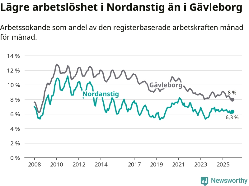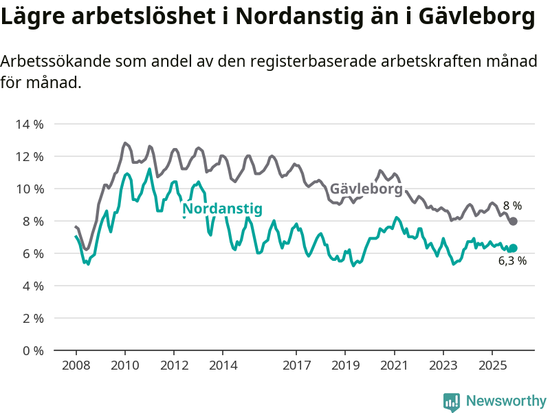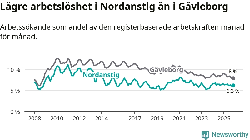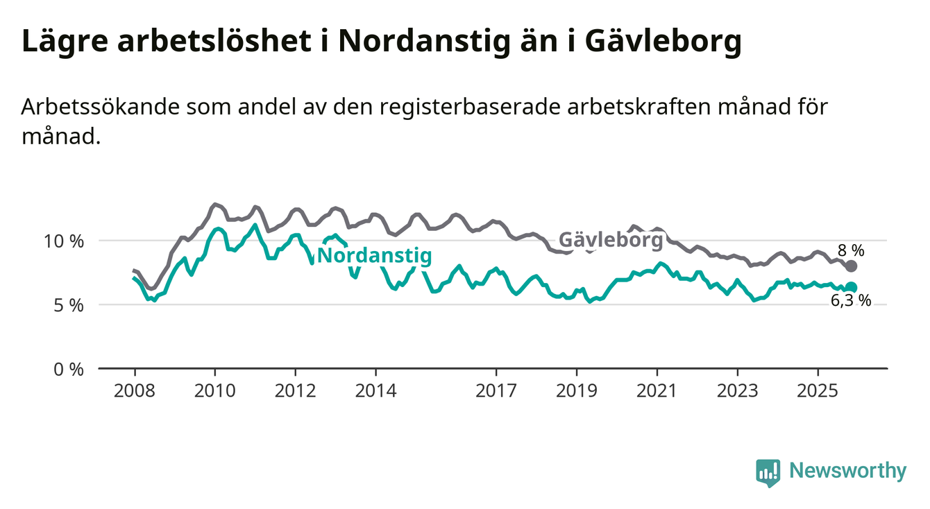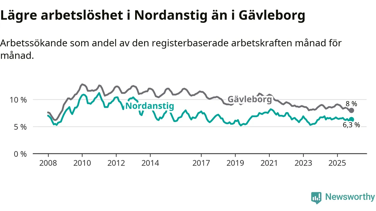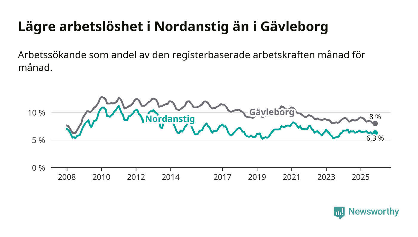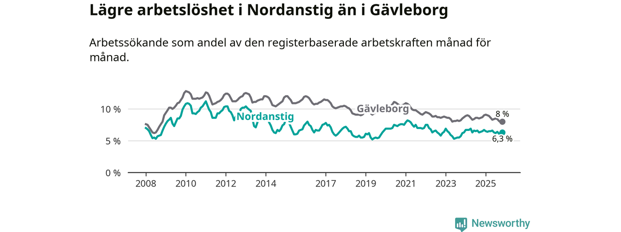Under november månad rapporterade Nordanstigs kommun en total arbetslöshet på 6,3 procent. Det är en minskning jämfört med samma tidpunkt i fjol (−0,2 procentenheter). Även i Gävleborgs län sjunker arbetslösheten .