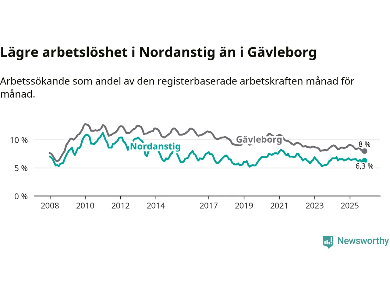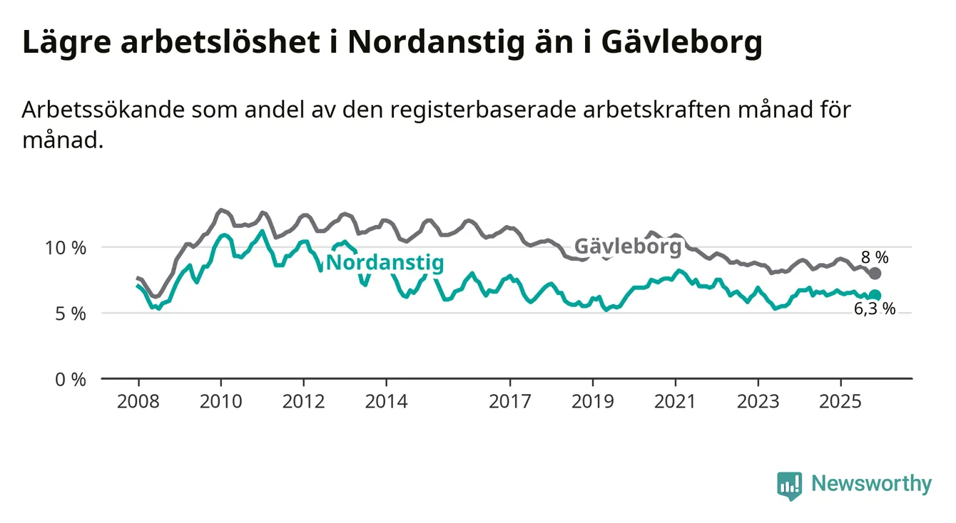 Nordanstig hade redan tidigare lägre arbetslöshet än snittet i hela Gävleborgs län och nu växer klyftan (6,3 procent i kommunen, jämfört med 8,0 procent i hela länet). Hudiksvall har den lägsta arbetslösheten i länet (5,7 procent), medan Söderhamn har den högsta (9,0 procent). För att Nordanstig skulle komma ner i samma arbetslöshetsnivå som Hudiksvall skulle 24 personer behöva sysselsättas.