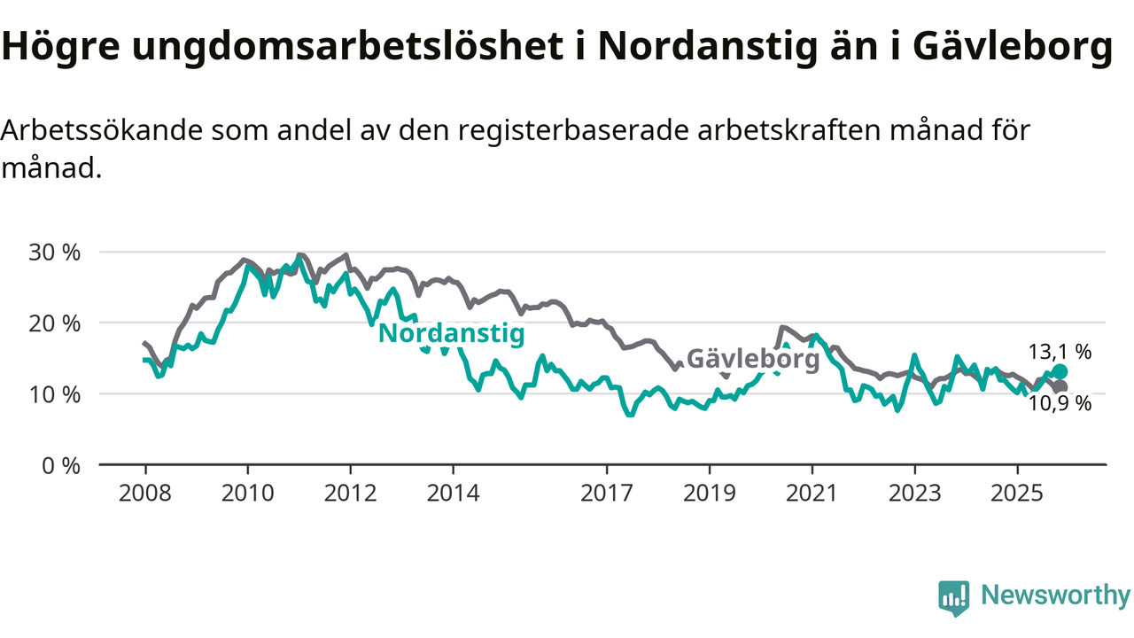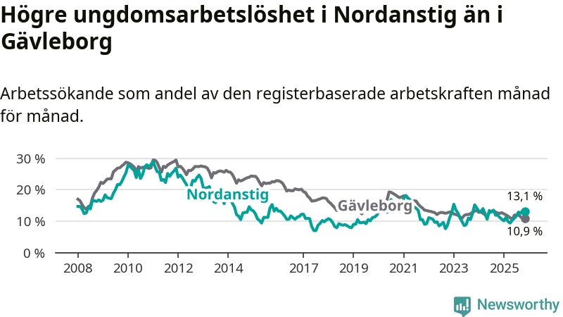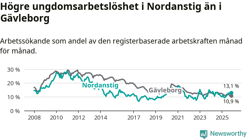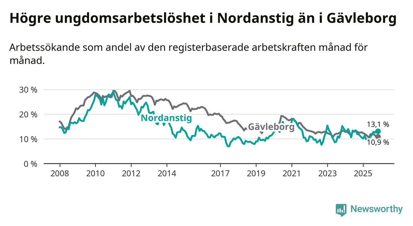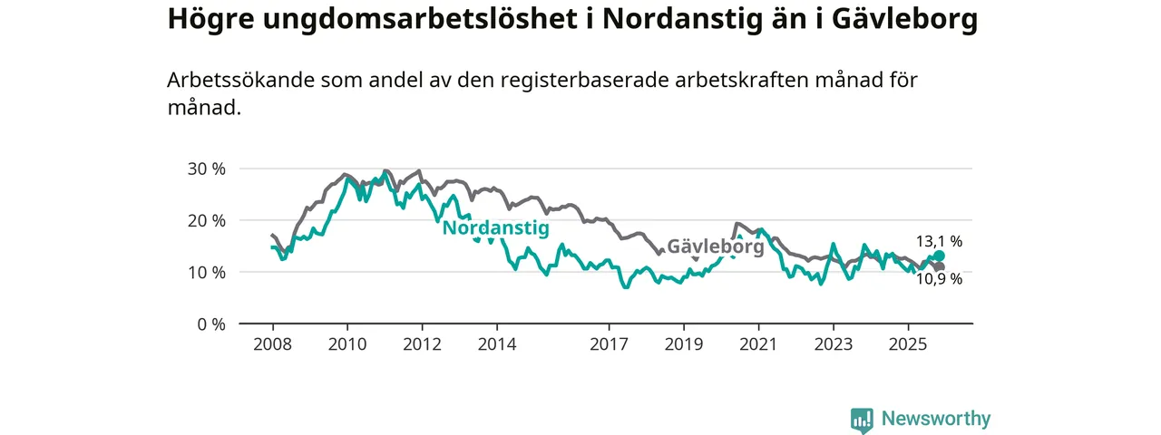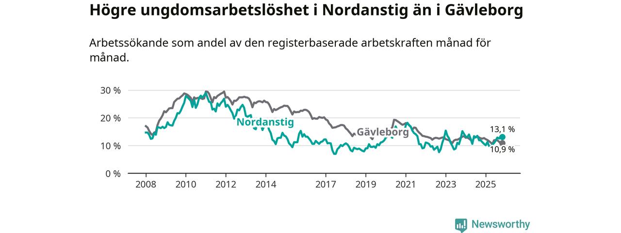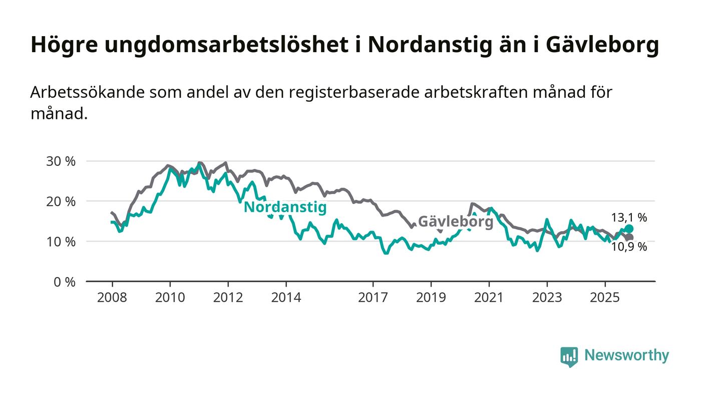 Medan Nordanstig har lägre total arbetslöshet än Gävleborg, ligger ungdomsarbetslösheten 2,2 procentenheter högre i Nordanstig.