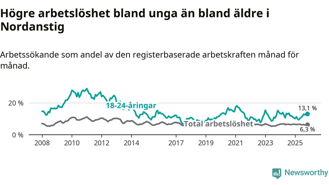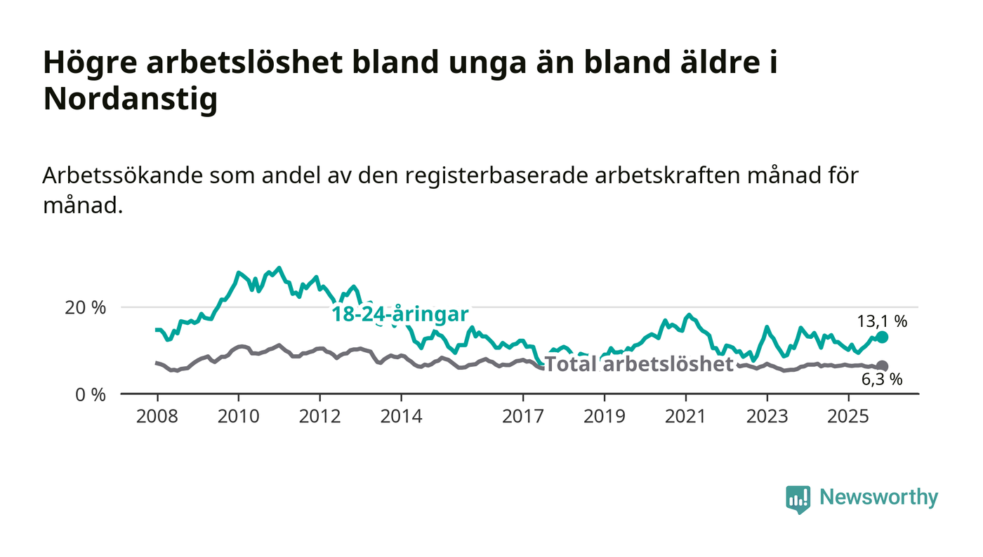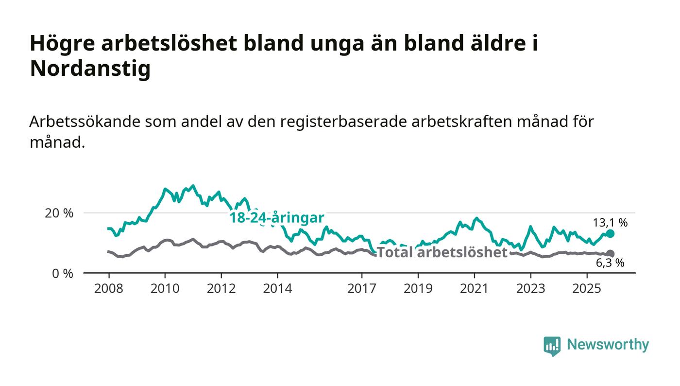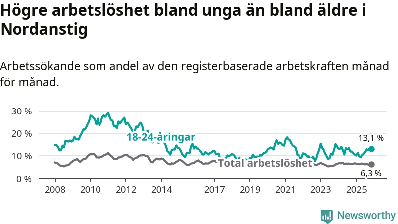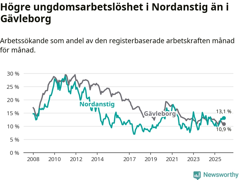 Medan Nordanstig har lägre total arbetslöshet än Gävleborg, ligger ungdomsarbetslösheten 2,2 procentenheter högre i Nordanstig.