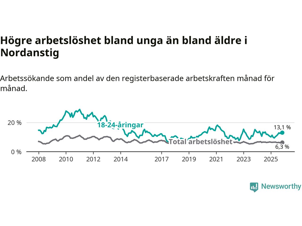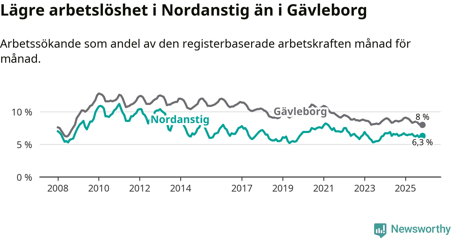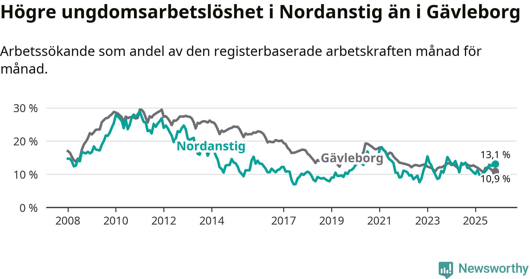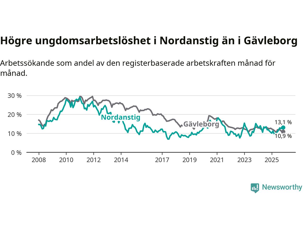 Medan Nordanstig har lägre total arbetslöshet än Gävleborg, ligger ungdomsarbetslösheten 2,2 procentenheter högre i Nordanstig.
