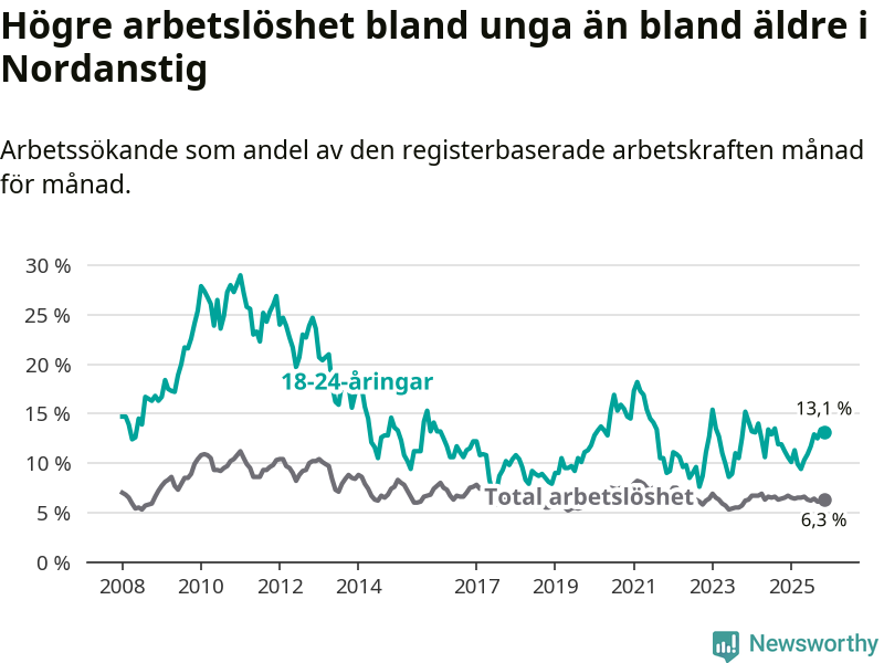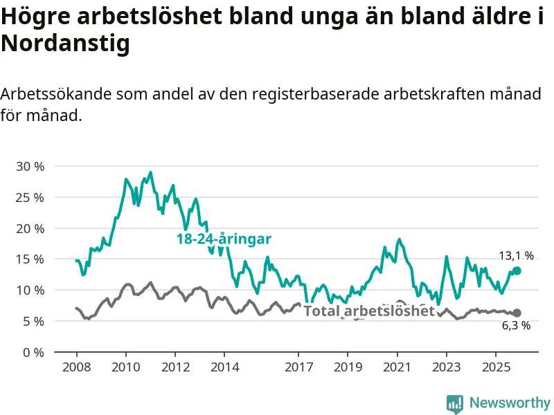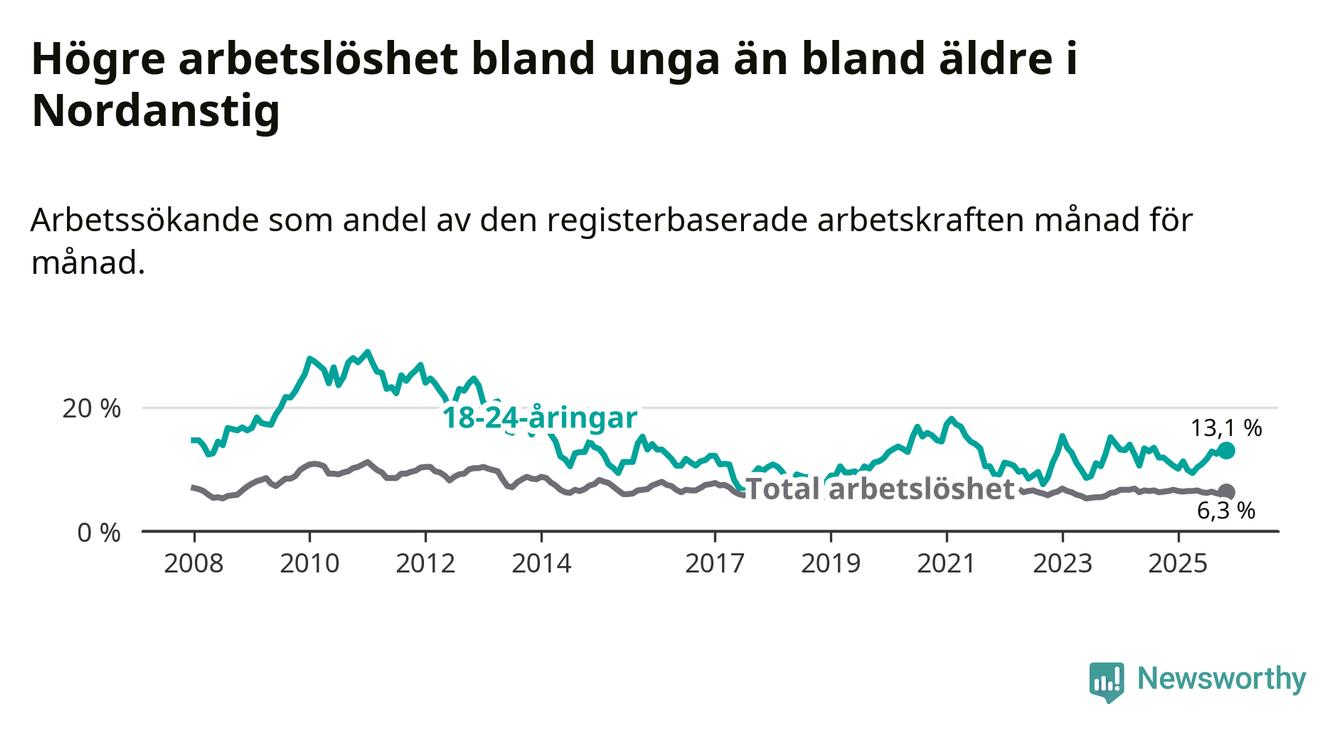 Till skillnad från den totala arbetslösheten stiger arbetslösheten bland unga (+1,9 procentenheter). I november var 13,1 procent av 18–24-åringarna inskrivna som arbetssökande (motsvarande 46 personer). Mäter vi antalet inskrivna ser vi en ökning med sex personer på ett års sikt.