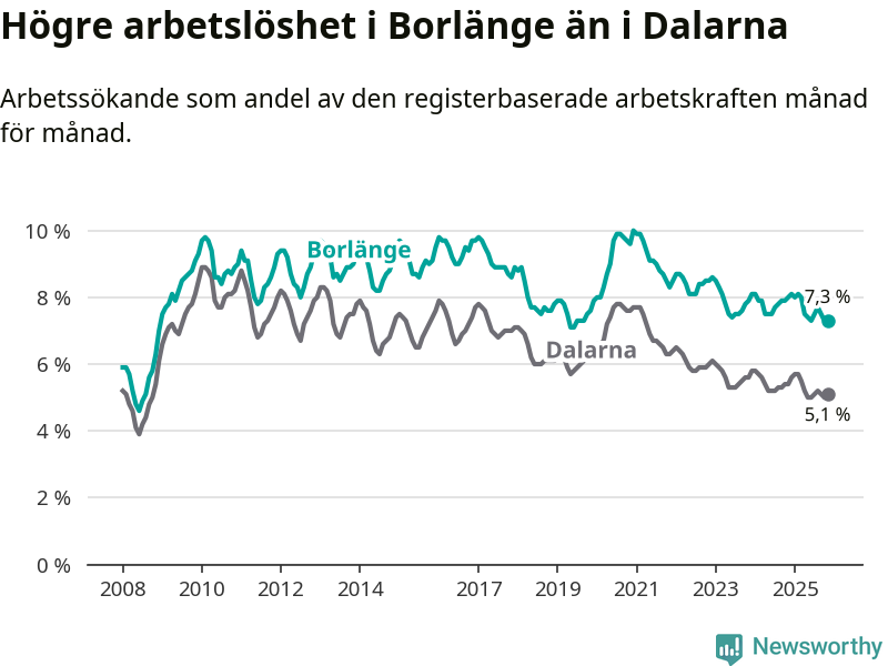 Även om arbetslösheten i Borlänge alltså minskar, så ligger den fortfarande över snittet i hela Dalarnas län (7,3 procent i kommunen, jämfört med 5,1 procent i hela länet). Mora har den lägsta arbetslösheten i länet (3,2 procent), medan Avesta har den högsta (7,5 procent). För att Borlänge skulle komma ner i samma arbetslöshetsnivå som Mora skulle 1 032 personer behöva sysselsättas.