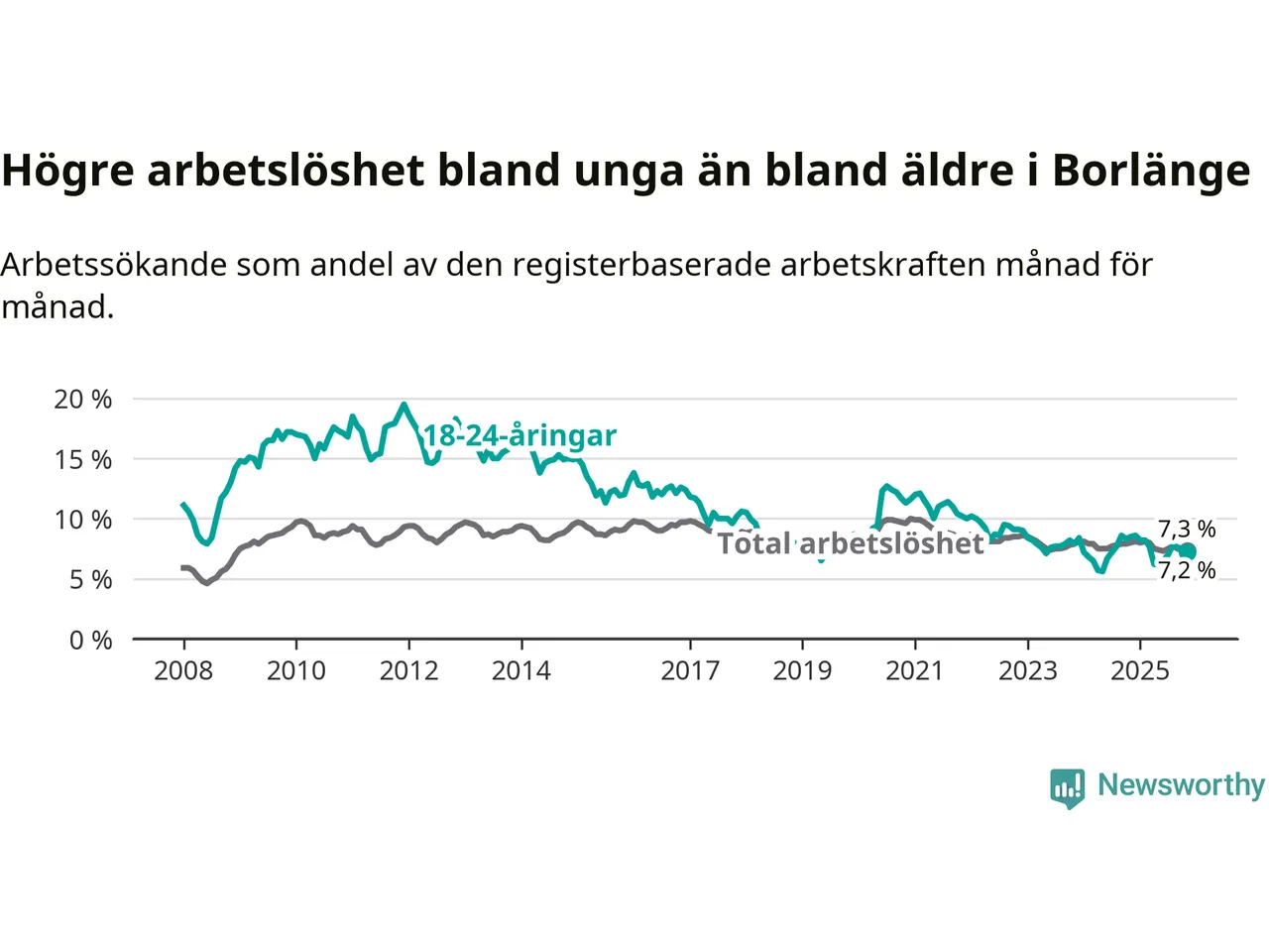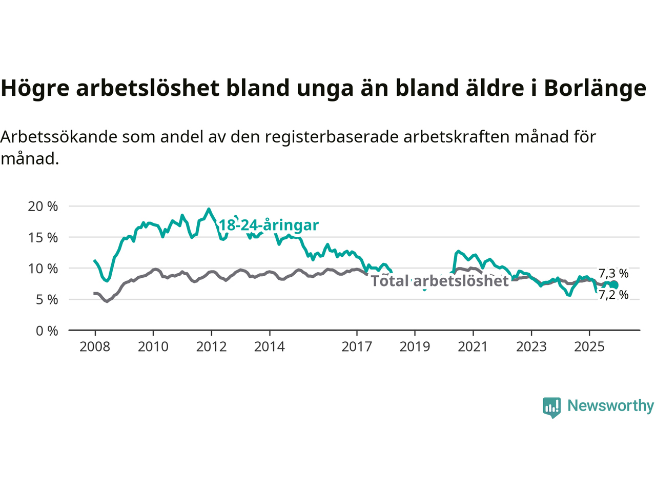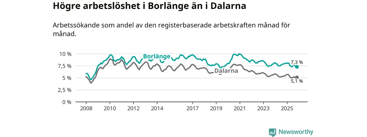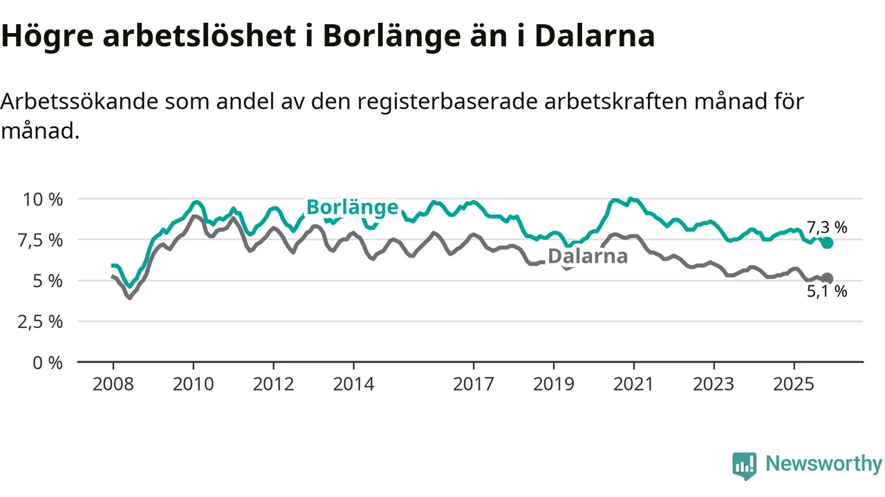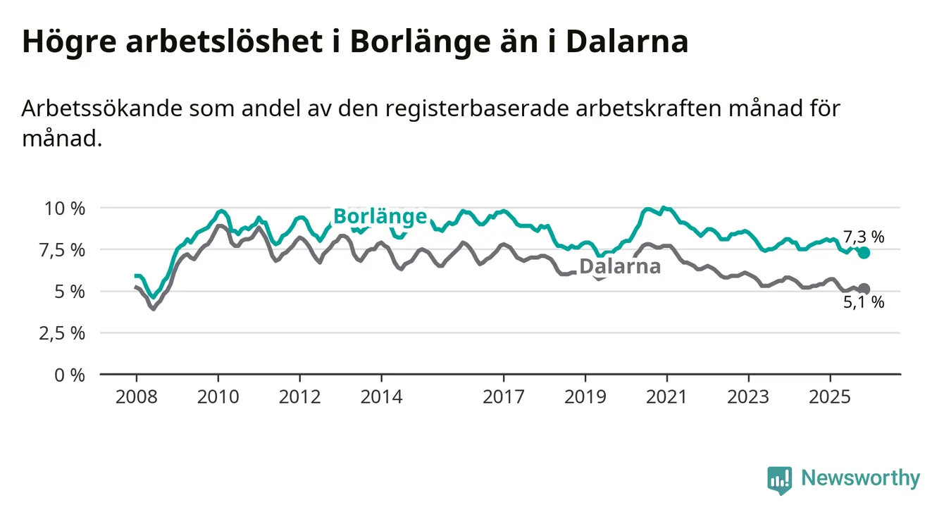 Under november månad rapporterade Borlänge kommun en total arbetslöshet på 7,3 procent. Det är en minskning jämfört med samma tidpunkt i fjol (−0,7 procentenheter). Även i Dalarnas län sjunker arbetslösheten .