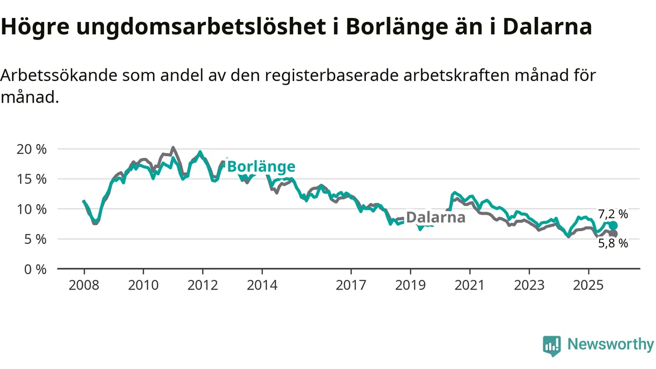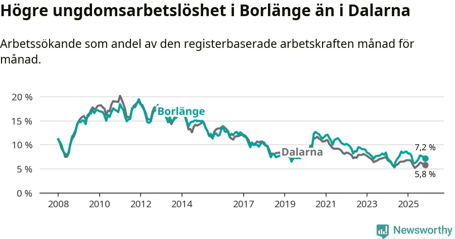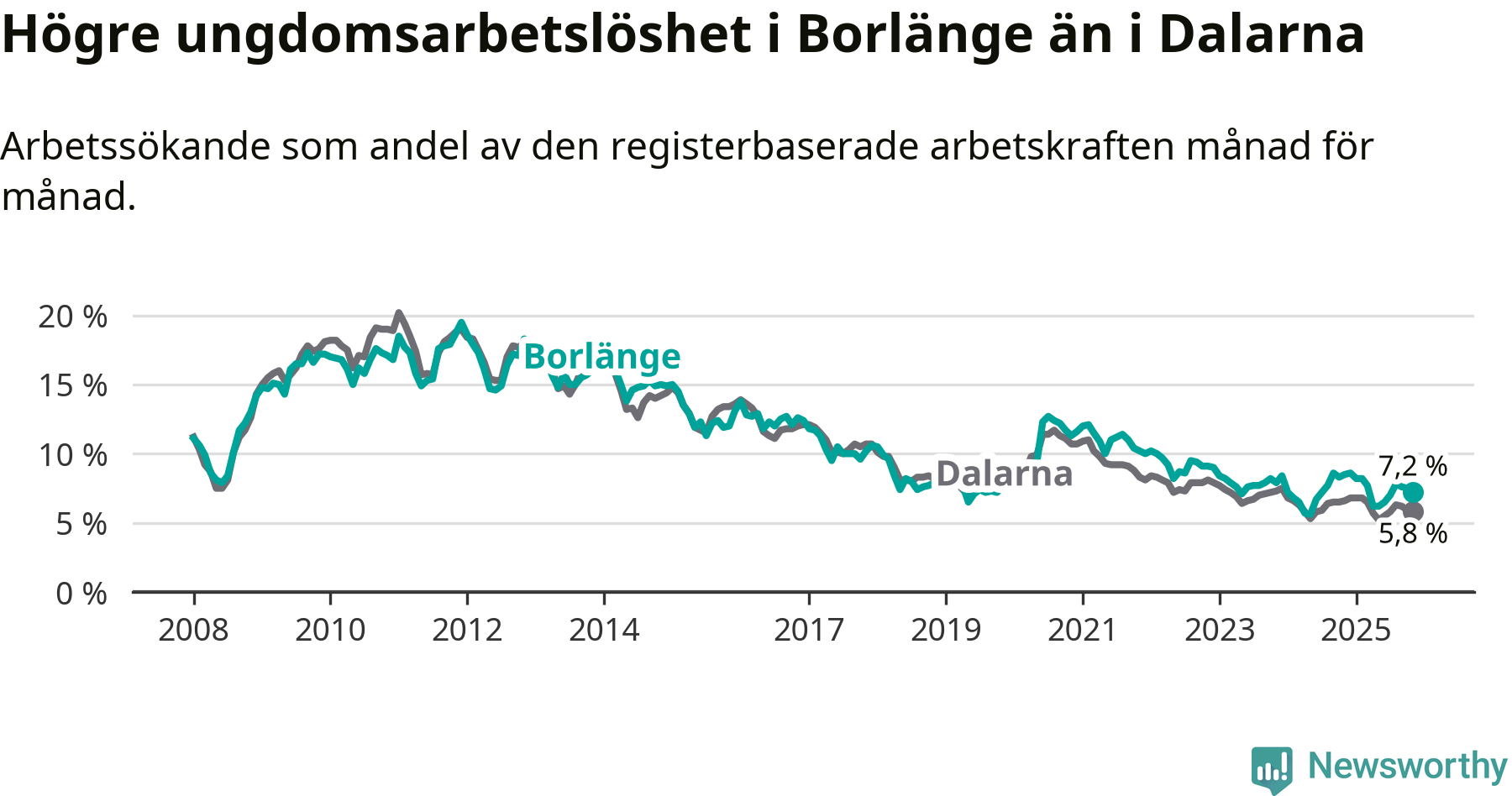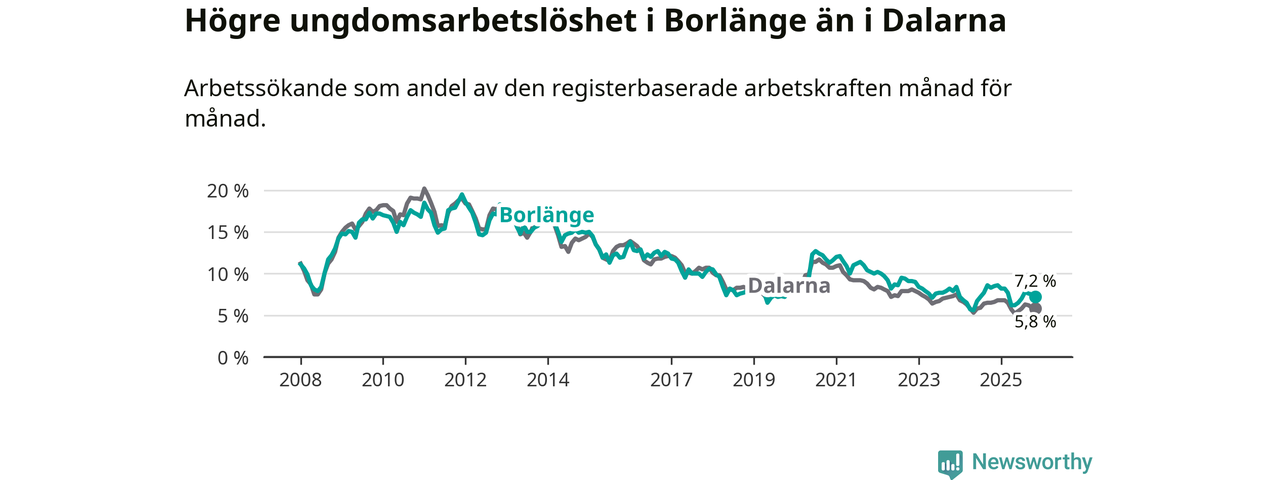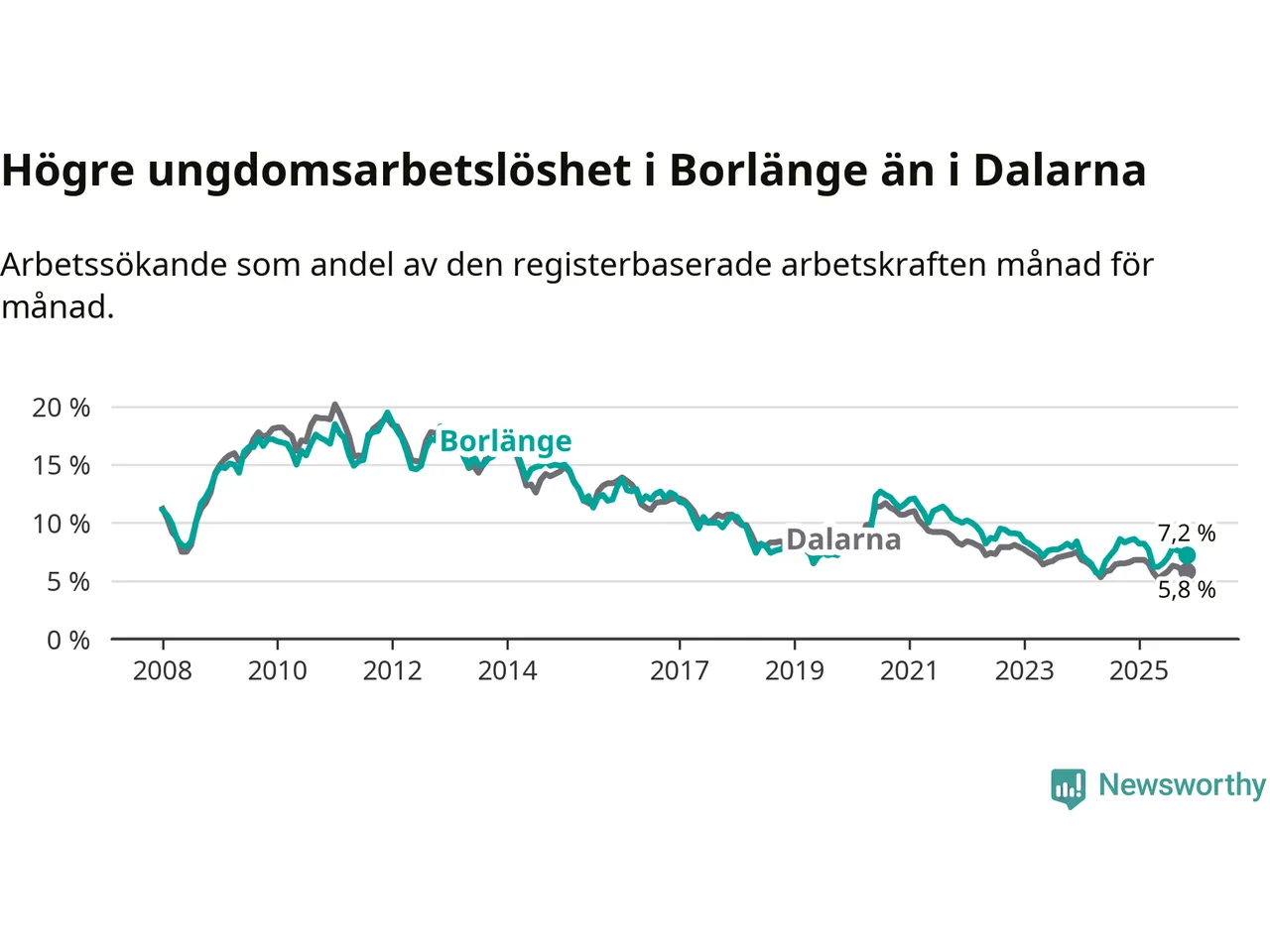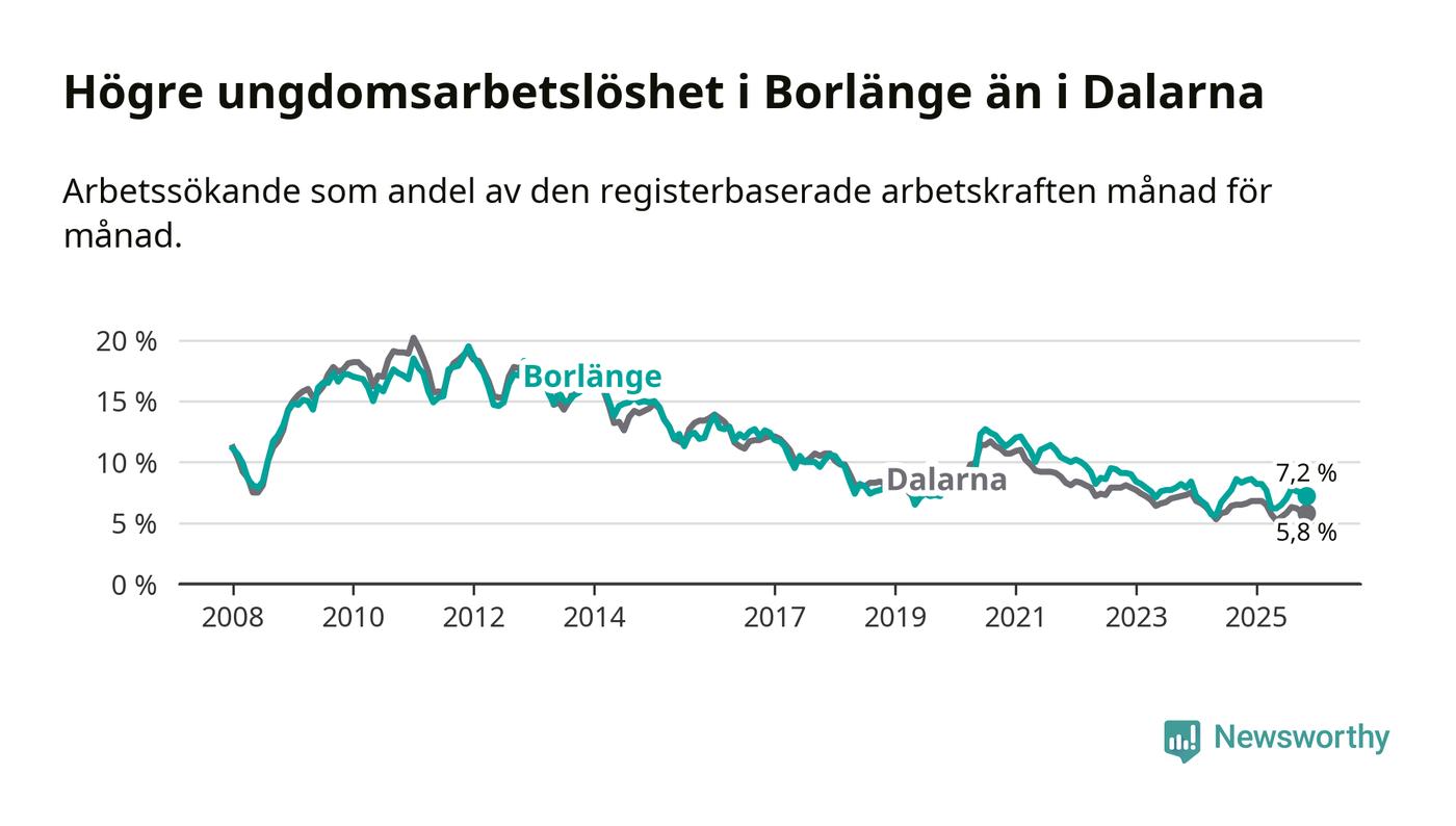 Precis som den totala arbetslösheten ligger ungdomsarbetslösheten i Borlänge högre än i Dalarna som helhet. Skillnaden mellan kommunen och länet är 1,4 procentenheter.