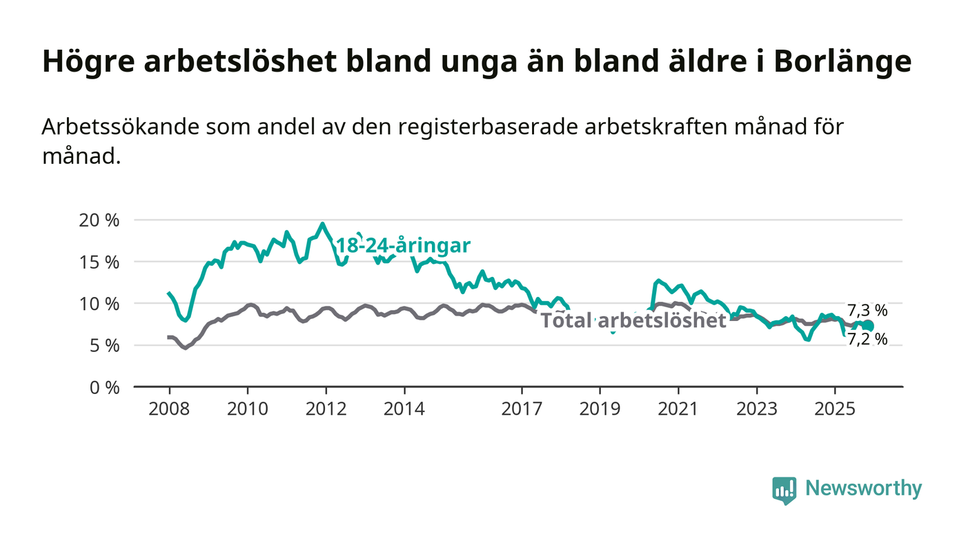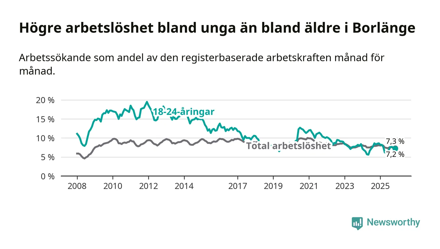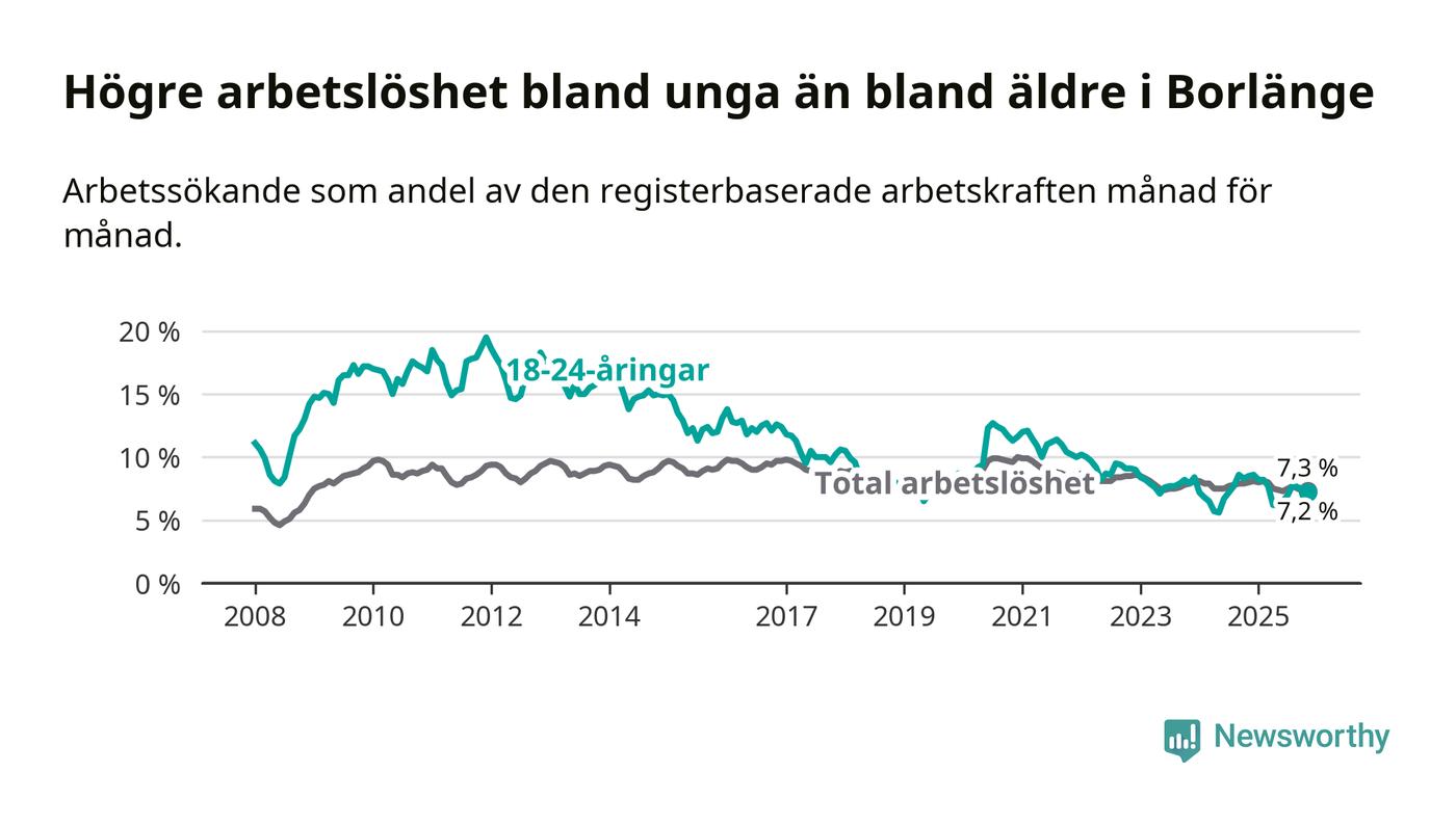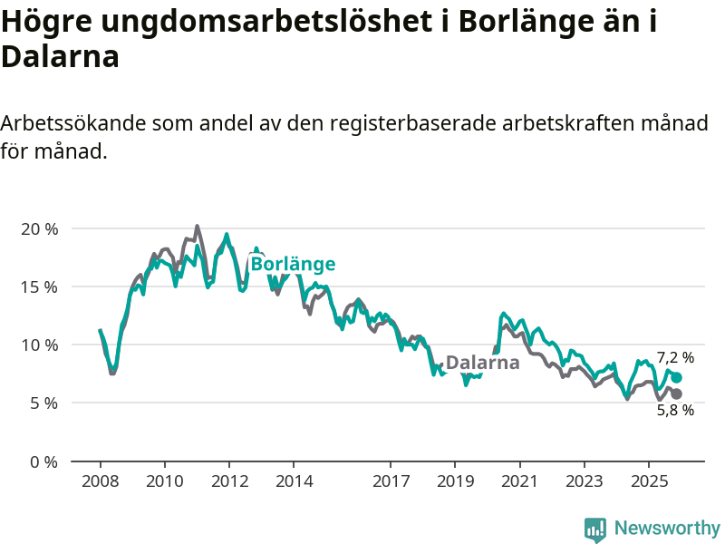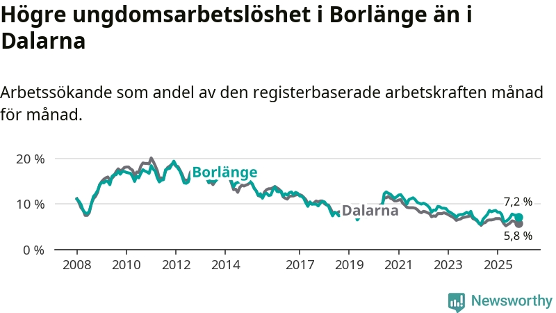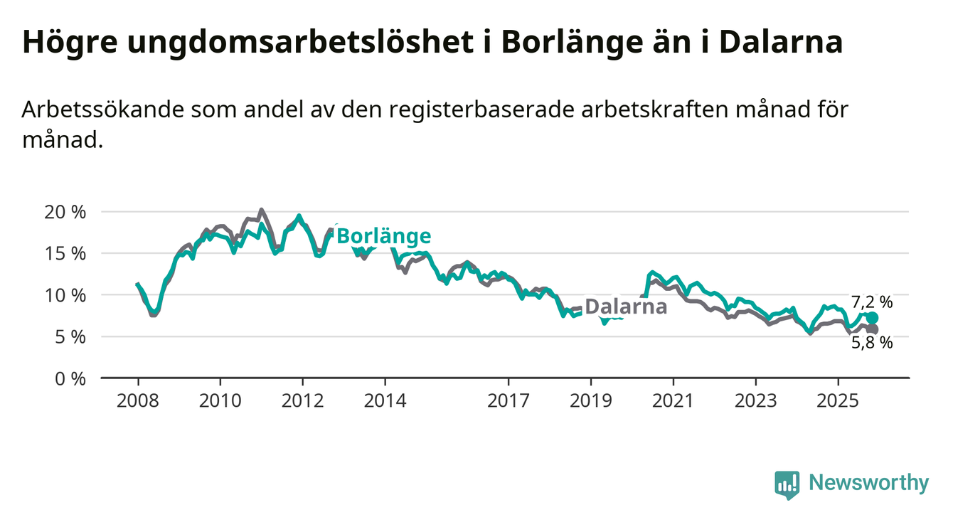 Precis som den totala arbetslösheten ligger ungdomsarbetslösheten i Borlänge högre än i Dalarna som helhet. Skillnaden mellan kommunen och länet är 1,4 procentenheter.