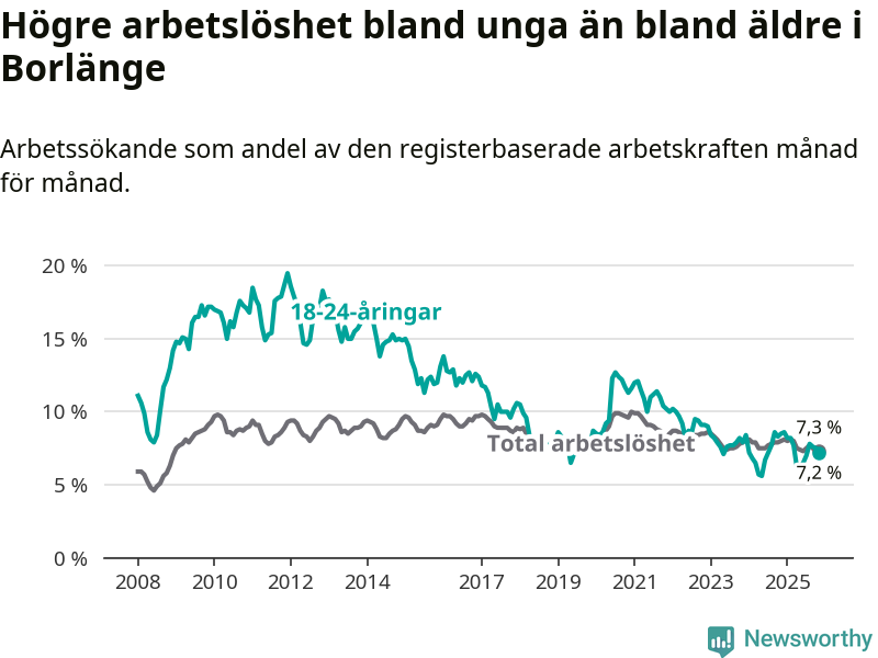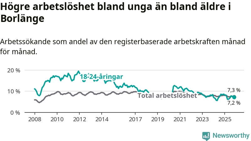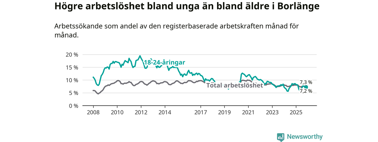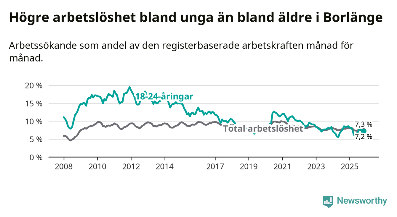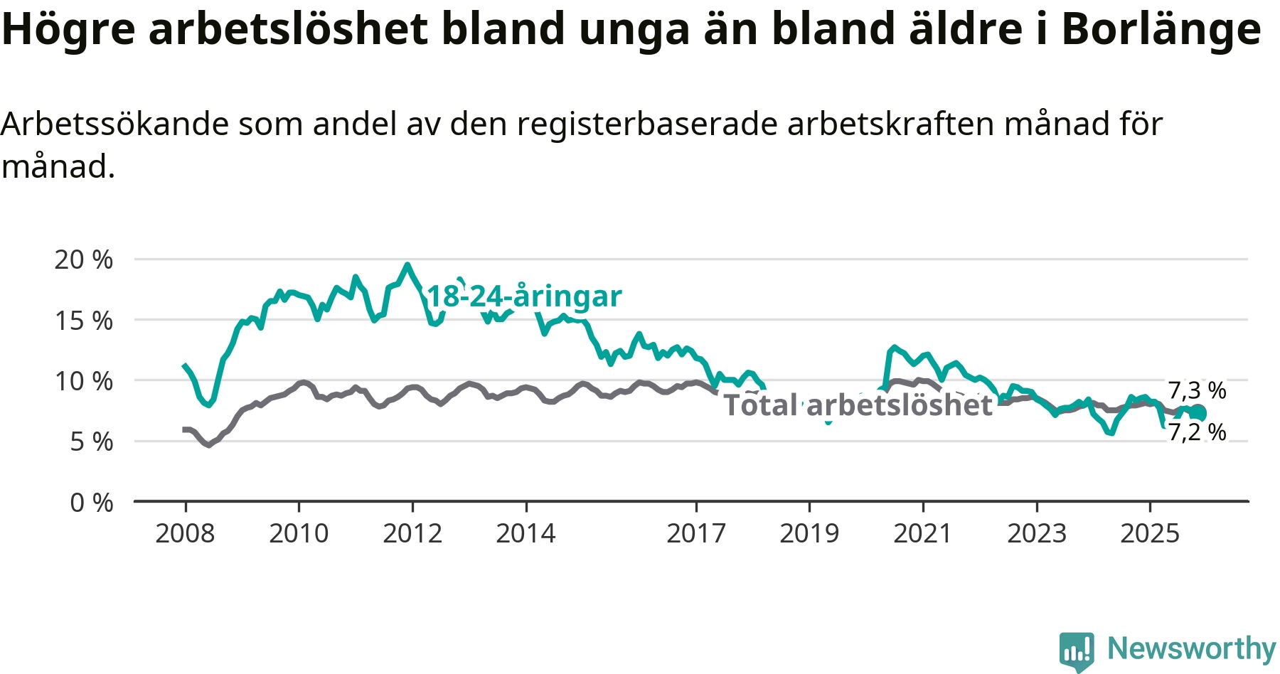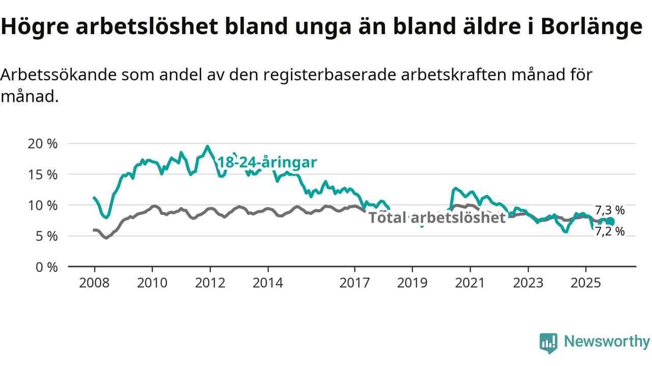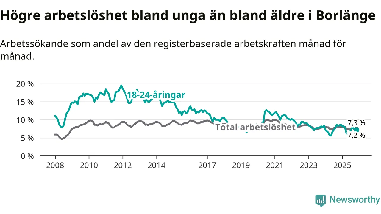 Precis som den totala arbetslösheten ligger ungdomsarbetslösheten i Borlänge högre än i Dalarna som helhet. Skillnaden mellan kommunen och länet är 1,4 procentenheter.