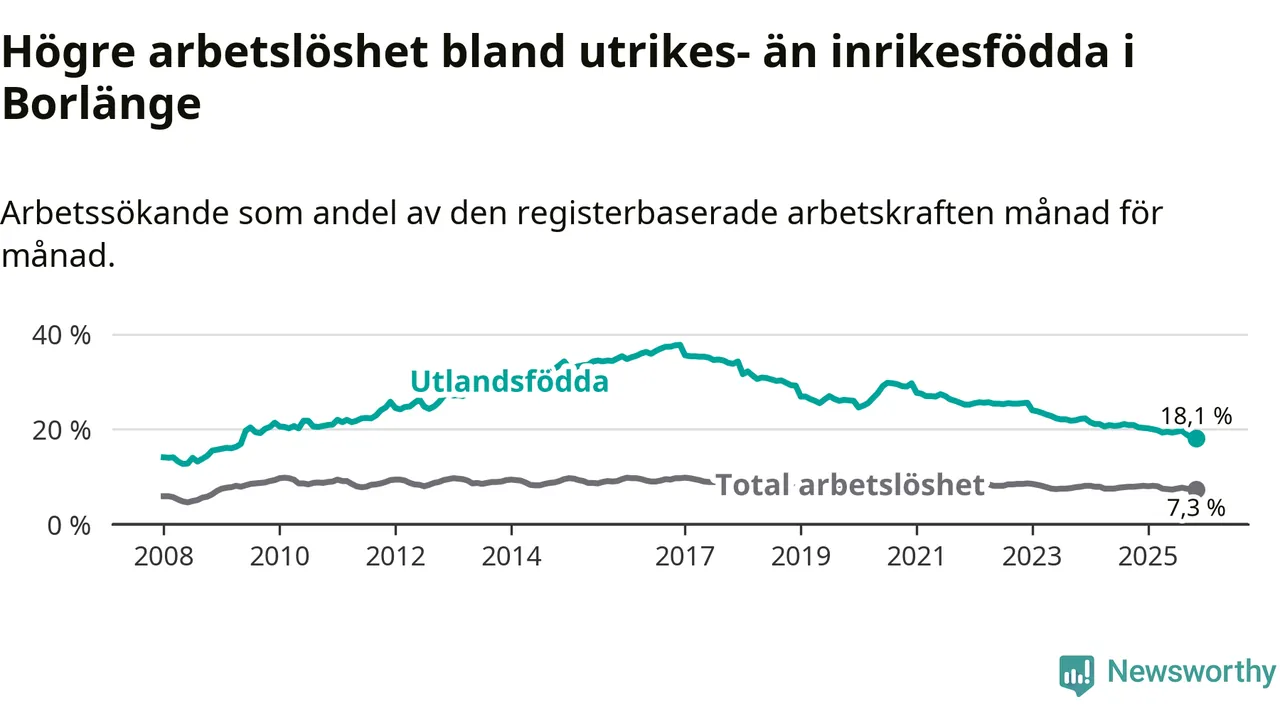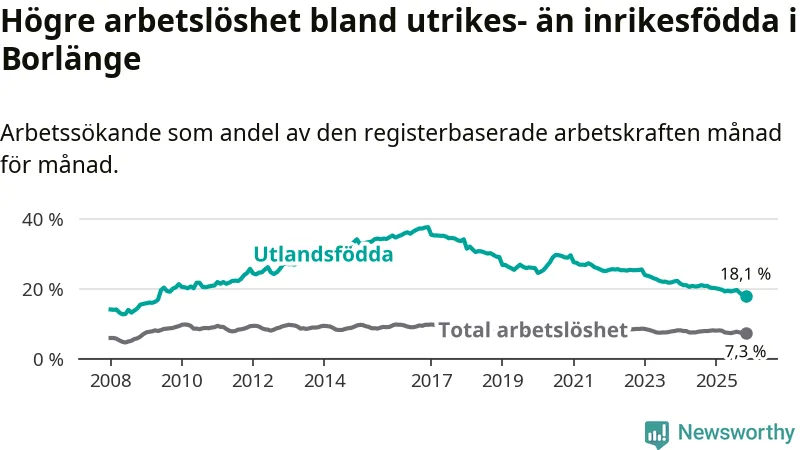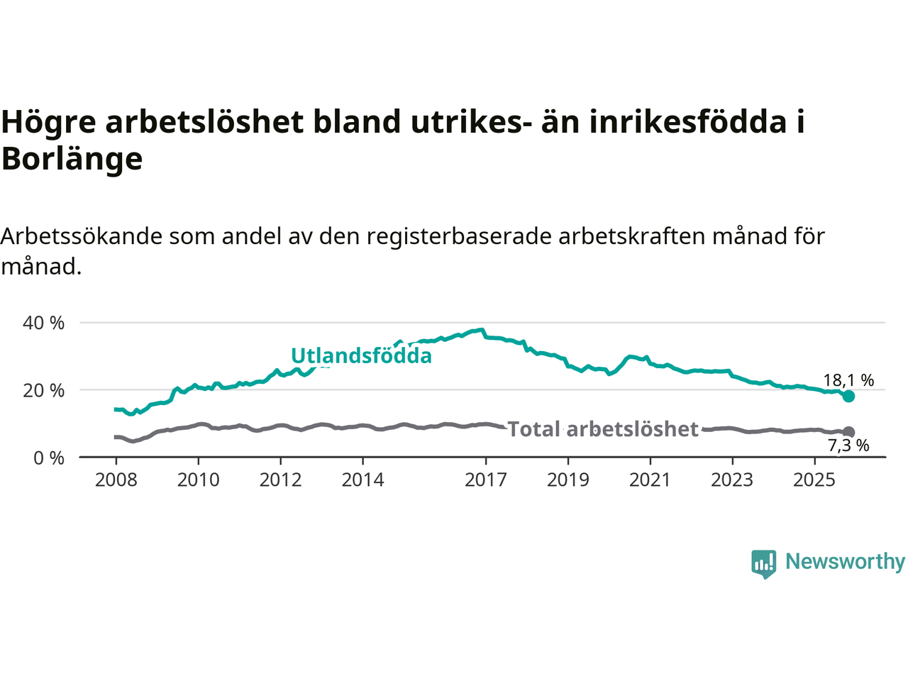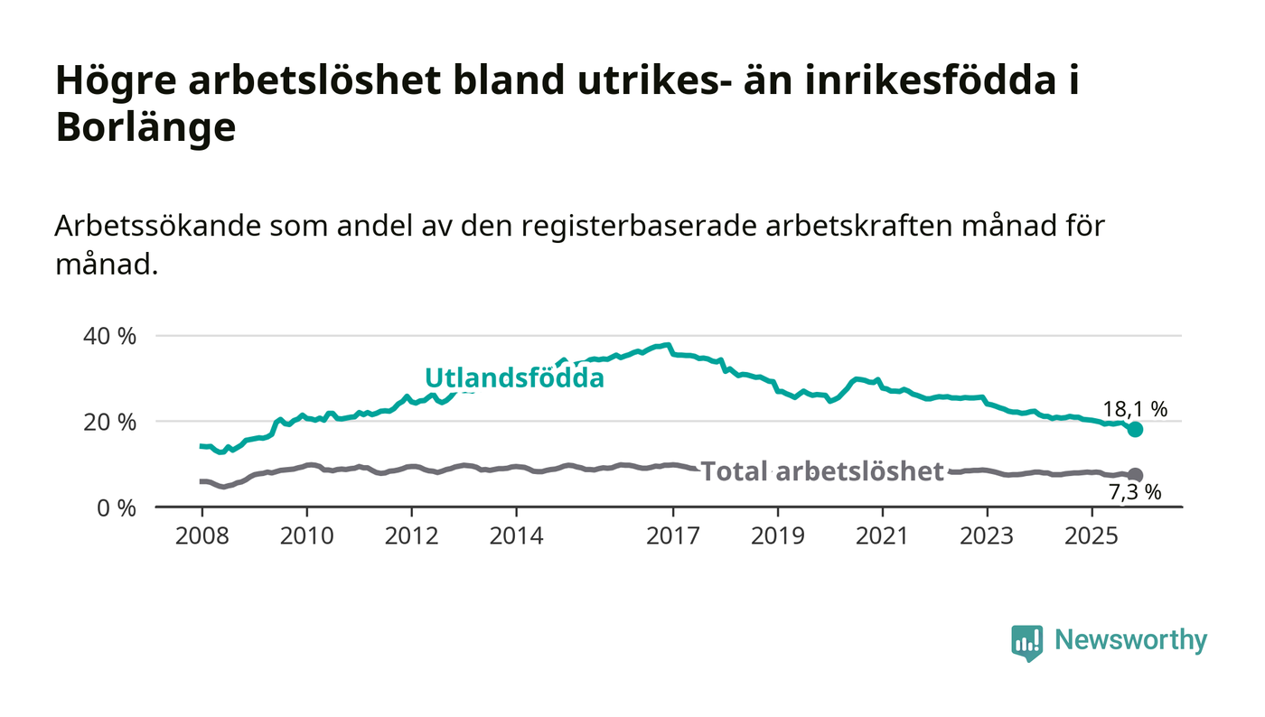 Arbetslösheten bland utlandsfödda var 18,1 procent i Borlänge under november månad, motsvarande 1 014 av 5 602 personer. Det är 2,3 procentenheter färre än vid samma tidpunkt i fjol (−127 om man räknar personer). Därmed har de utlandsföddas arbetslöshet varit lägre än vid samma tidpunkt i fjol i över två år i sträck. Sedan december 2022 har arbetslösheten bland utlandsfödda minskat från 25,6 till 18,1 procent. Den nuvarande arbetslöshetsnivån är den lägsta sedan maj 2009.