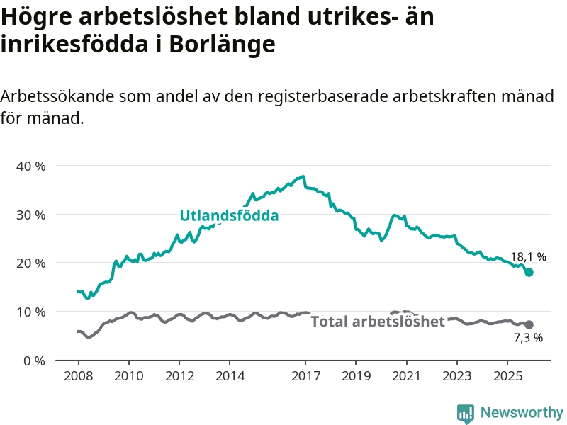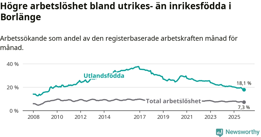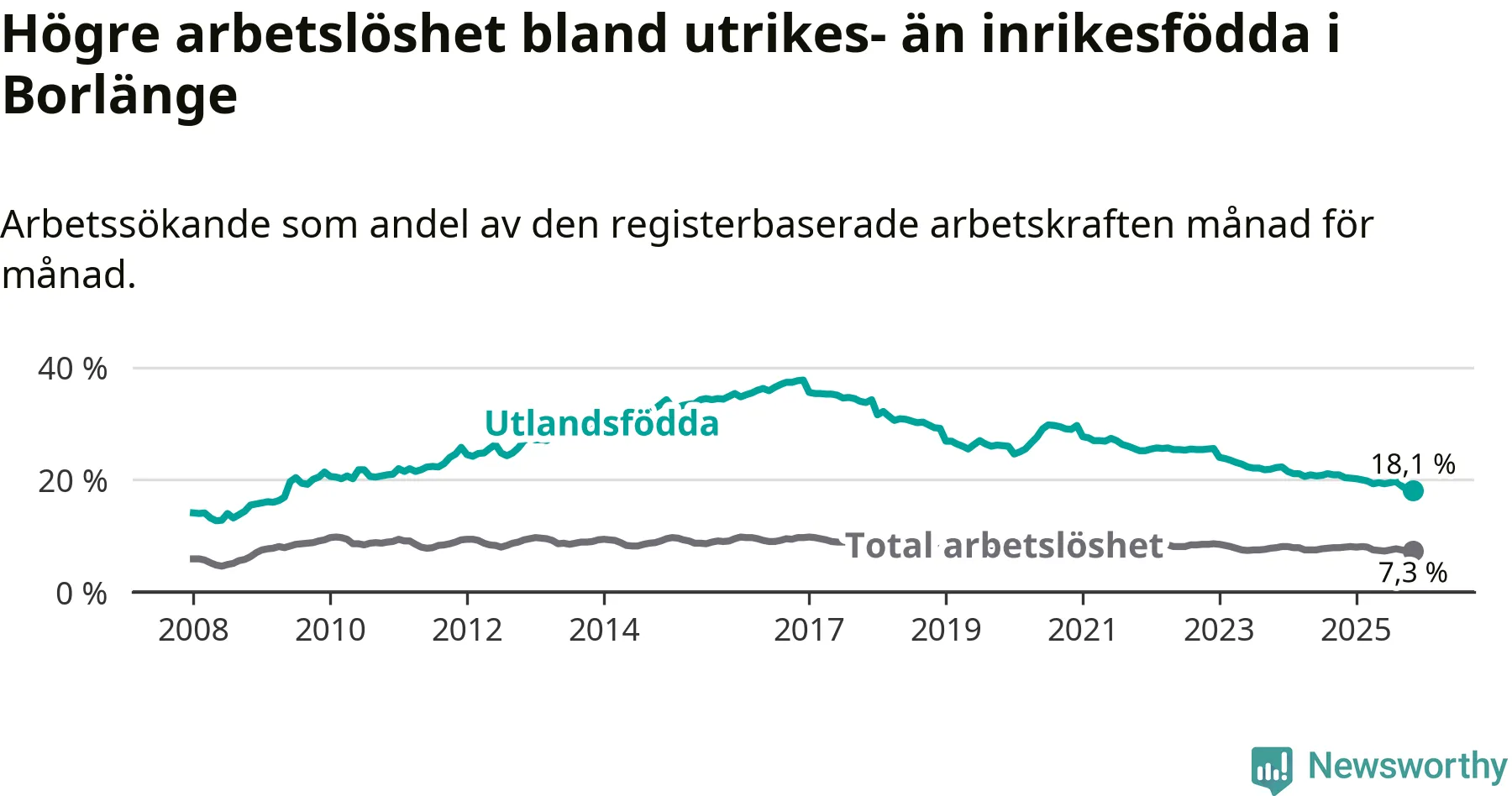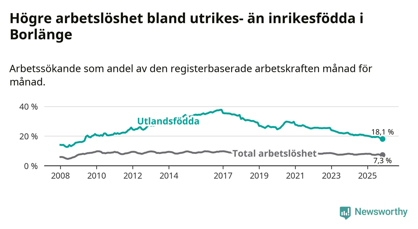 Arbetslösheten bland utlandsfödda var 18,1 procent i Borlänge under november månad, motsvarande 1 014 av 5 602 personer. Det är 2,3 procentenheter färre än vid samma tidpunkt i fjol (−127 om man räknar personer). Därmed har de utlandsföddas arbetslöshet varit lägre än vid samma tidpunkt i fjol i över två år i sträck. Sedan december 2022 har arbetslösheten bland utlandsfödda minskat från 25,6 till 18,1 procent. Den nuvarande arbetslöshetsnivån är den lägsta sedan maj 2009.