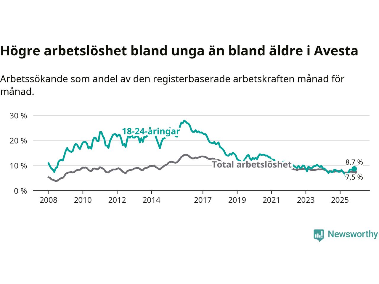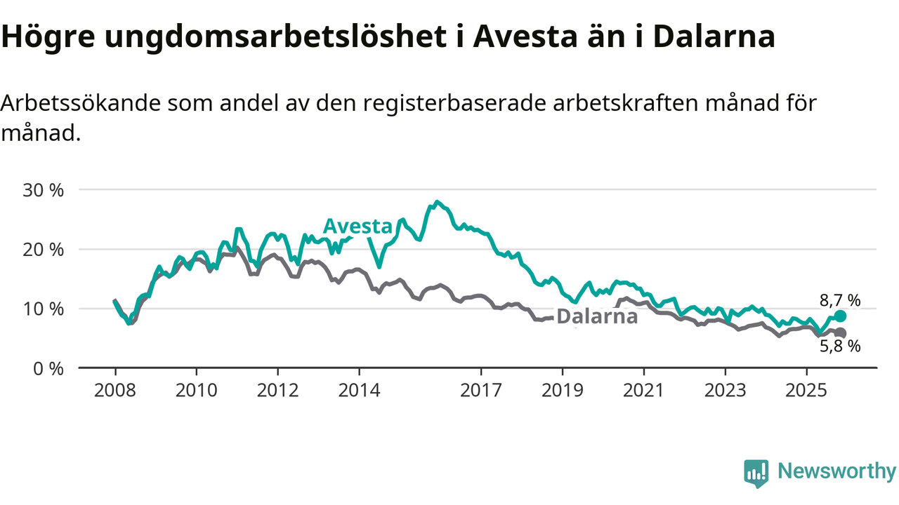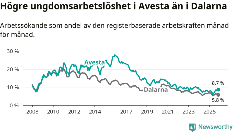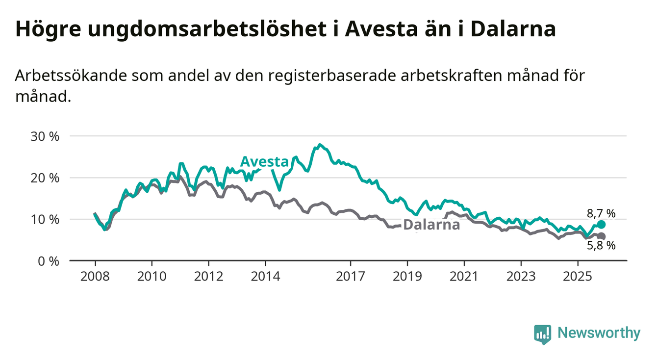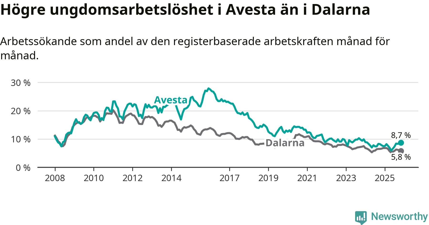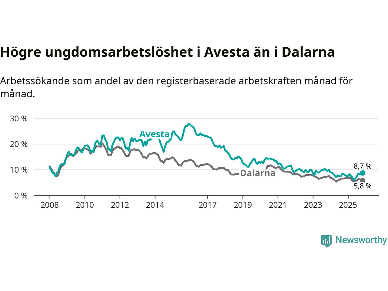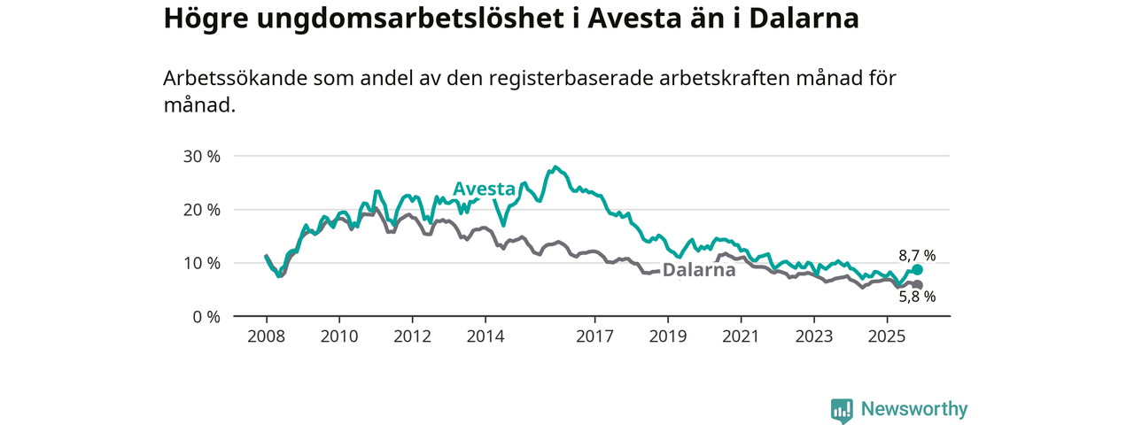 Precis som den totala arbetslösheten ligger ungdomsarbetslösheten i Avesta högre än i Dalarna som helhet. Skillnaden mellan kommunen och länet är 2,9 procentenheter.