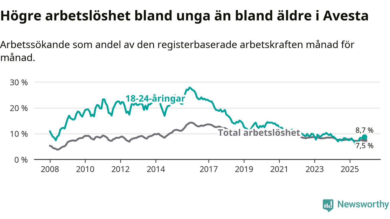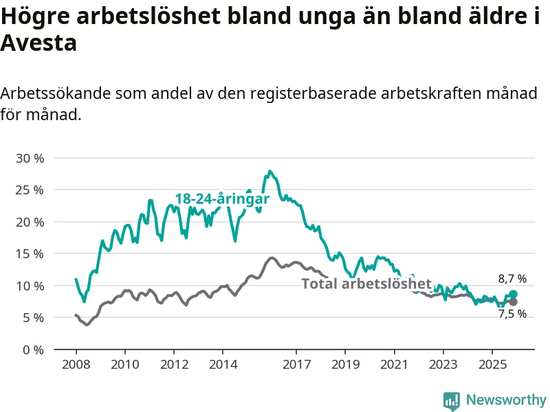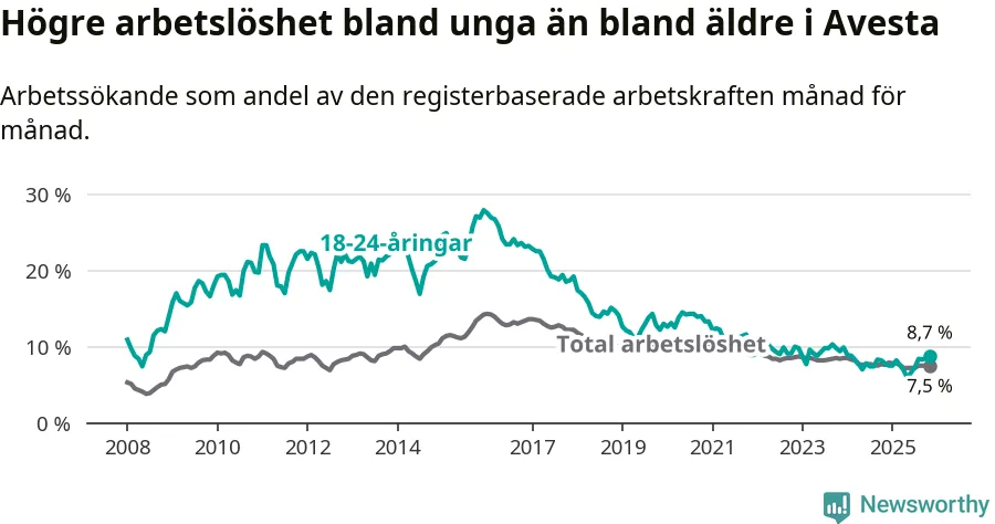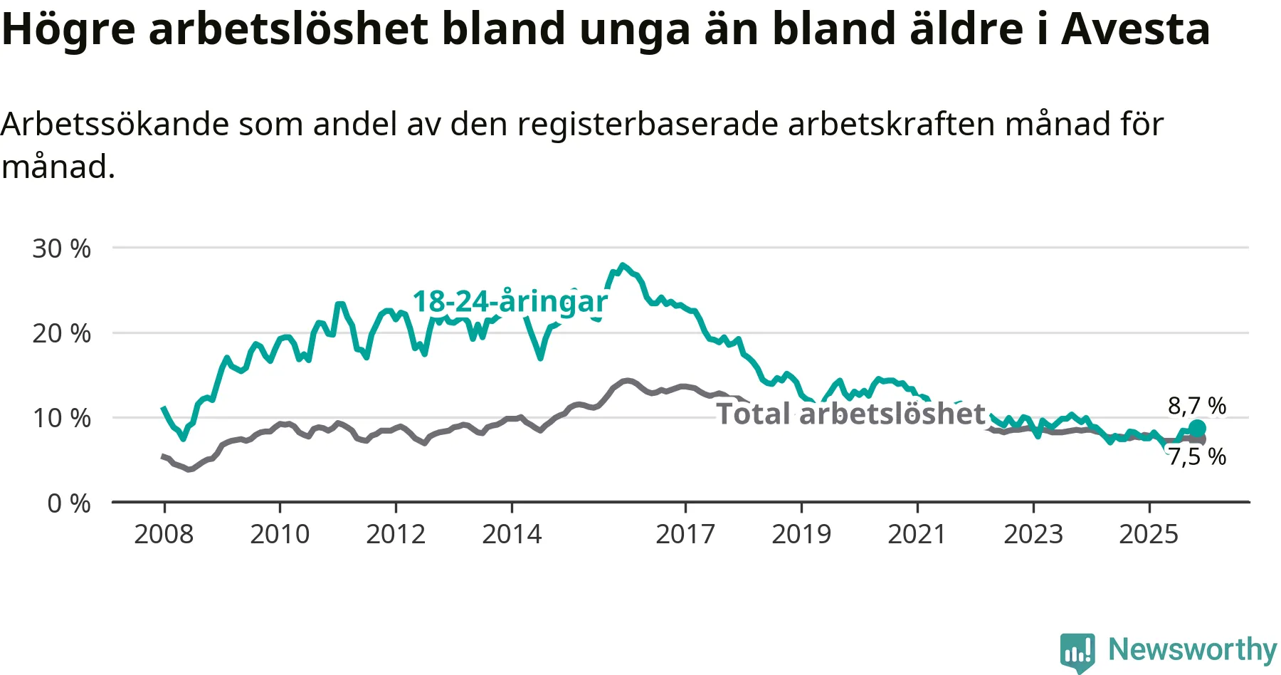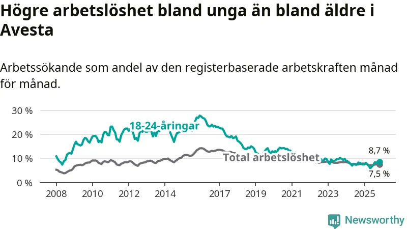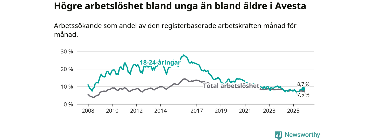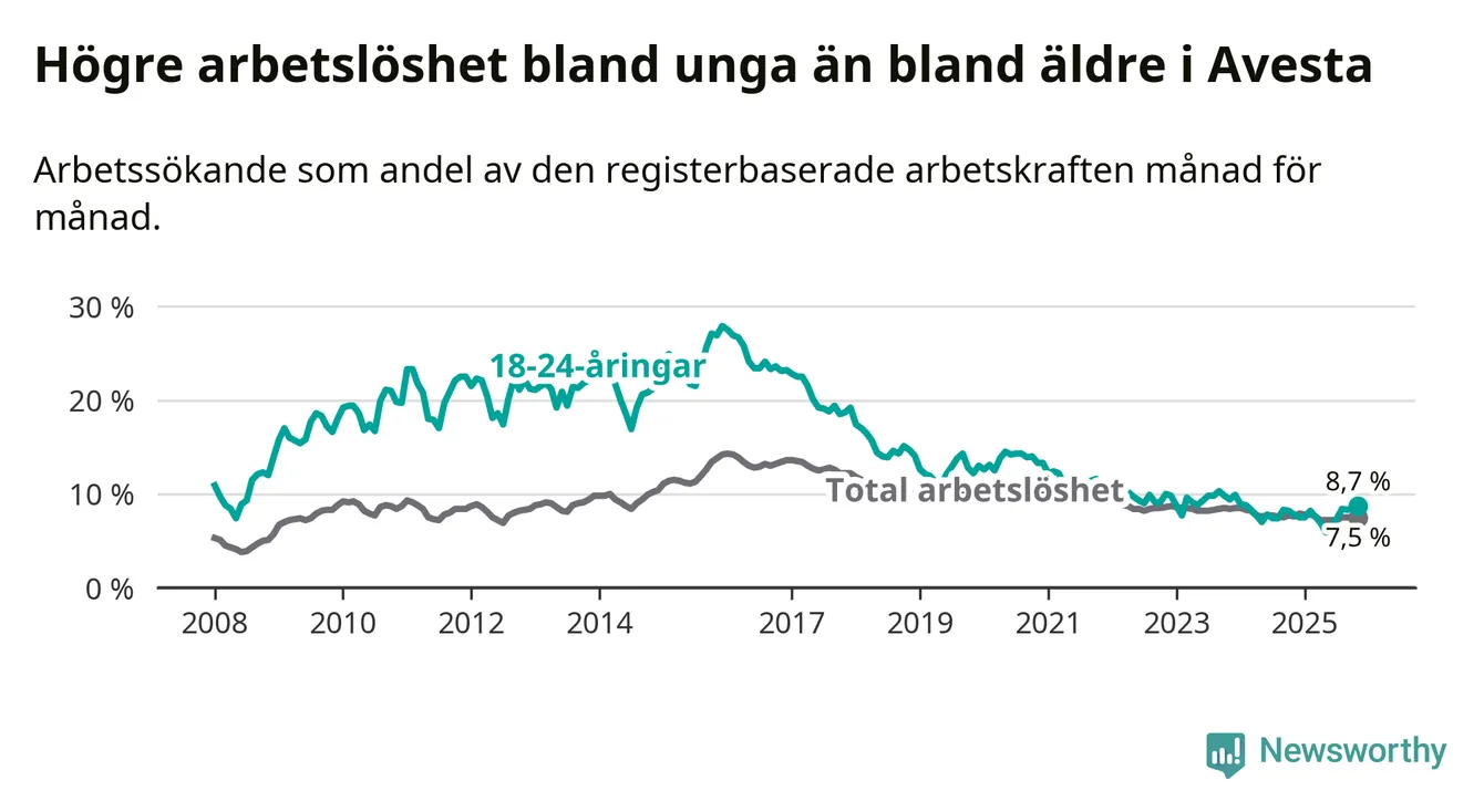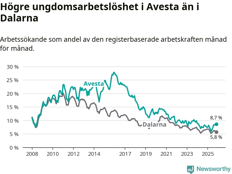 Precis som den totala arbetslösheten ligger ungdomsarbetslösheten i Avesta högre än i Dalarna som helhet. Skillnaden mellan kommunen och länet är 2,9 procentenheter.