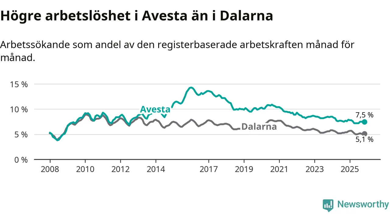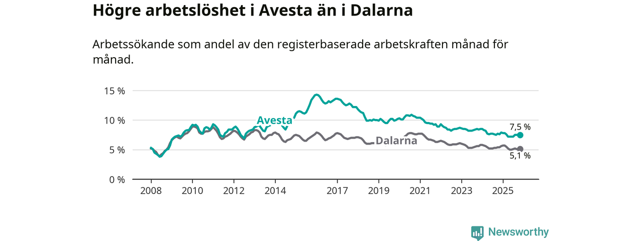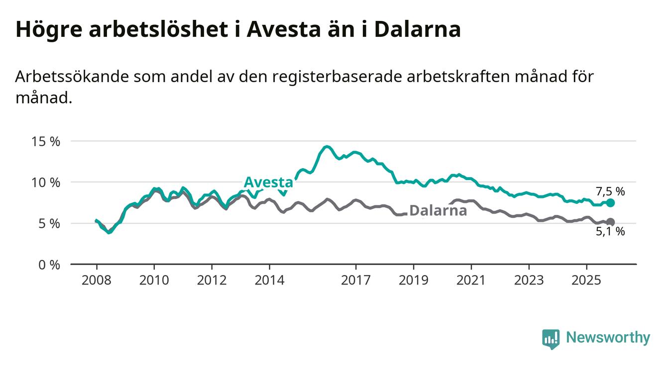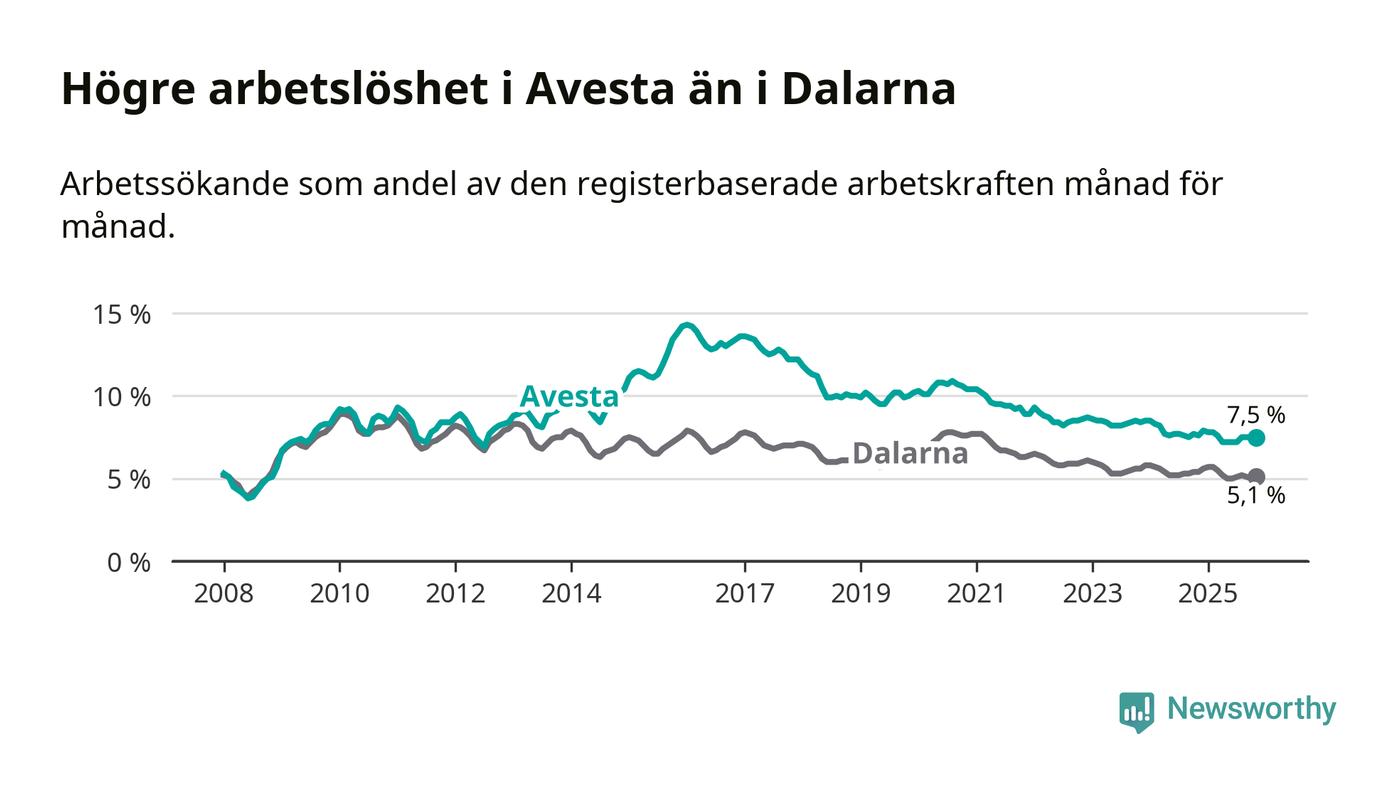 Under november månad rapporterade Avesta kommun en total arbetslöshet på 7,5 procent. Det är en minskning jämfört med samma tidpunkt i fjol (−0,1 procentenheter). Även i Dalarnas län sjunker arbetslösheten .