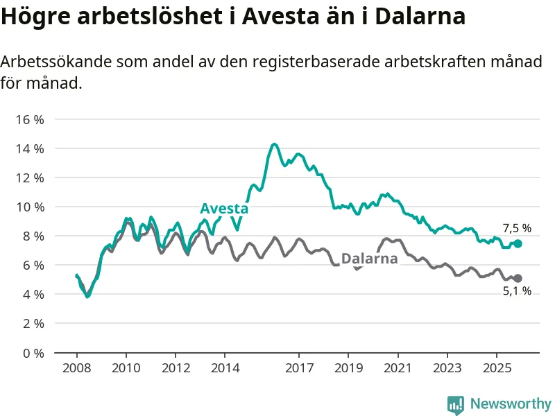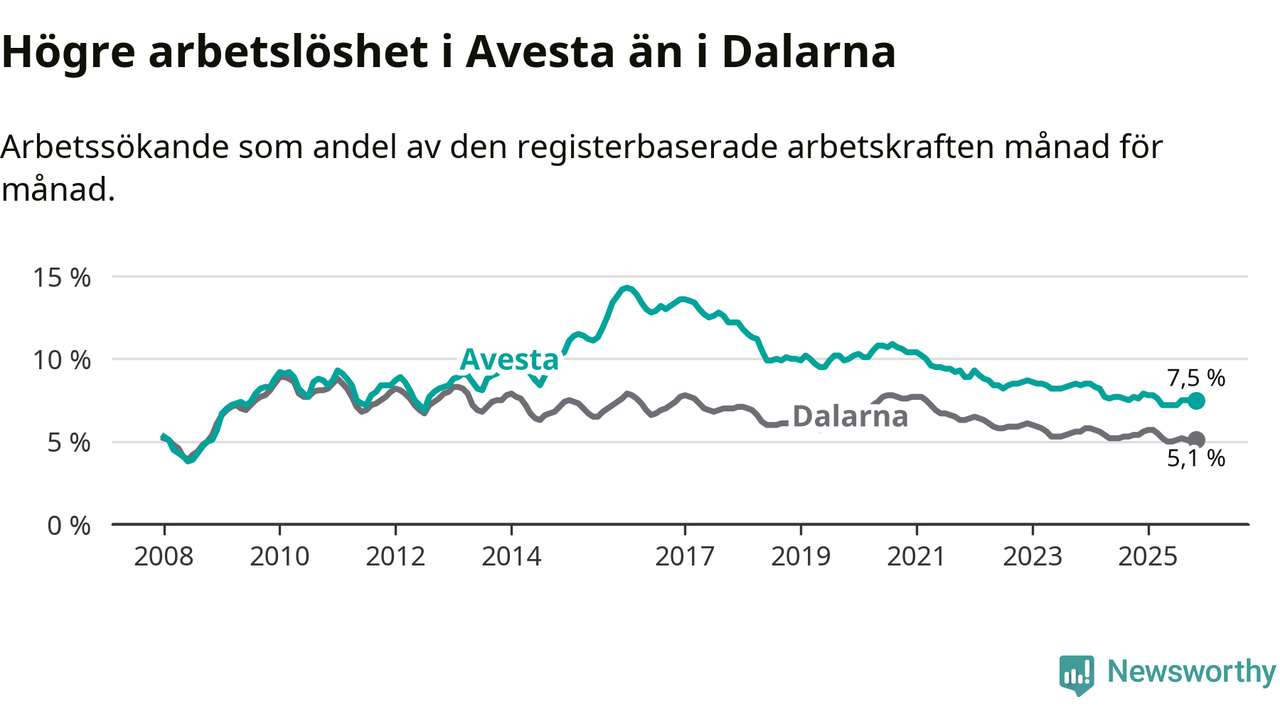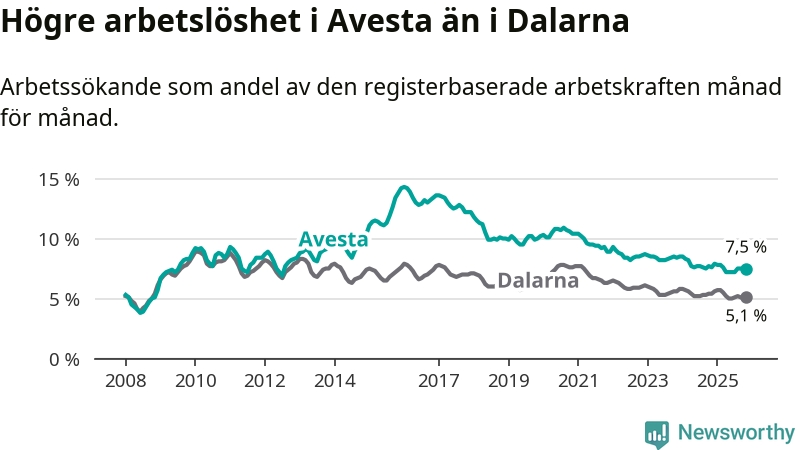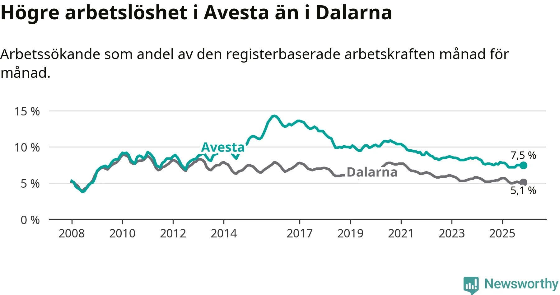 Under november månad rapporterade Avesta kommun en total arbetslöshet på 7,5 procent. Det är en minskning jämfört med samma tidpunkt i fjol (−0,1 procentenheter). Även i Dalarnas län sjunker arbetslösheten .
