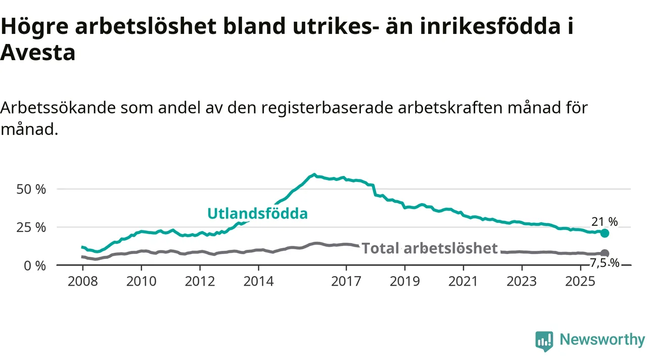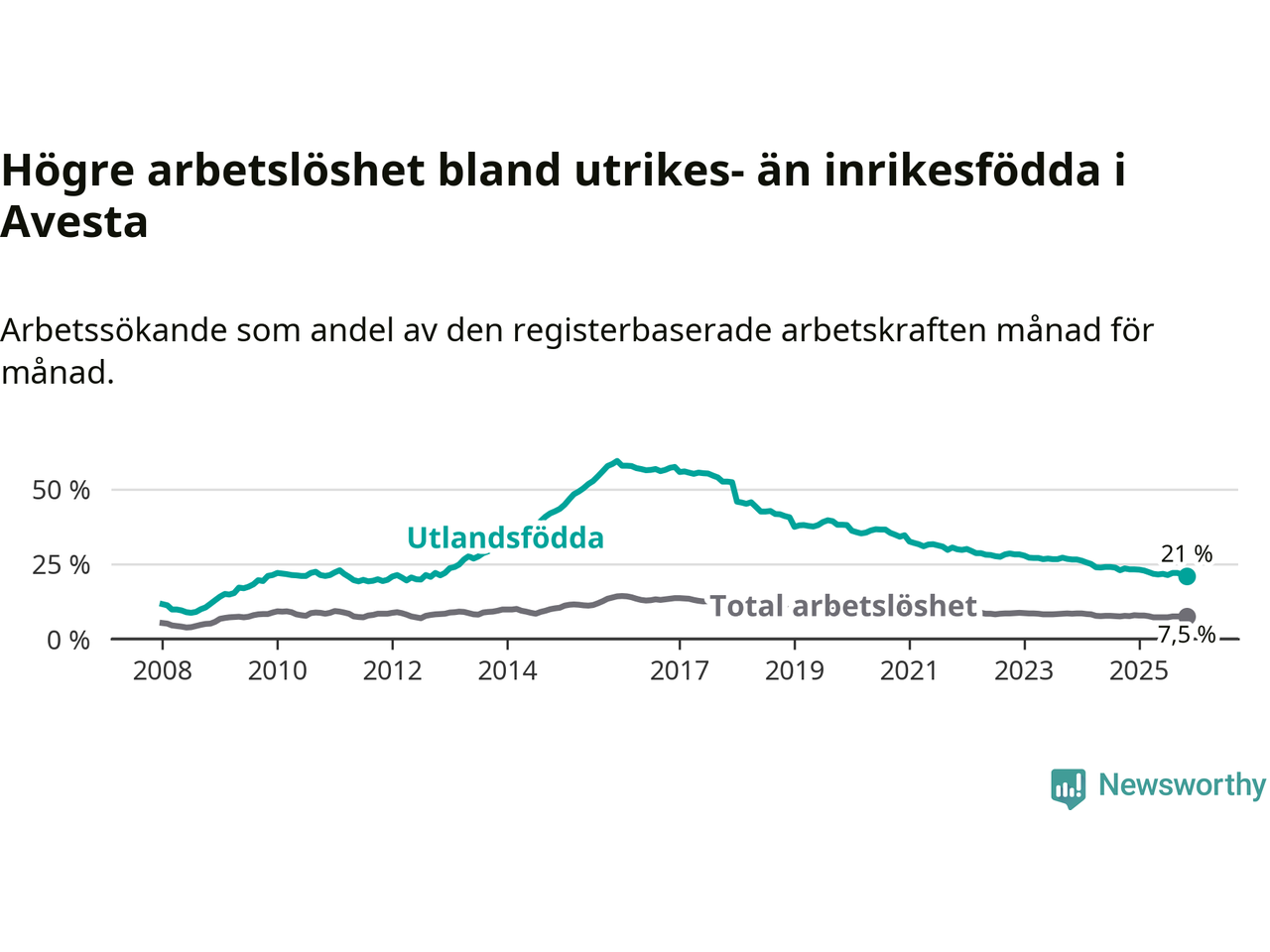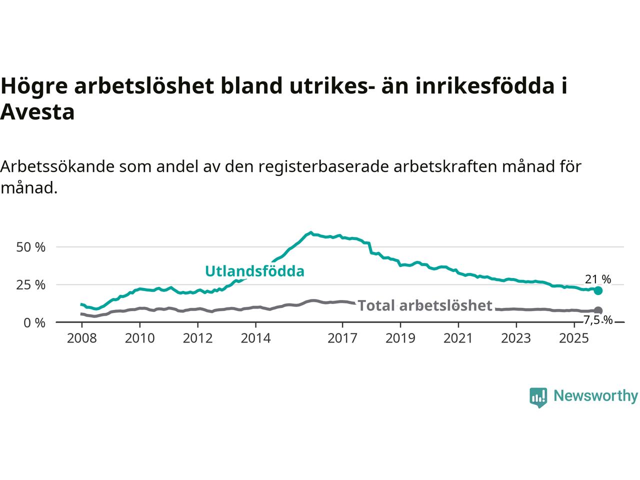 Skillnaden i arbetslöshet mellan utrikesfödda och hela befolkningen är 13,5 procentenheter i Avesta. Det är en betydligt mindre skillnad än för ett år sedan (−2,1 procentenheter).