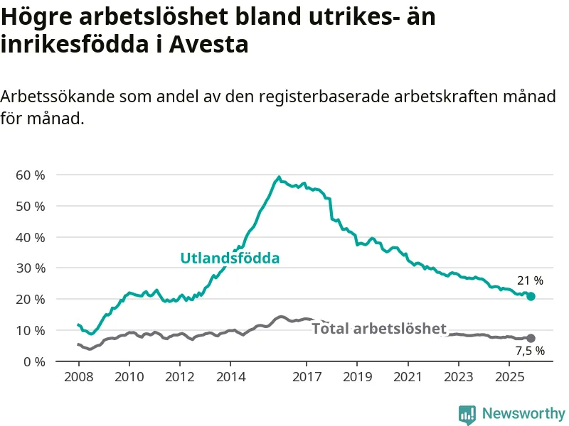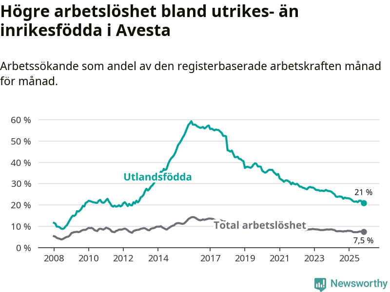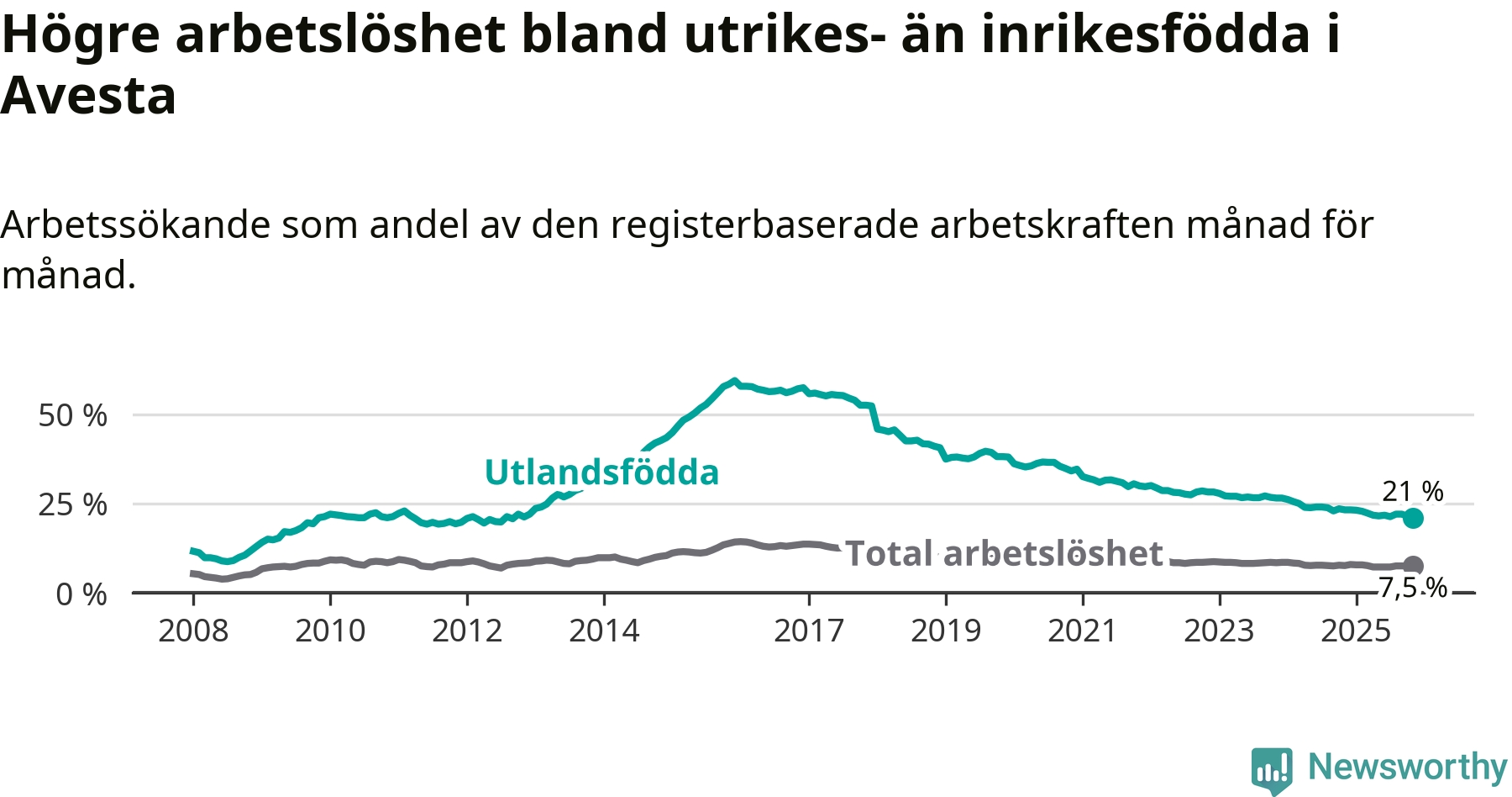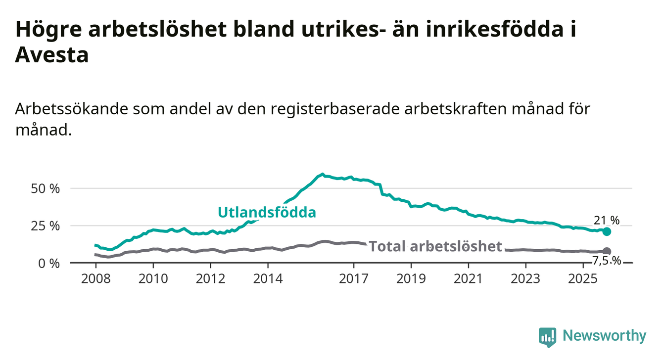 Skillnaden i arbetslöshet mellan utrikesfödda och hela befolkningen är 13,5 procentenheter i Avesta. Det är en betydligt mindre skillnad än för ett år sedan (−2,1 procentenheter).