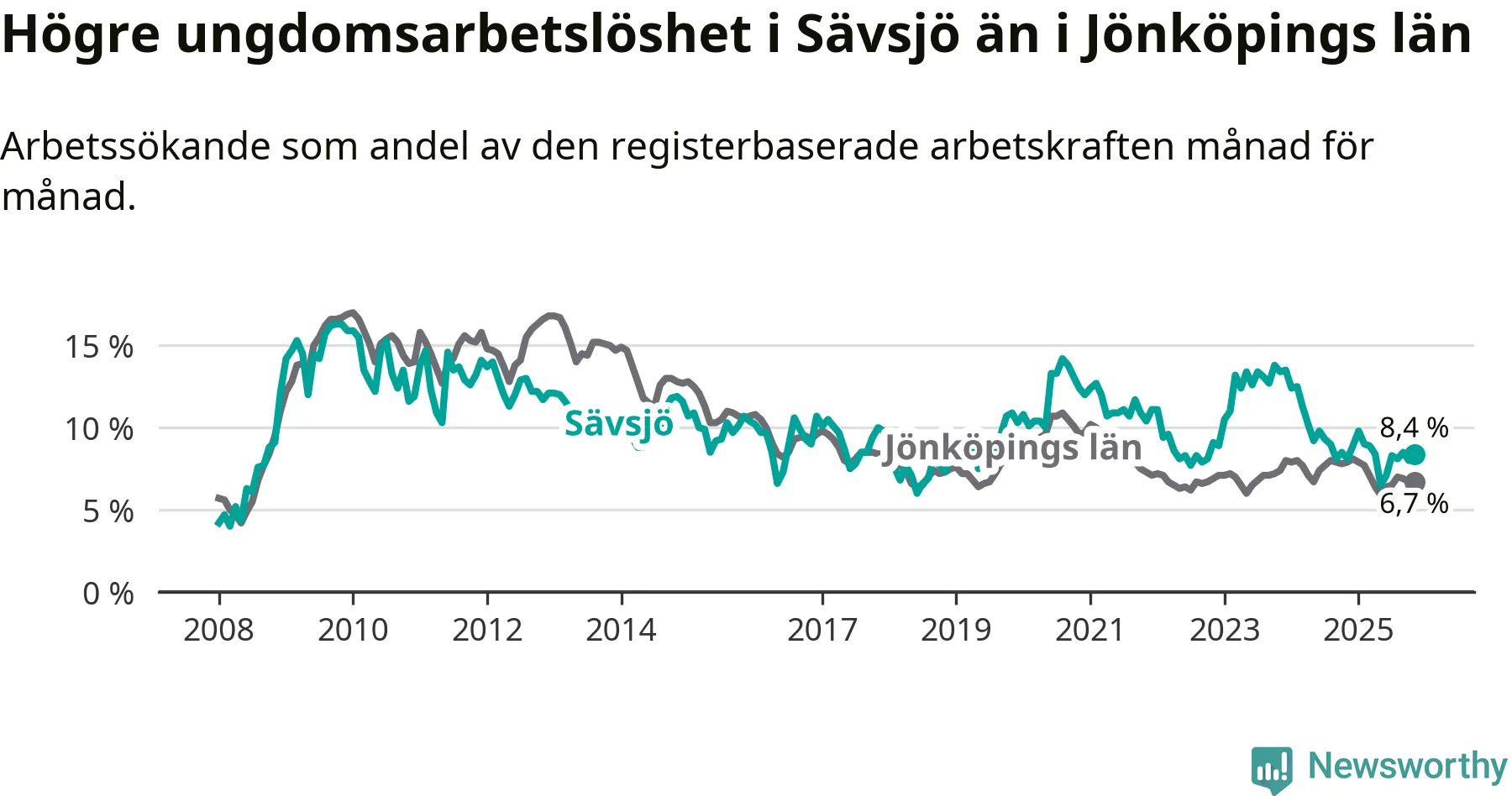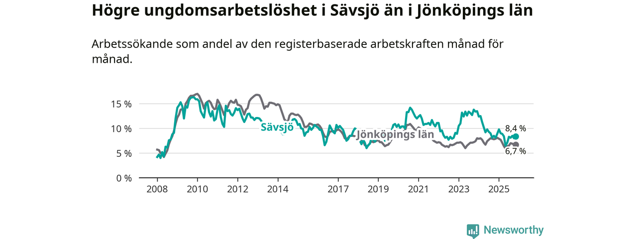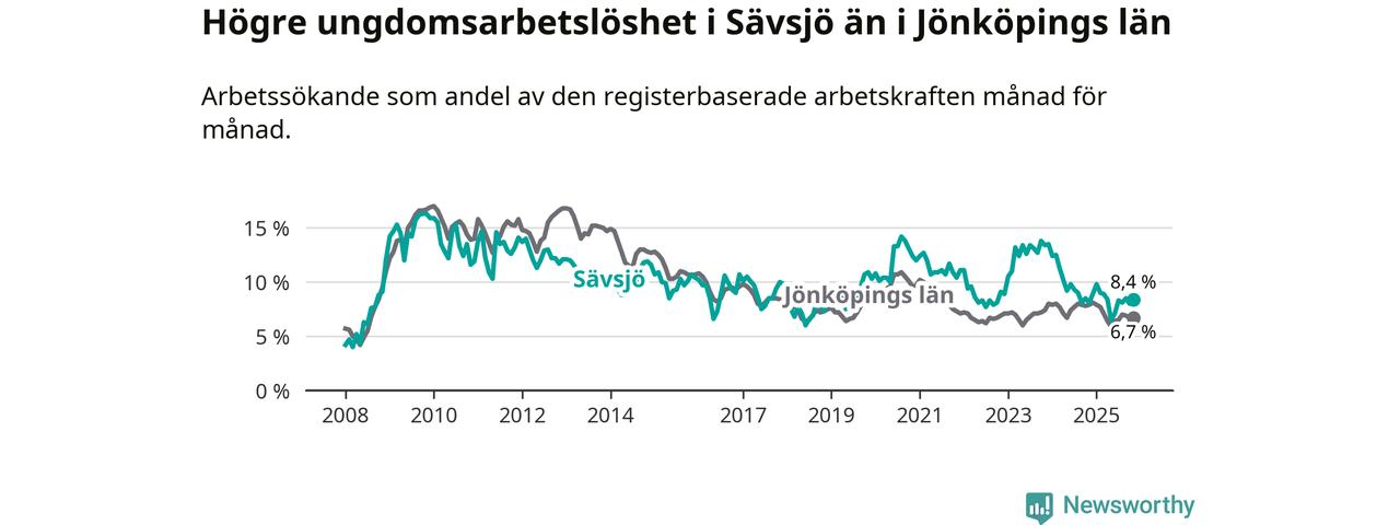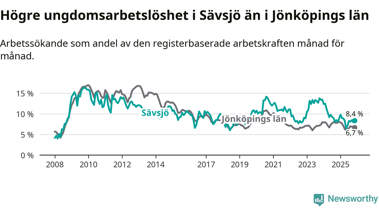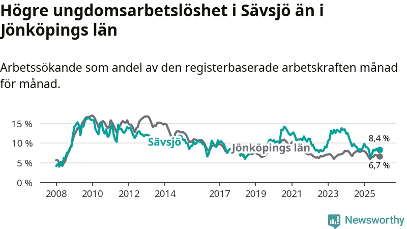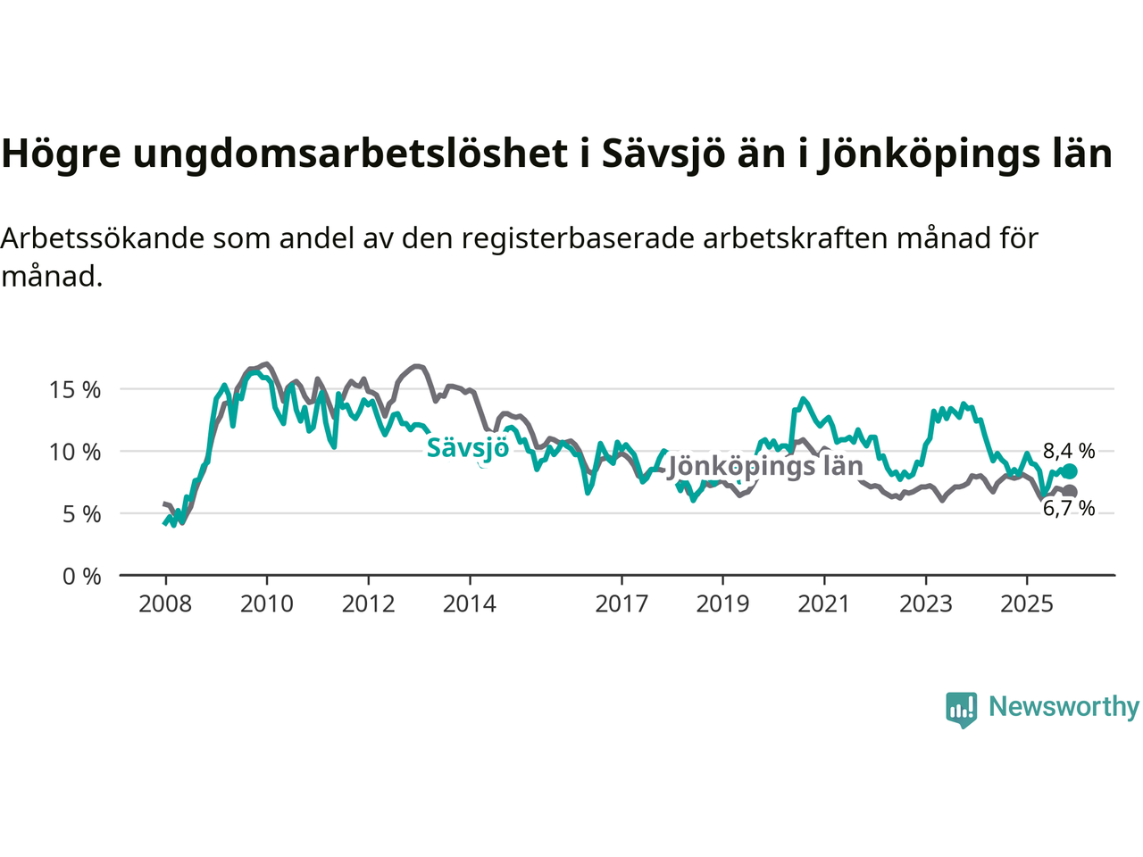 Precis som den totala arbetslösheten ligger ungdomsarbetslösheten i Sävsjö högre än i Jönköpings län som helhet. Skillnaden mellan kommunen och länet är 1,7 procentenheter.