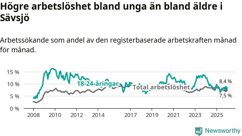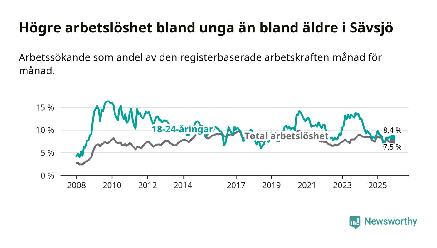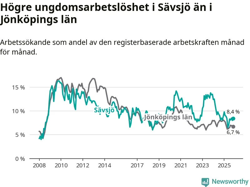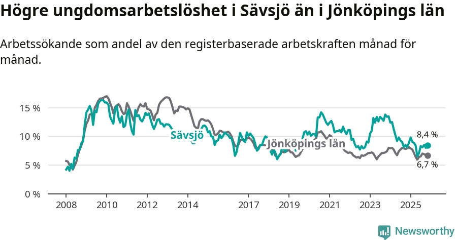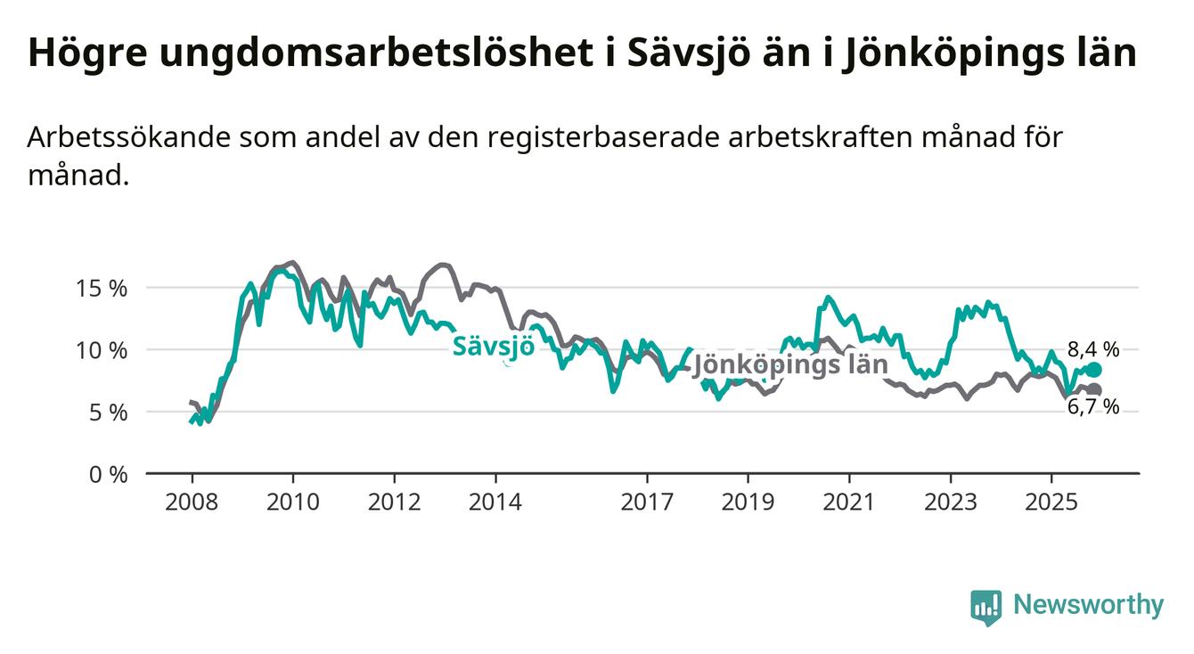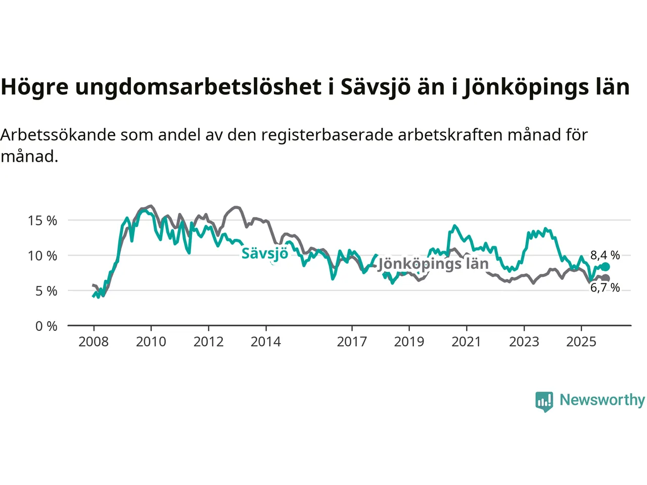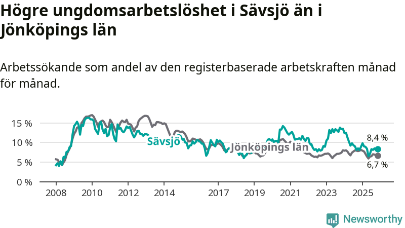 Precis som den totala arbetslösheten ligger ungdomsarbetslösheten i Sävsjö högre än i Jönköpings län som helhet. Skillnaden mellan kommunen och länet är 1,7 procentenheter.